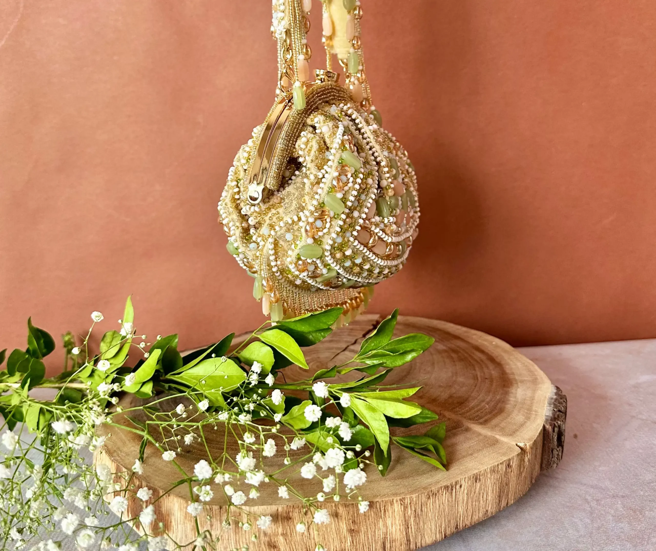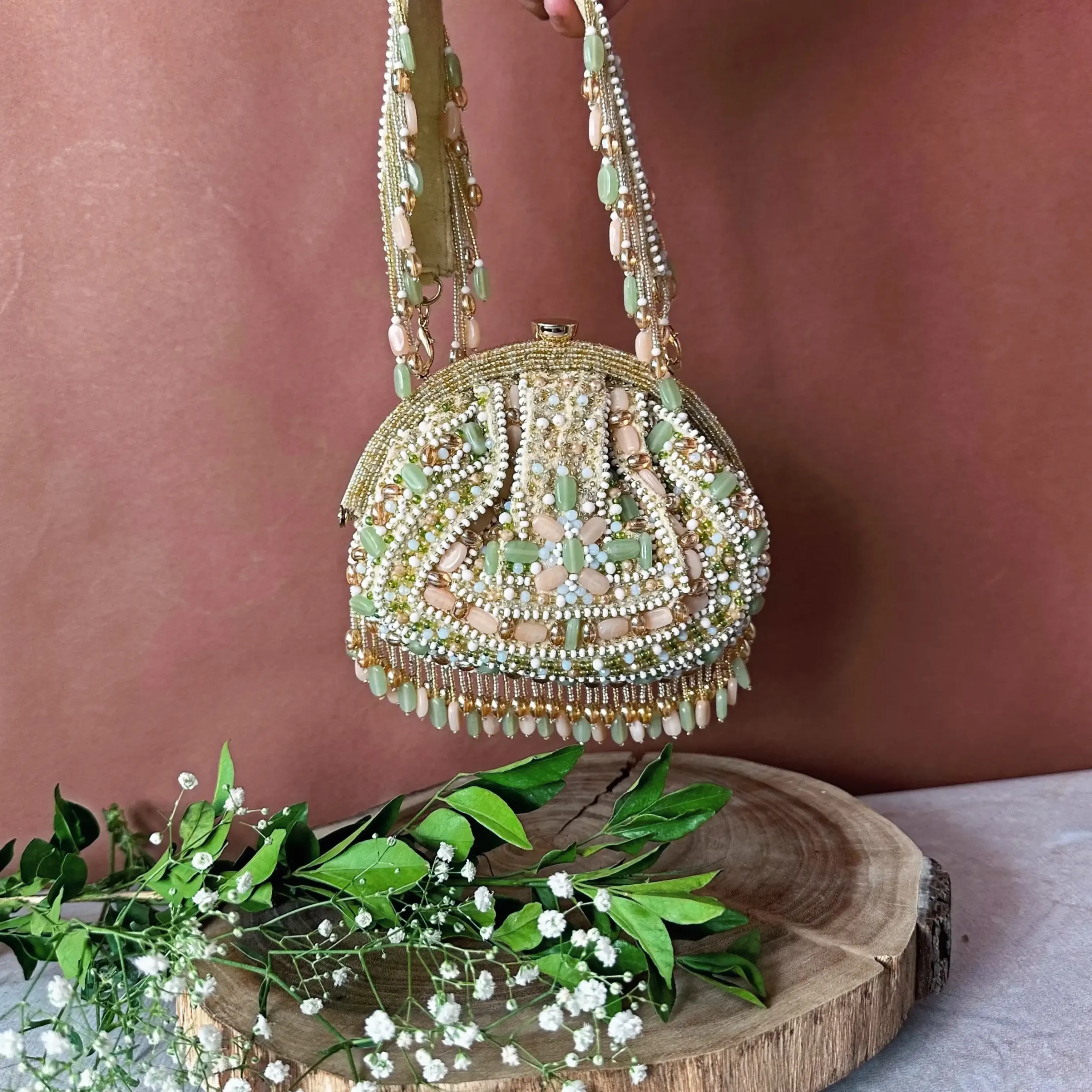 Style this pastel beaded clutch with pastel lehengas, embroidered sarees, or chic Indo-western outfits for weddings and celebrations. Pair it with delicate jewelry, embellished heels, and soft glam makeup to highlight the intricate beadwork and elegant beaded handle for a graceful, sophisticated look.