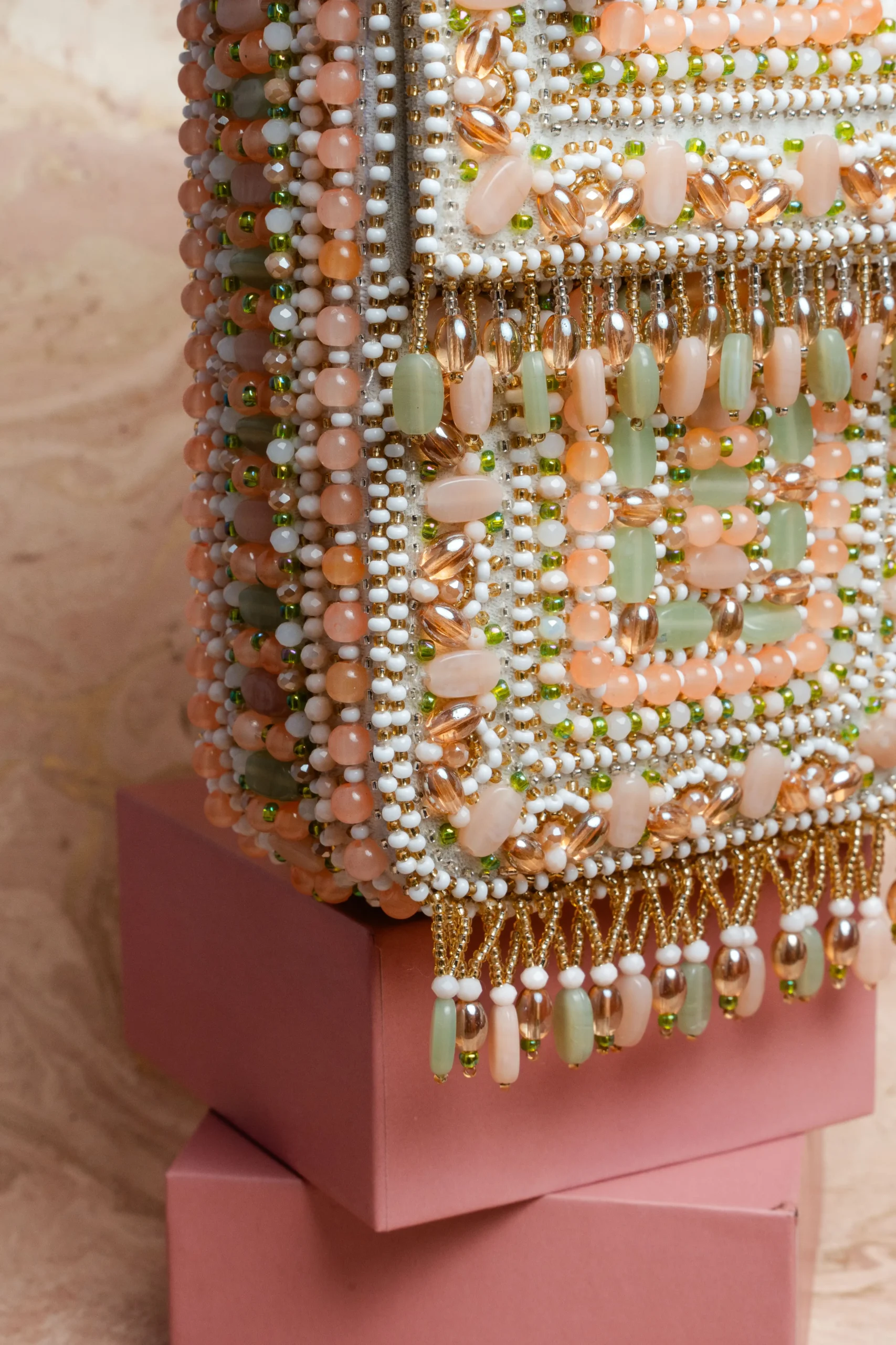 Introducing the Pastel Beaded Studded Box Clutch with Elegant Beaded Handle, a chic statement accessory adorned with delicate pastel beadwork. The structured box silhouette paired with a beautifully beaded handle creates a refined and eye-catching design, perfect for weddings, festive celebrations, and elegant evening occasions.