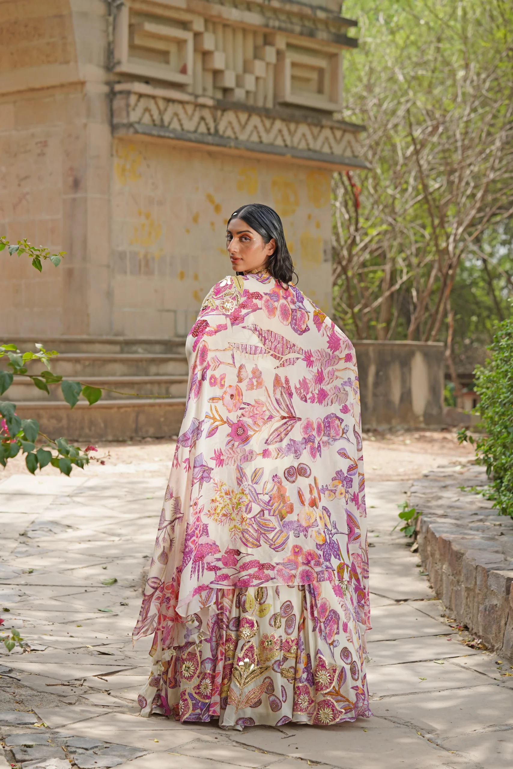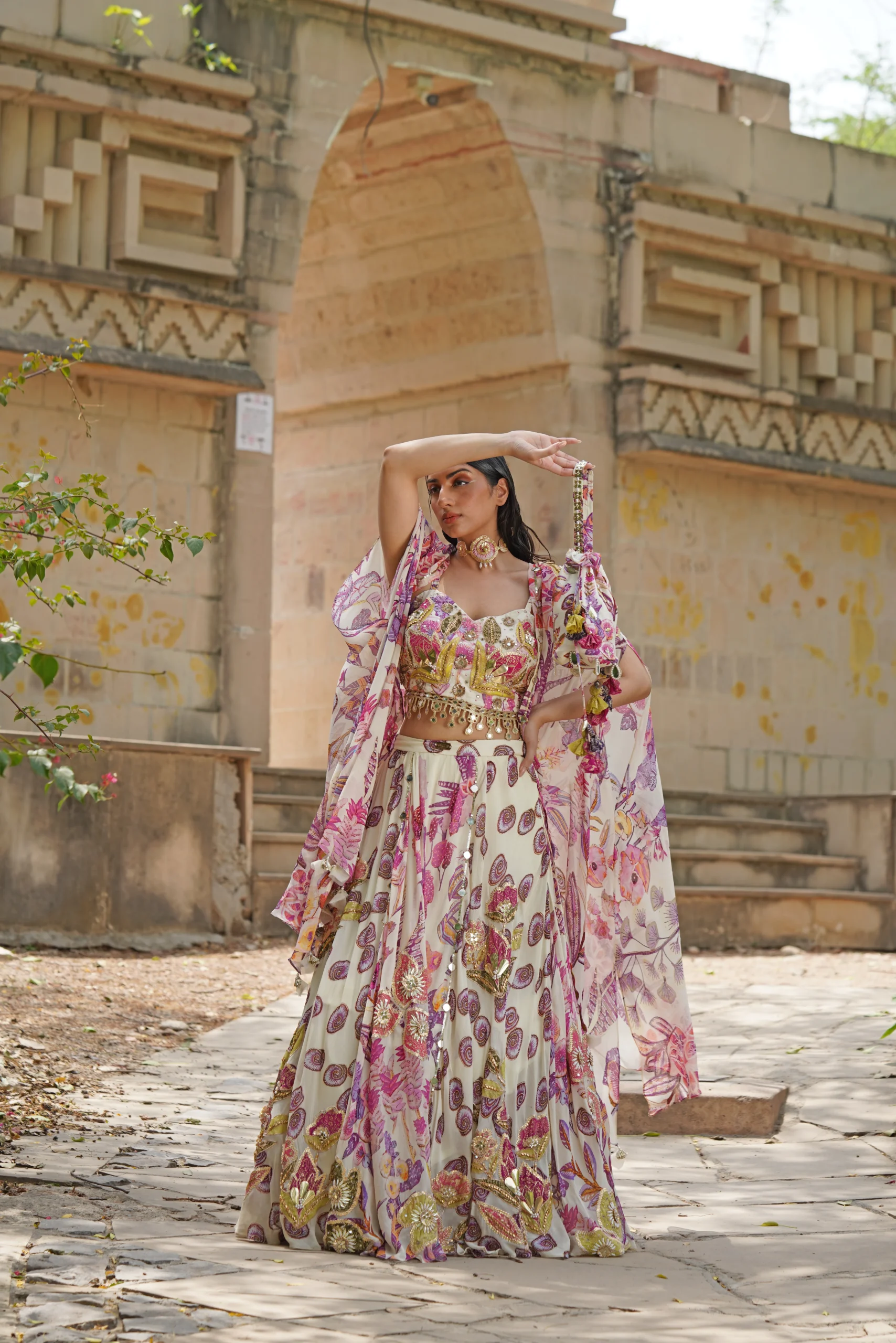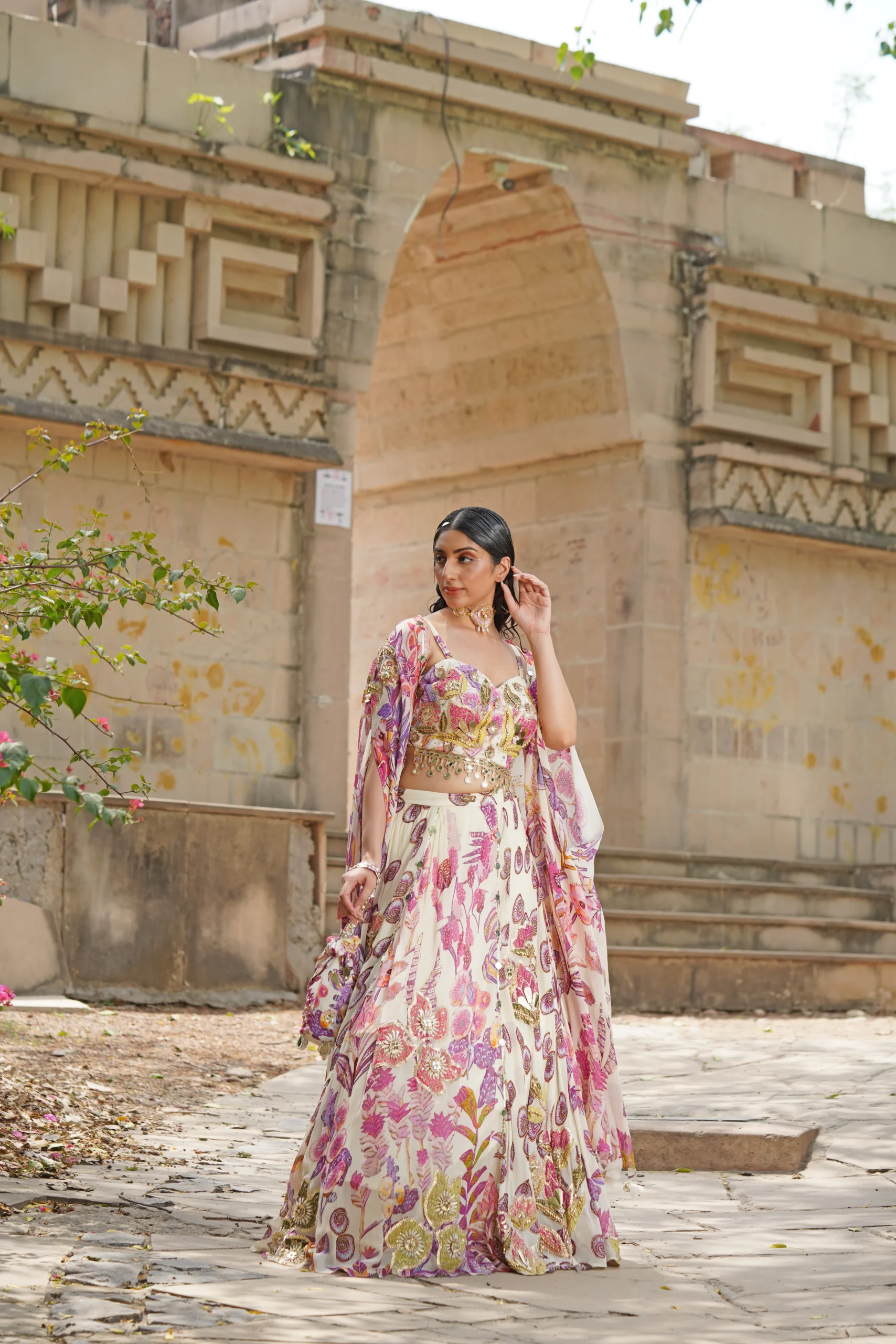 Style this floral lehenga with delicate crystal or pearl drop earrings and a soft bracelet to maintain its romantic elegance. Opt for luminous makeup with pastel eyes, subtle shimmer, and a rosy or nude lip. Finish the look with strappy heels or embellished sandals, ideal for destination weddings, festive soirées, and elegant celebrations.