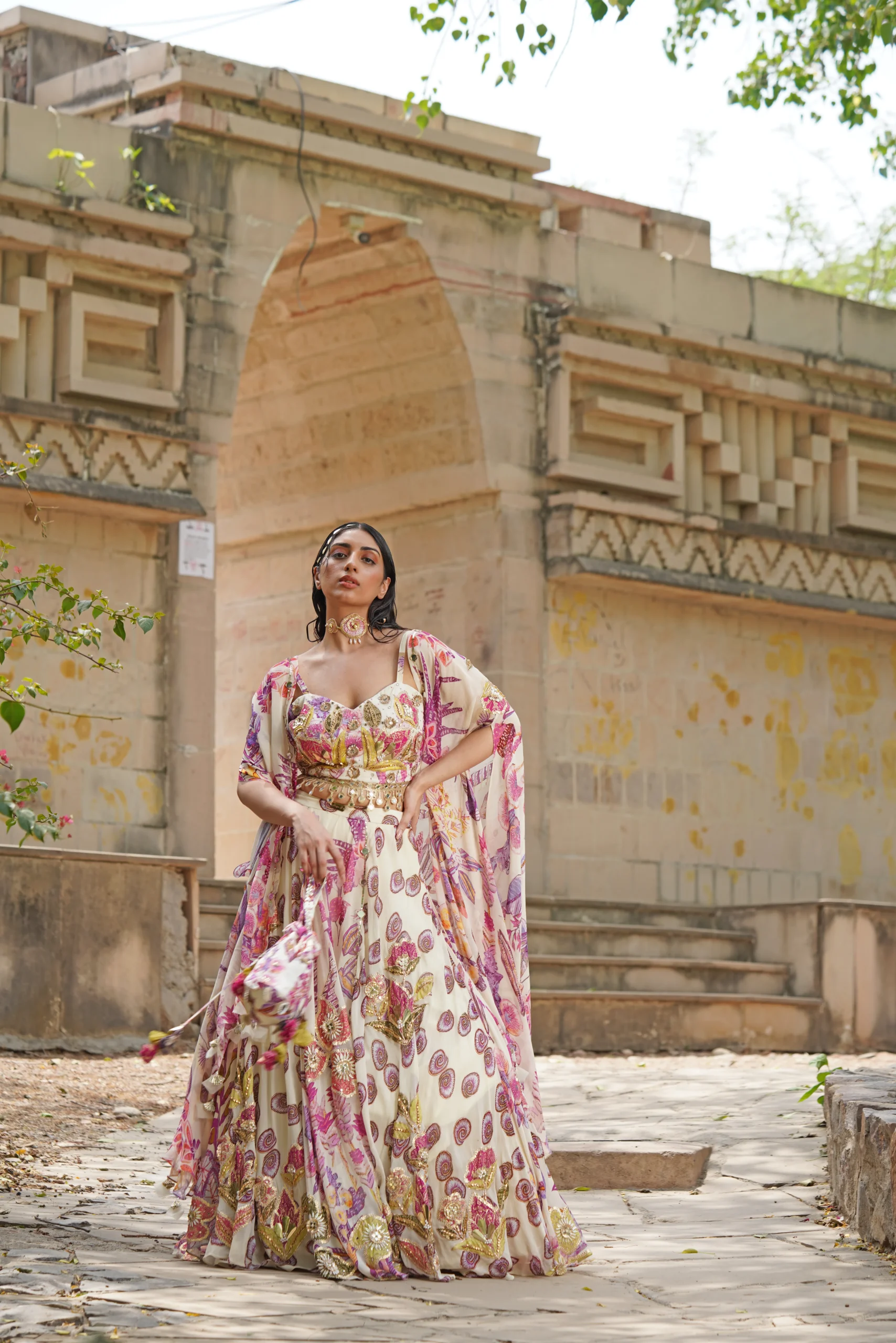 introducing a romantic floral lehenga ensemble that blends modern structure with timeless elegance. Featuring a sweetheart-neckline blouse with delicate straps, intricate thread embroidery, mirror work, and sequin detailing, it pairs effortlessly with a flowing A-line lehenga adorned in soft pastel floral prints. Mirror tassels at the hem add subtle shimmer, while a lightweight sheer dupatta and cape complete this refined, feminine look—perfect for destination weddings, festive celebrations, and elegant soirées.