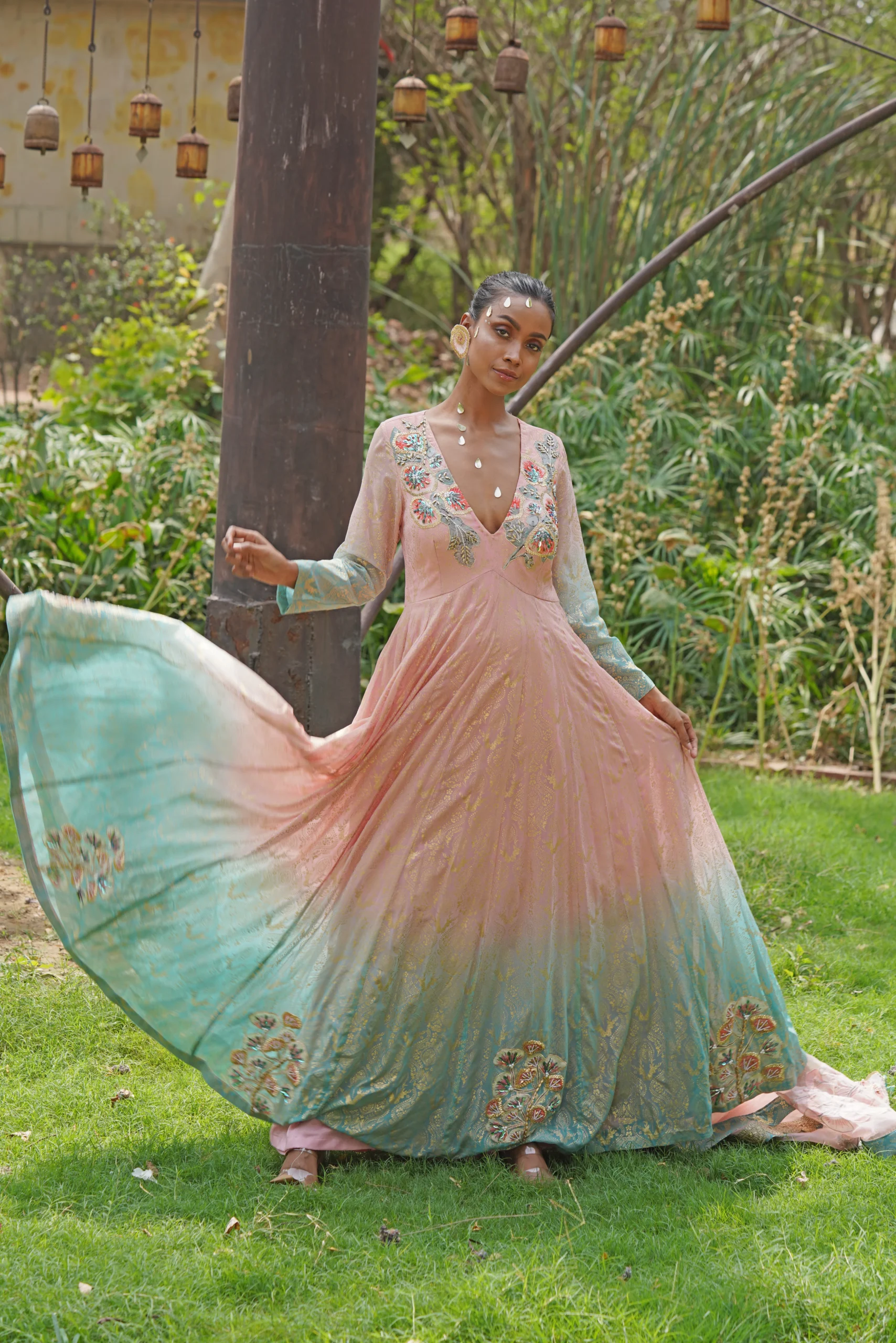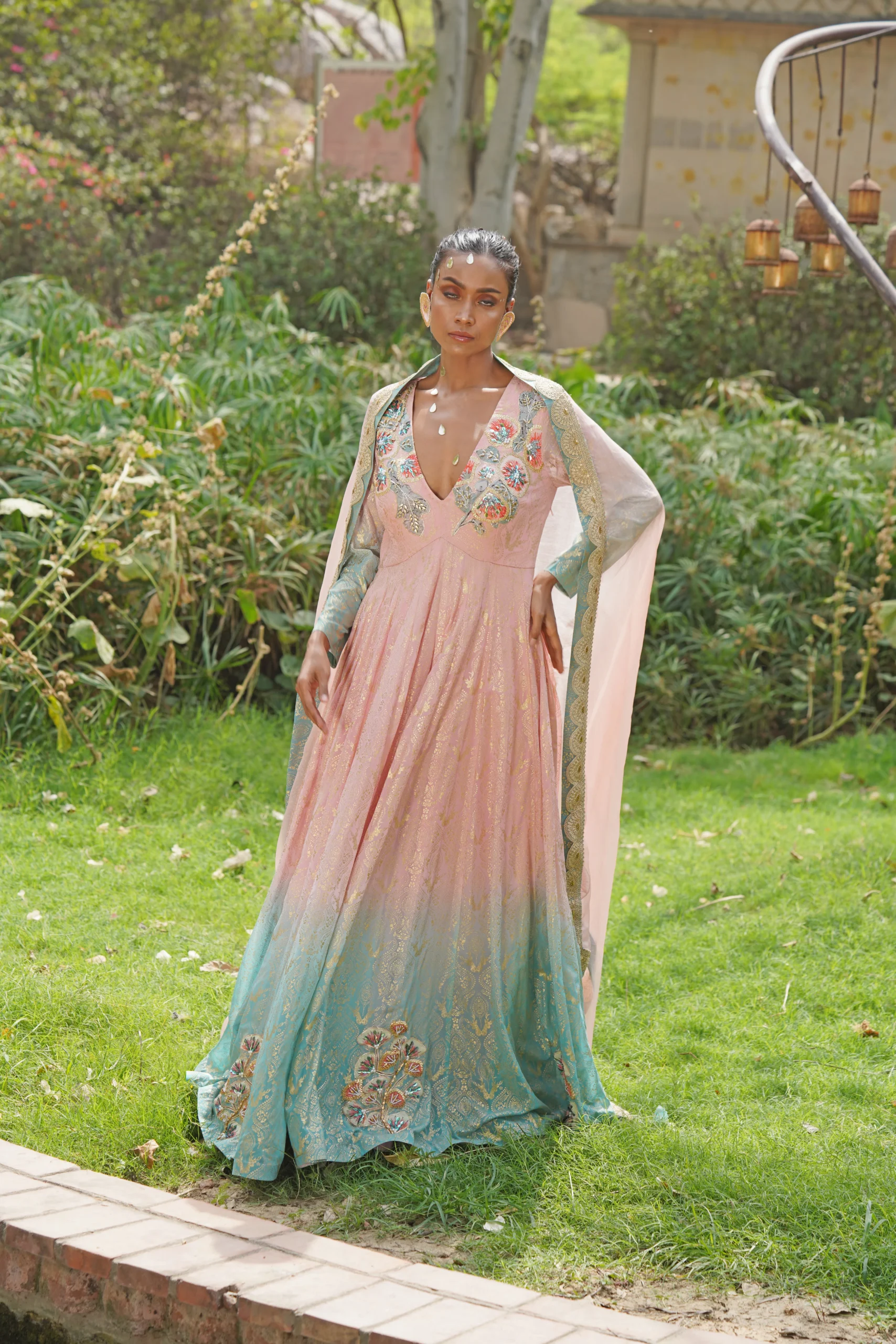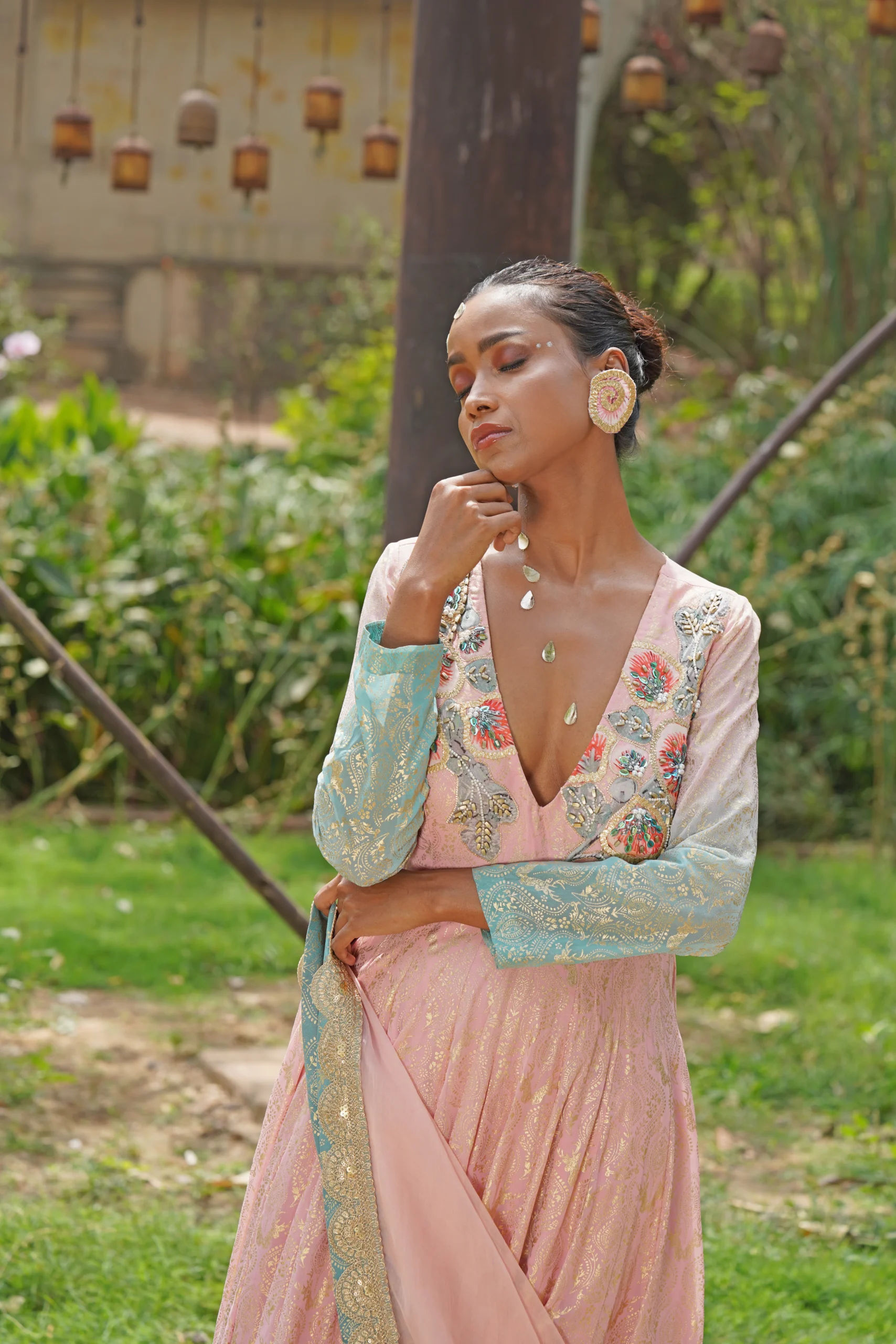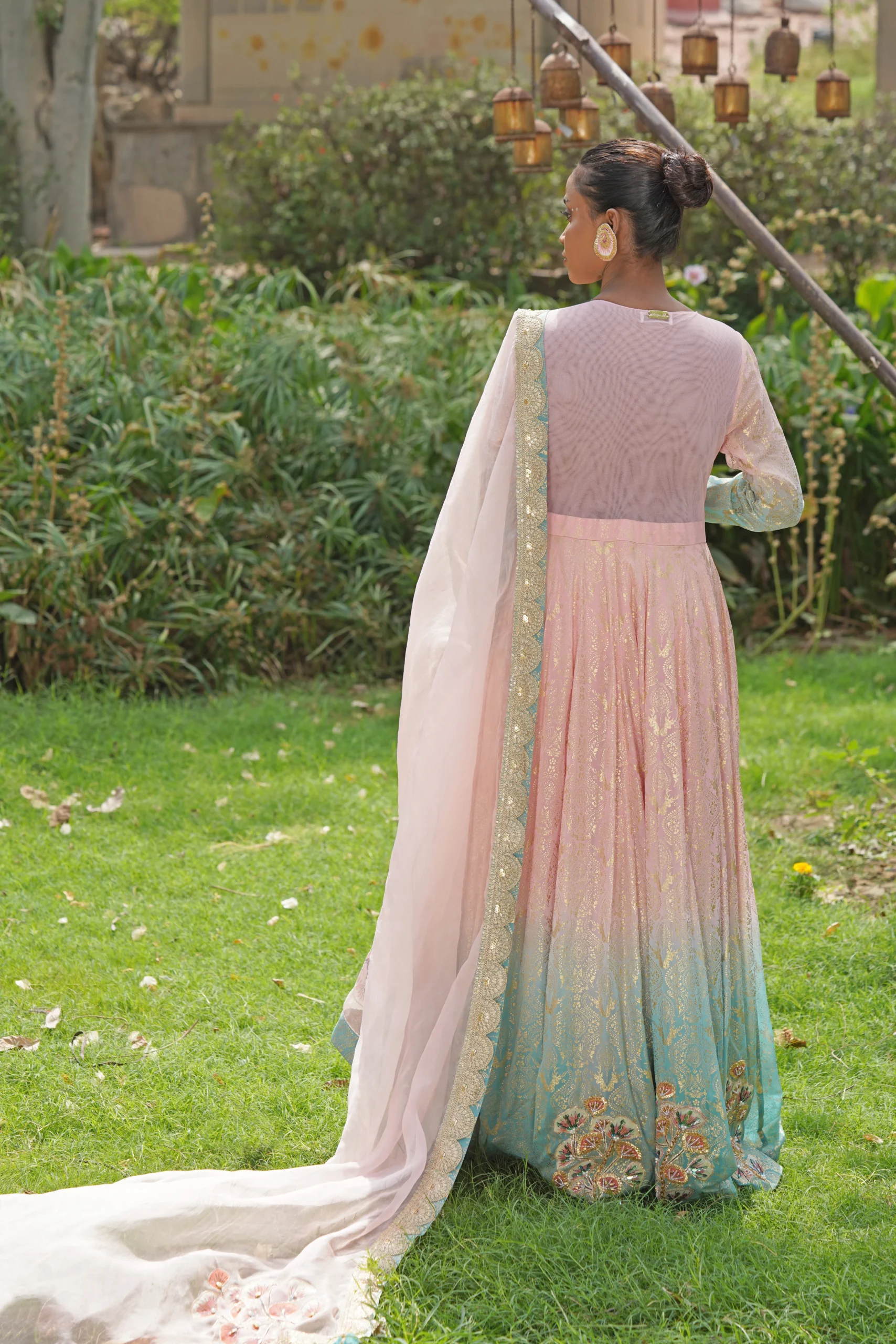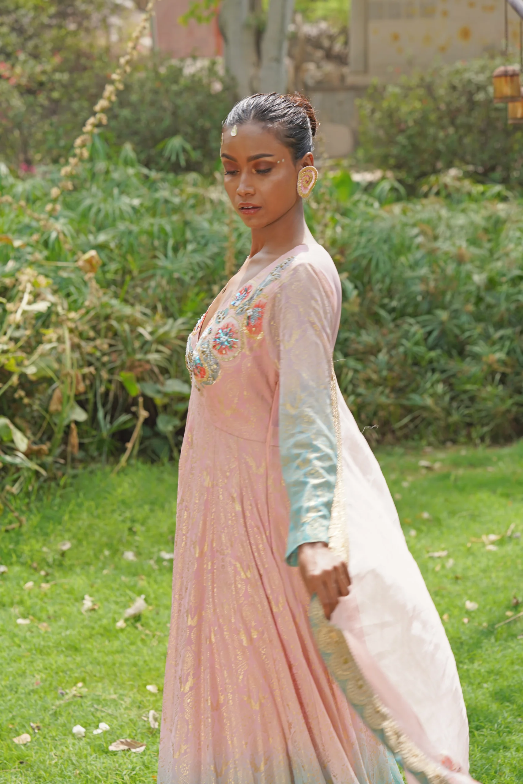 Blush Pink and Light Blue Floral Embroidered Anarkali Gown Set