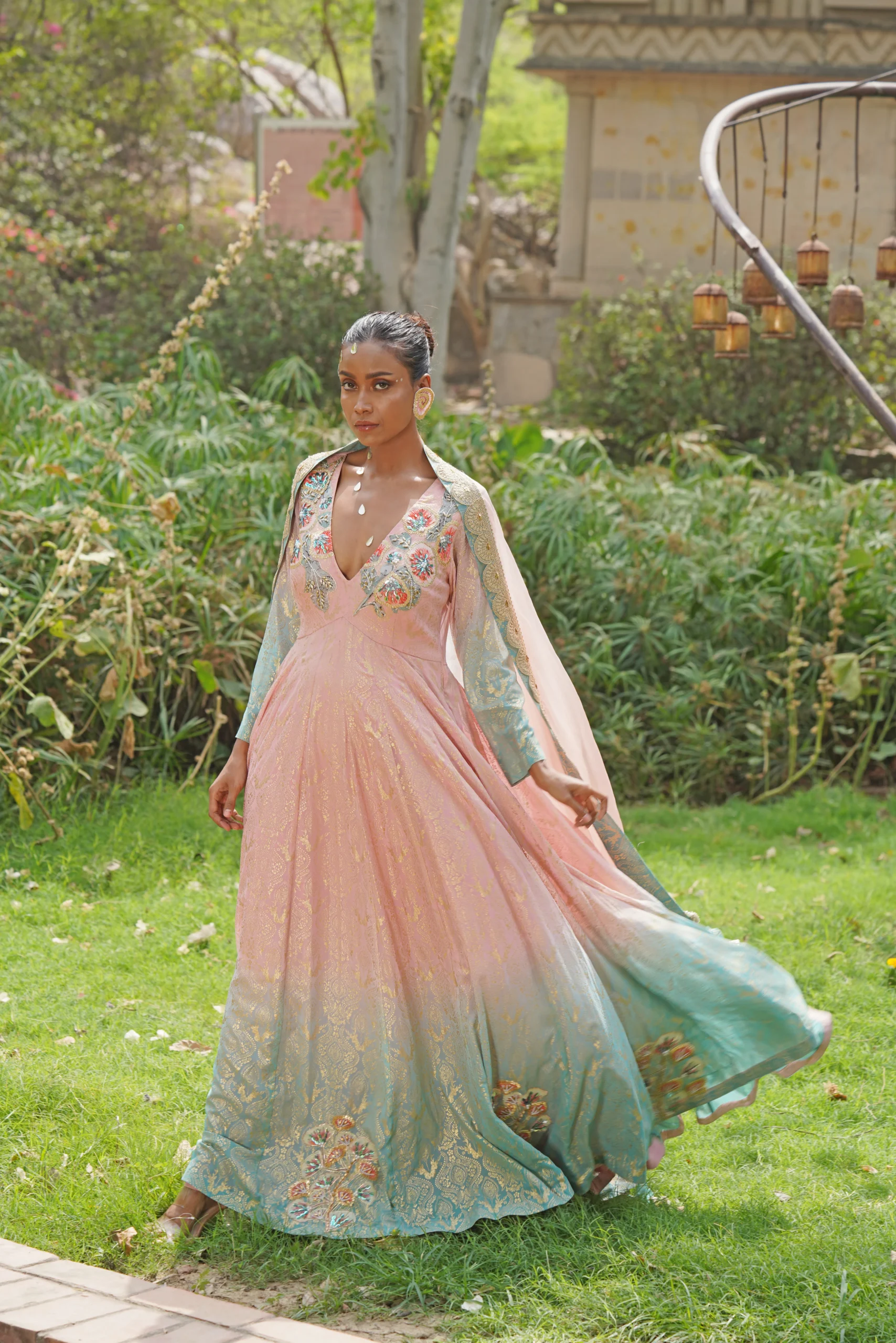 introducing a graceful pastel ensemble that blends timeless elegance with contemporary charm. Featuring a floor-length Anarkali gown paired with a flowing cape, the look creates a refined, goddess-like silhouette. The neckline and bodice are adorned with intricate floral thread embroidery, enhanced with subtle sequins and metallic accents. Pastel green full sleeves with delicate mirror and threadwork edging, along with a sheer dupatta, add softness, sophistication, and festive allure.