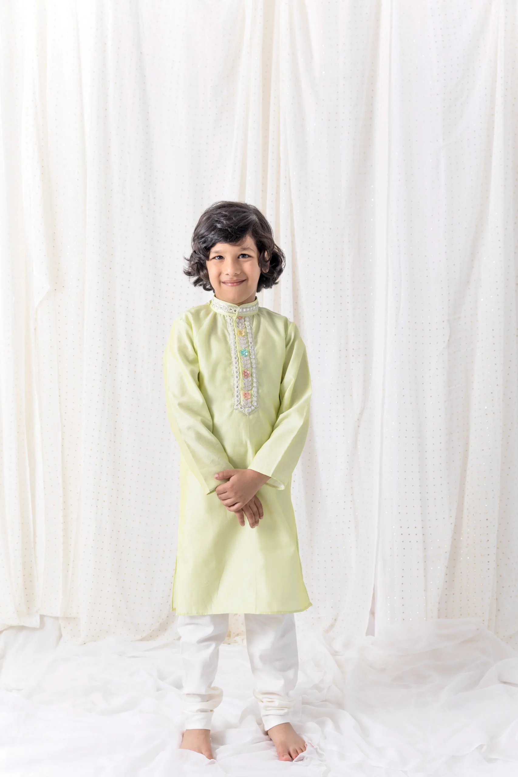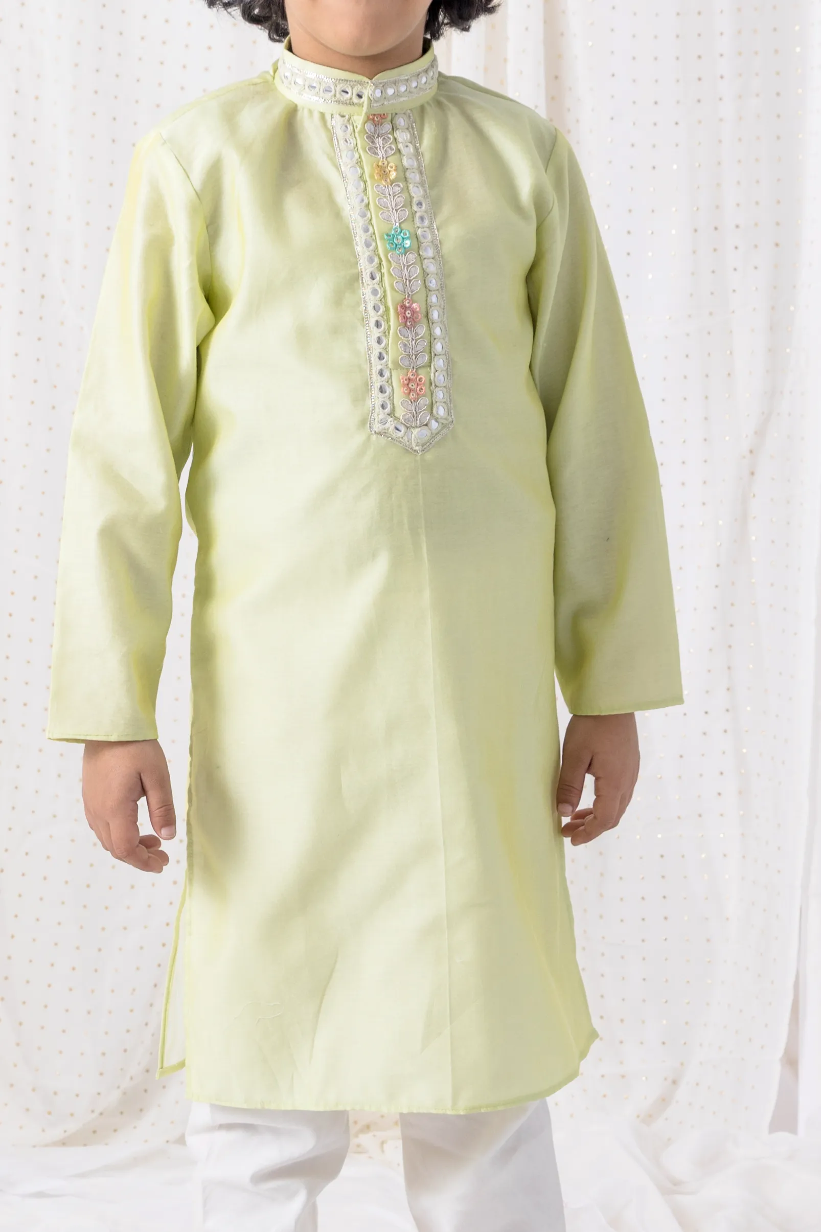 Pastel Green Organza Kurta with Gota Patti Detailing & Cotton Silk Pants for Boys