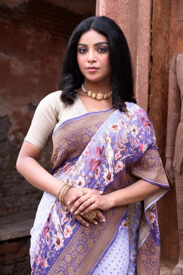 Style this pastel lilac Banarasi crepe chiffon silk saree with antique gold, pearl, or soft polki jewelry to enhance its delicate zari motifs and deep violet border. Pair with muted gold, violet, or nude-toned heels or embroidered juttis, and complete the look with a subtle metallic or velvet clutch.