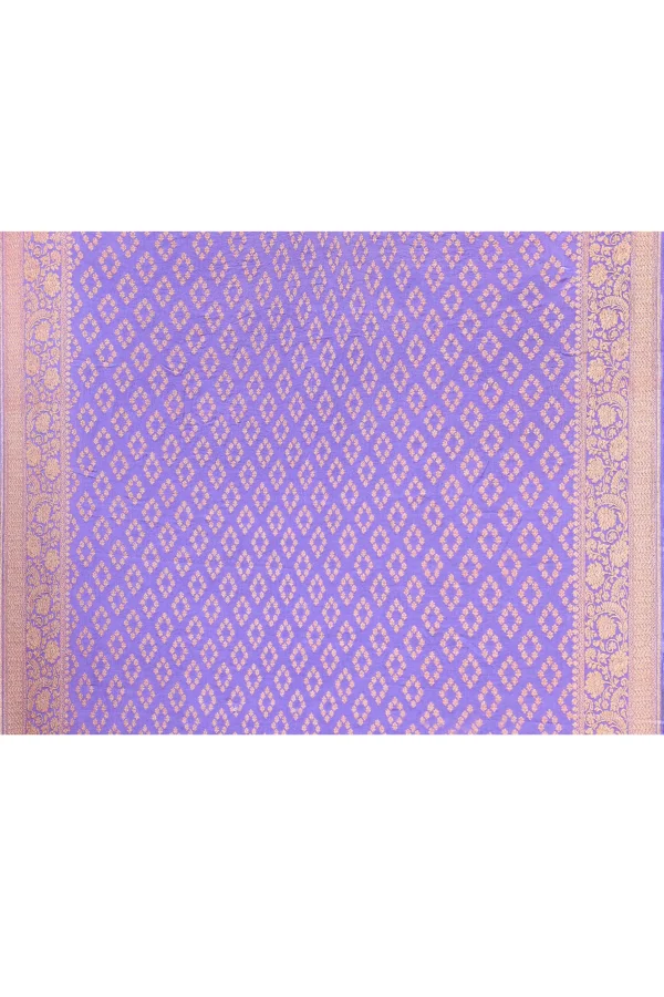 Introducing a pastel lilac pure Banarasi crepe chiffon silk saree, handwoven with delicate floral and ornamental motifs in antique gold zari across the body. Paired with a richly woven dusky deep violet border and pallu featuring traditional antique gold zari detailing, it comes with a matching running blouse pieceperfect for refined festive elegance.