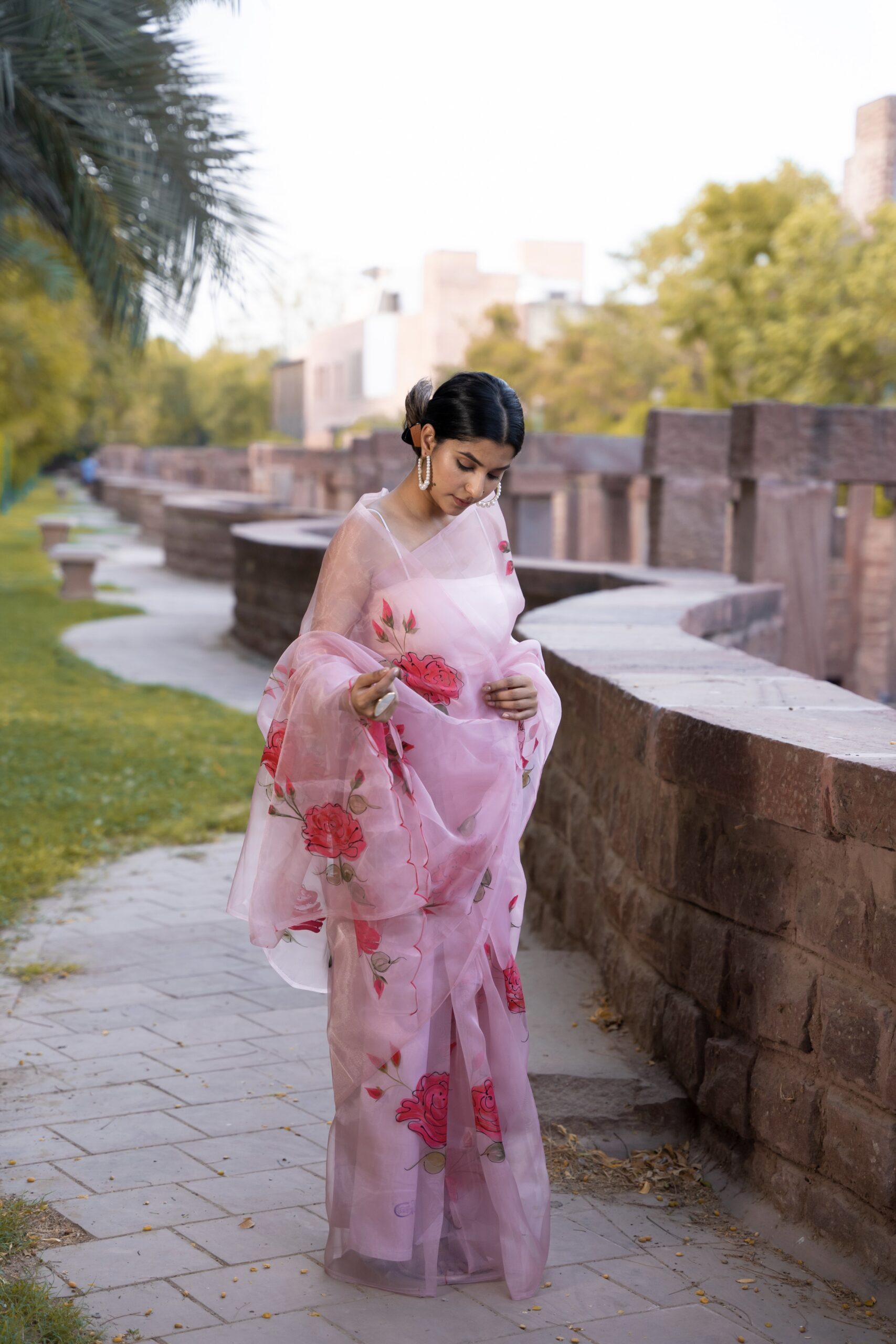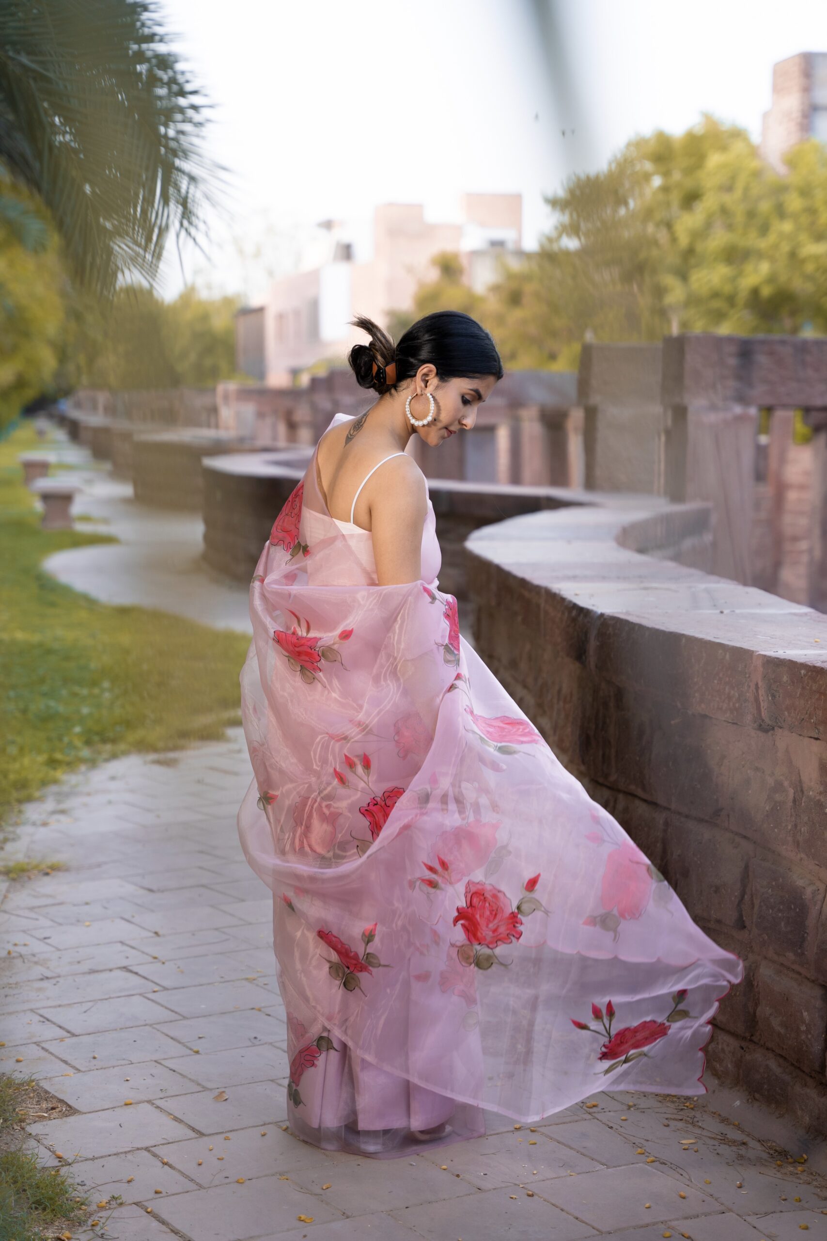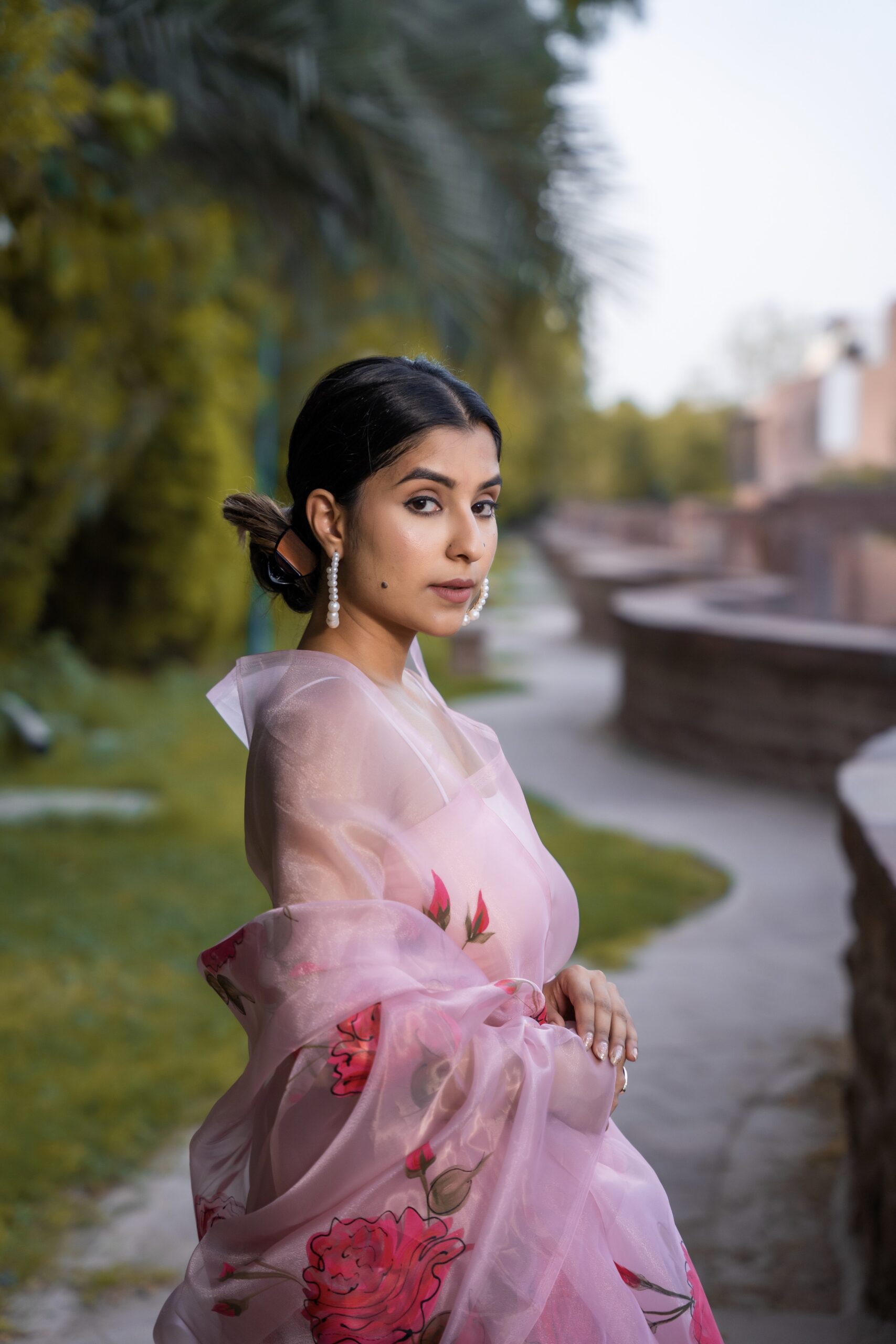 Introducing a pastel pink pure organza saree that embodies sheer elegance and artisanal finesse. Crafted from premium-quality organza, this ethereal drape is delicately hand-painted with blooming floral motifs by skilled artisans. The sheer fabric offers graceful structure and fluid movement, creating a light, romantic silhouette, perfect for intimate celebrations, daytime festivities, and elegant soirées.