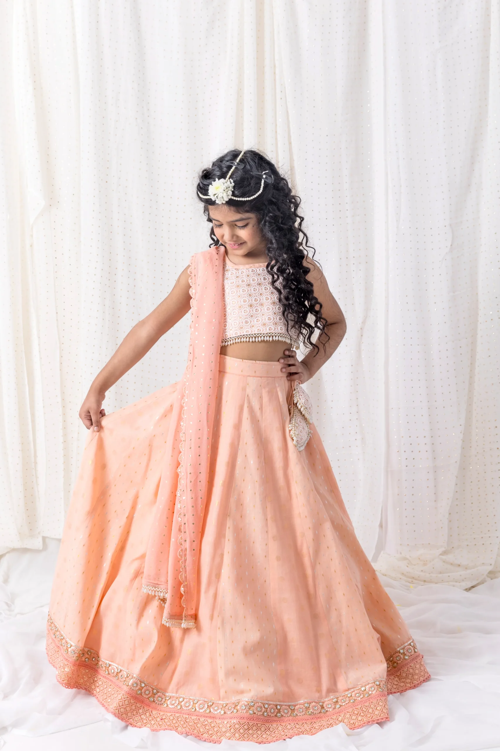 Peach Cotton Lehenga Set with Thread & Sequin Embroidered Top and Dupatta for Girls