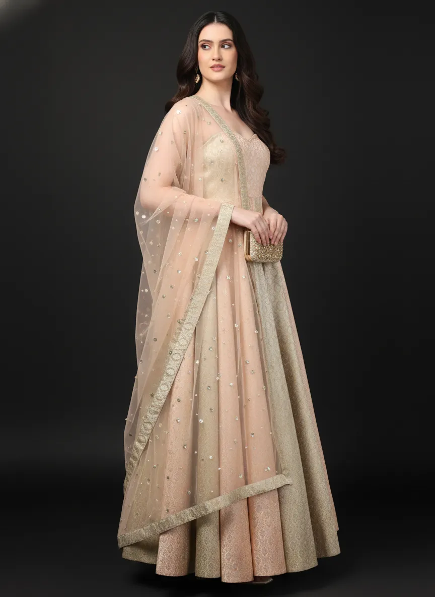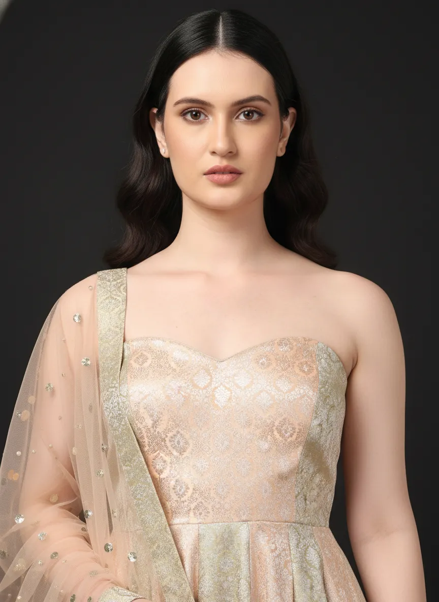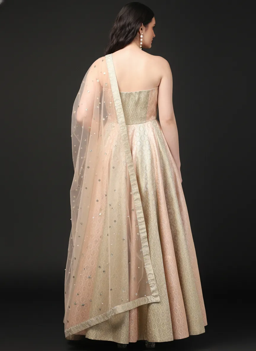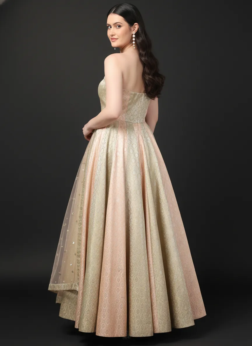 Peach & Mint Green Strapless Brocade Anarkali Gown with Sequined Net Dupatta