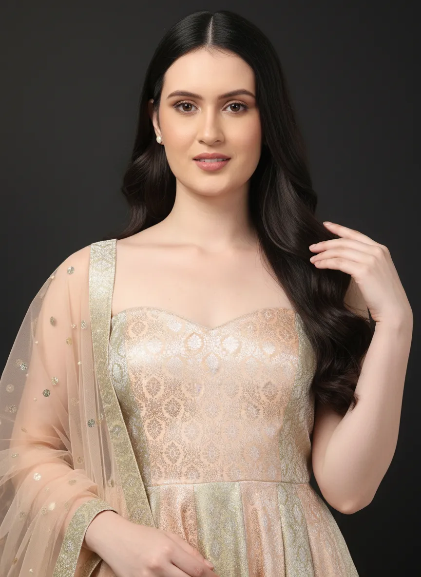 Introducing a stunning Peach and Mint Green Strapless Brocade Anarkali Gown crafted with rich brocade fabric and a subtle sheen. Featuring a structured bodice that flows into a voluminous flared skirt, this regal ensemble is paired with a sheer sequined net dupatta finished with a delicate golden border, perfect for weddings, bridesmaid looks, and special celebrations.