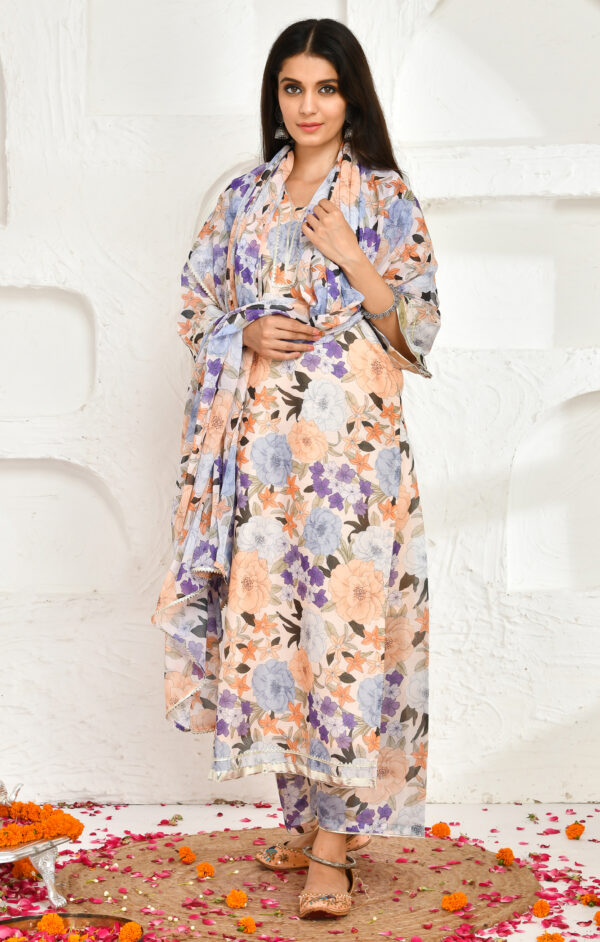 Introducing a peach chanderi printed kurta and palazzo set. Designed in floral-printed chanderi, the kurta is enhanced with gota lace detailing and paired with matching palazzo pants. Completing the ensemble is a floral-printed chiffon dupatta, finished with gota lace detailing, adding softness and refined movement.