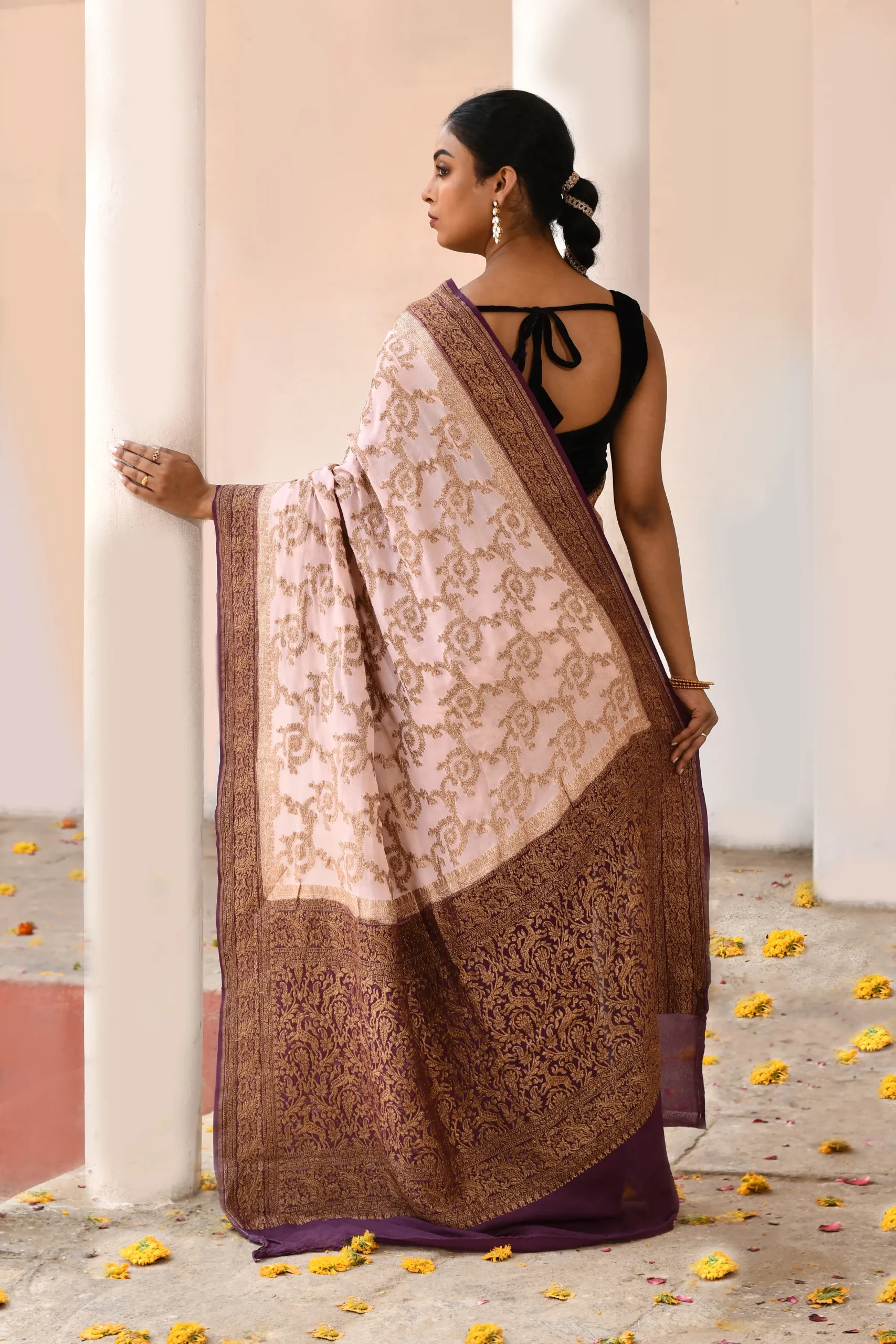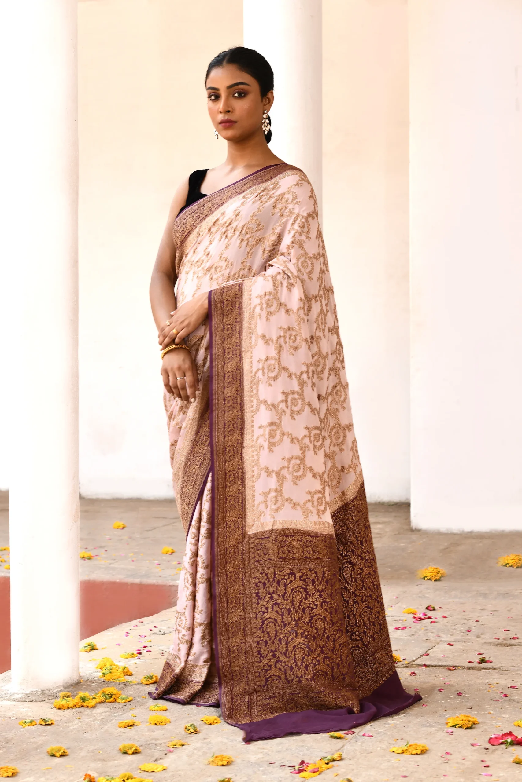Plum Purple Banarasi Soft Silk Saree with Silver Gold Zari Floral Jaal from Golden Muslin By Naaritva Banaras