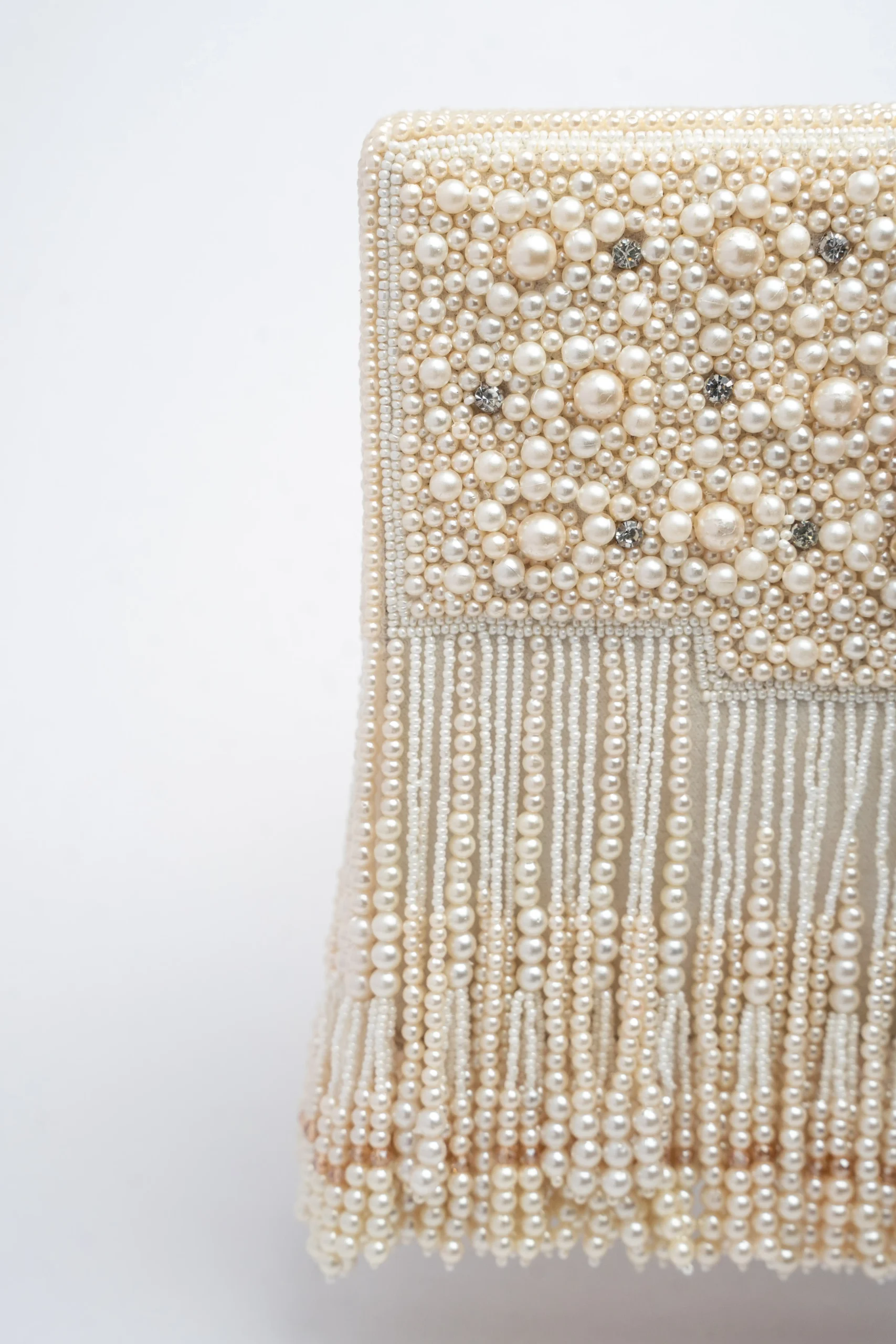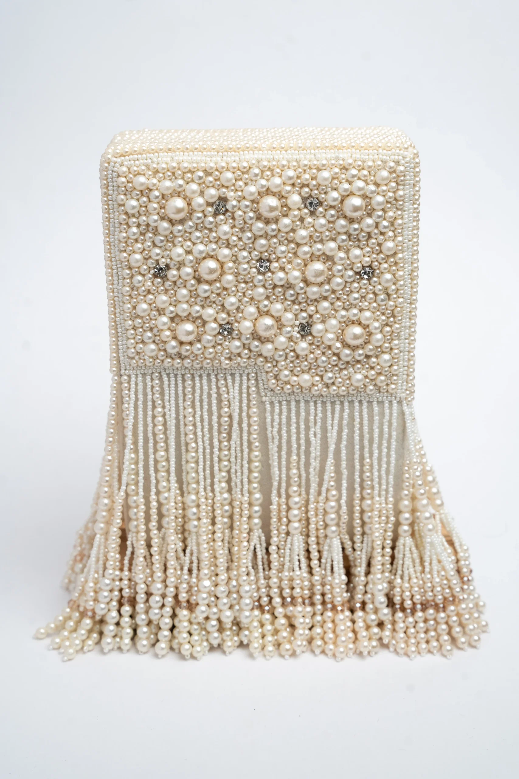 Introducing a chic pearl tasseled potli adorned with delicate beaded tassels that bring playful elegance to your festive wardrobe. Designed for modern celebrations, this stylish potli blends traditional charm with contemporary flair, making it the perfect accessory to elevate ethnic and fusion outfits for weddings, parties, and festive occasions.