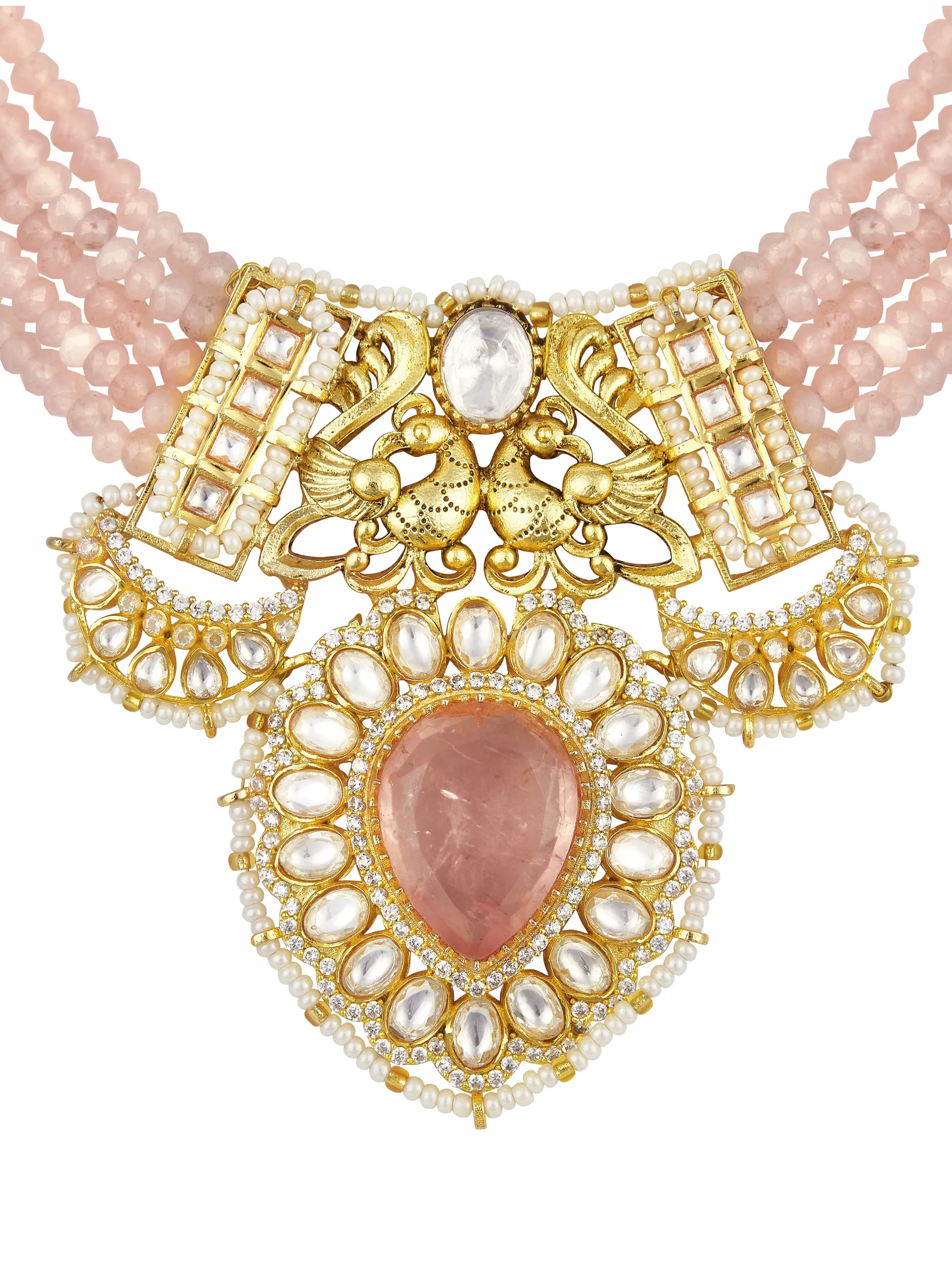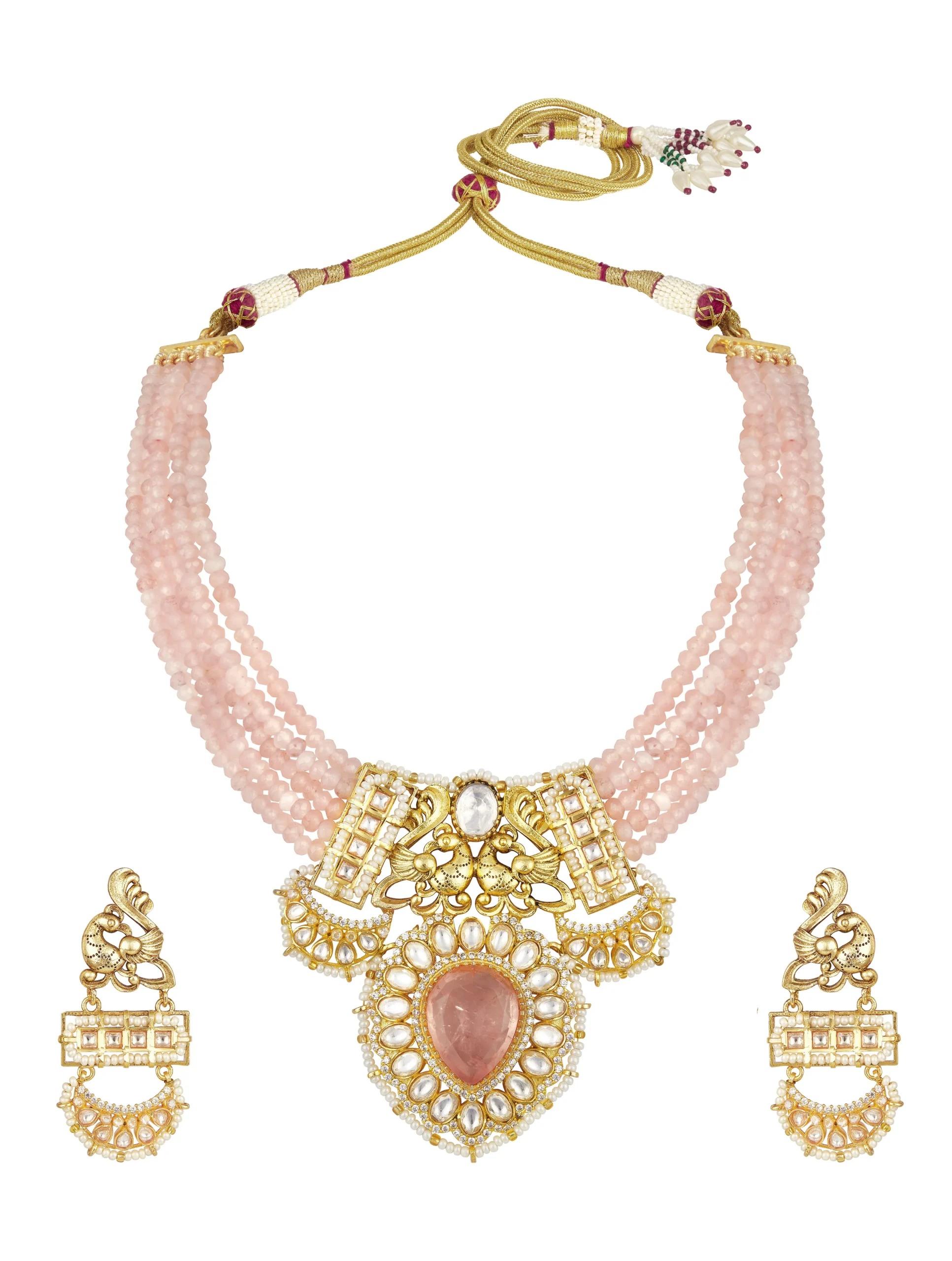 Style this elegant necklace set with pastel lehengas, chiffon sarees, or embroidered Anarkali outfits for weddings and festive celebrations. The soft pink agate strands beautifully complement blush, ivory, champagne, and gold outfits, creating a delicate yet luxurious statement perfect for both traditional and contemporary looks.