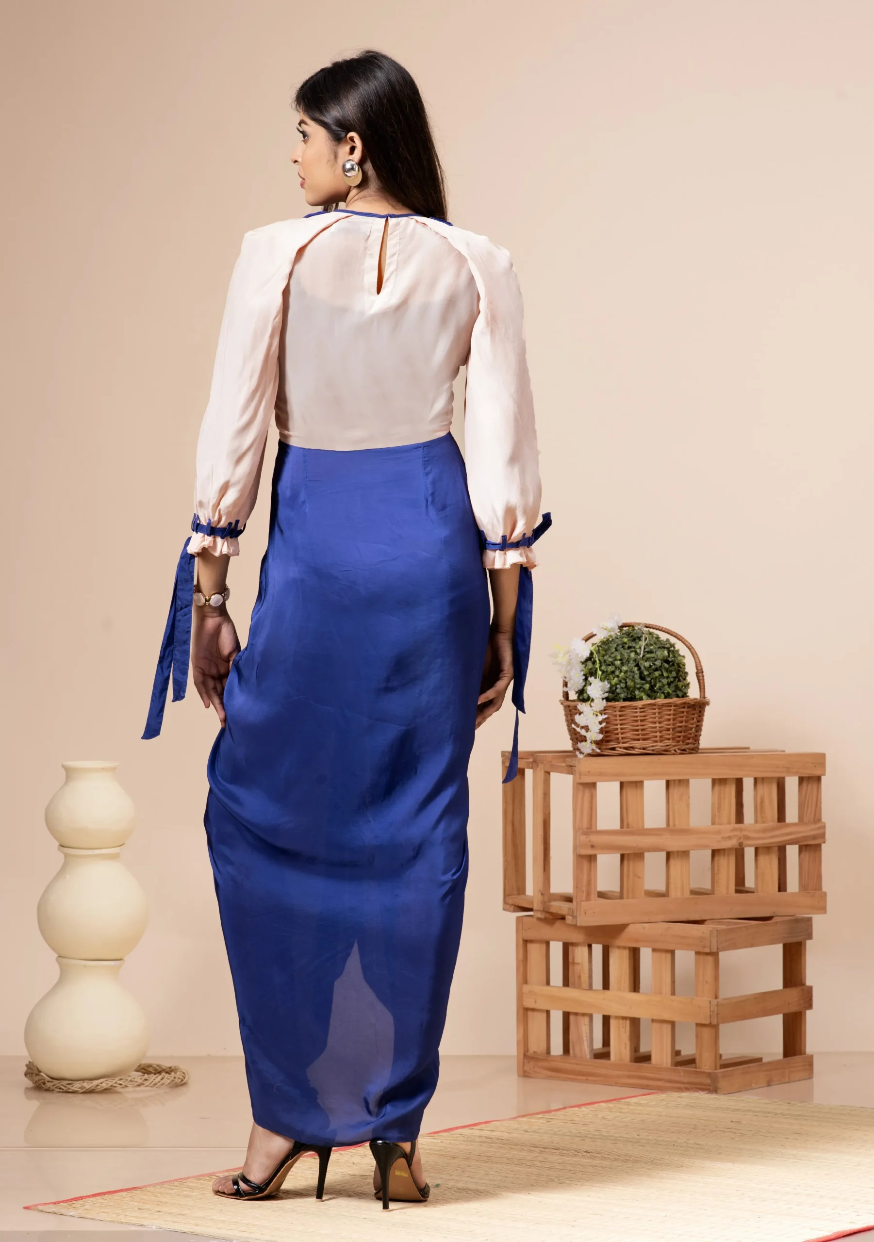 Introducing a gorgeous cowl dress in pink champagne and admiral blue habutai silk, adorned with exquisite hand embroidery. This dress features delicate lace detailing at the neckline and stylish tied open balloon sleeves, combining elegance and modern flair for a standout look.