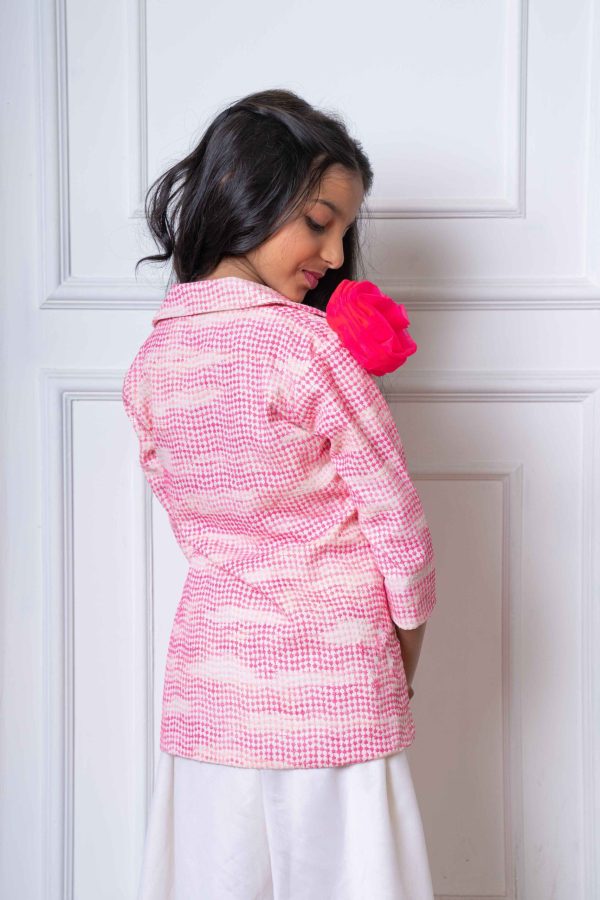 The top is a blazer-style jacket with a pink and white checkered pattern, blending modern and elegant aesthetics. It features a lapel collar and three-quarter sleeves, offering a chic and structured look. A standout detail is the bright pink bow-tie belt at the waist, which accentuates the silhouette and adds a playful touch. The left shoulder is adorned with a pink floral embellishment, giving the outfit a trendy and stylish vibe. Crafted from lightweight and breathable fabric, it ensures comfort while maintaining elegance. The bottom consists of white wide-leg palazzo pants made from flowy, sheer fabric, enhancing grace and comfort. The pants are high-waisted with a relaxed fit, providing ease of movement and a contemporary flair. The sheer overlay adds a touch of sophistication, making it ideal for both casual and festive occasions.