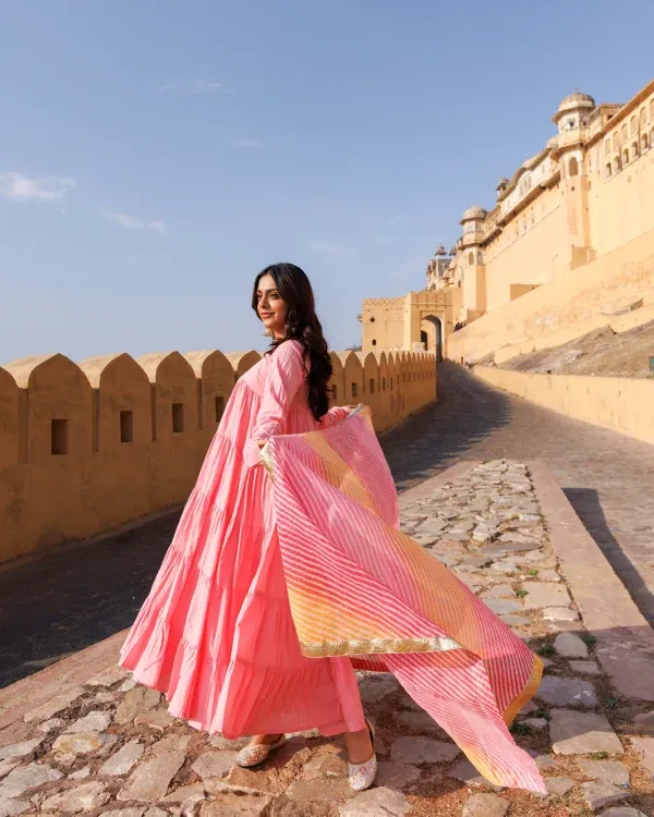Introducing a soft pink cotton tiered Anarkali set designed for effortless elegance and relaxed festive wear. Featuring a flowy tiered silhouette, the Anarkali creates graceful movement and feminine charm. Crafted in breathable cotton, this ensemble ensures all-day comfort while offering refined simplicityperfect for daytime celebrations, intimate gatherings, and elegant everyday occasions.