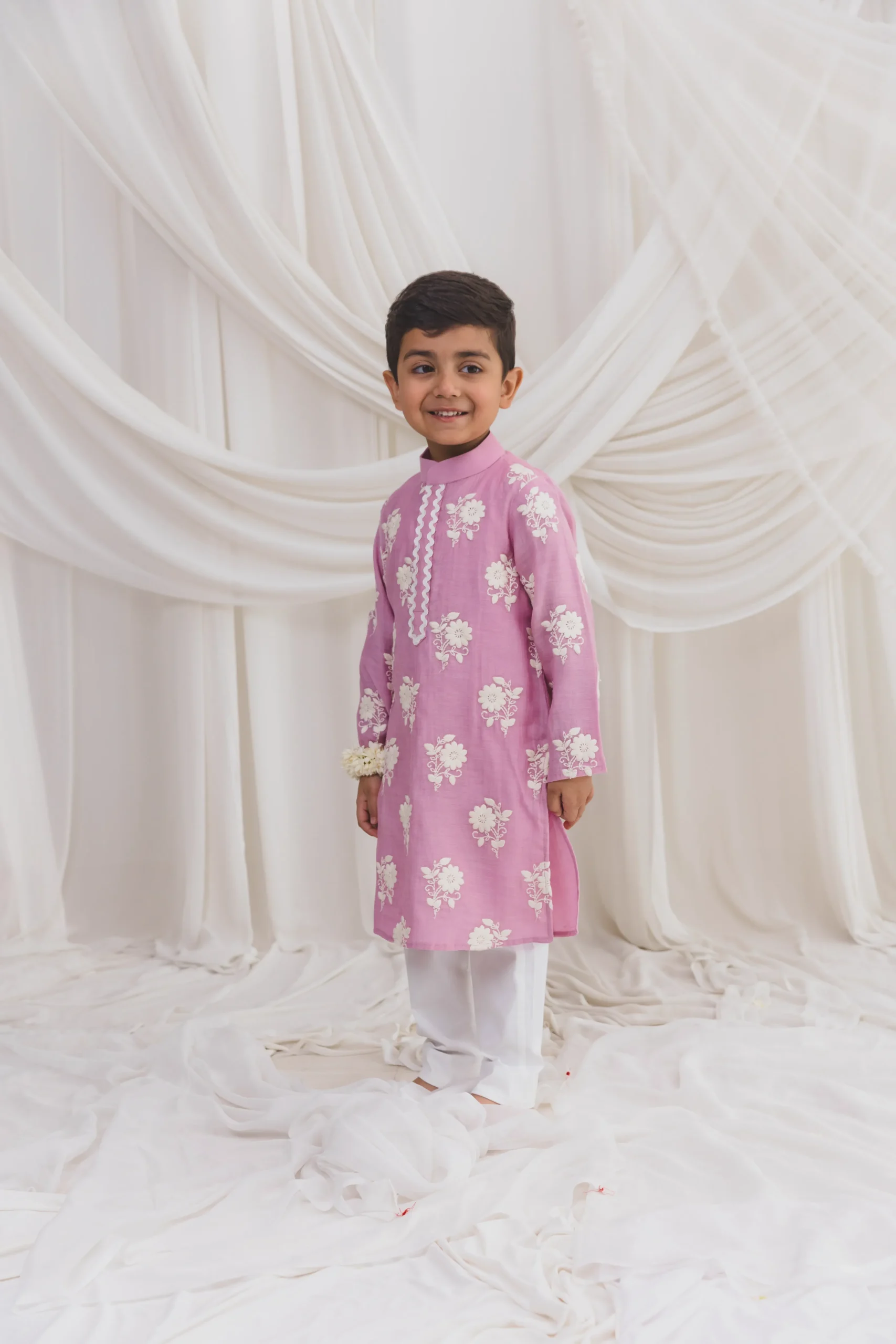 Pink Mul Chanderi Embroidered Kurta Set with Cotton Lycra Pants for Boys