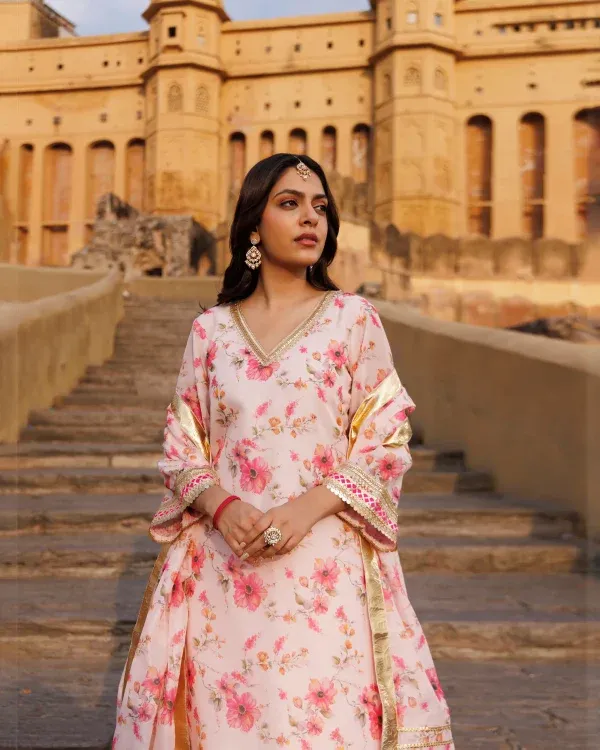 Introducing a delicately feminine pink Chanderi kurta set that exudes timeless elegance. Adorned with all-over floral prints, the kurta is enhanced with refined gota accents and fine sequin work, adding a soft festive shimmer. Crafted in airy Chanderi fabric, this ensemble offers graceful drape, lightweight comfort, and understated sophistication—perfect for celebrations, daytime gatherings, and elegant festive occasions.