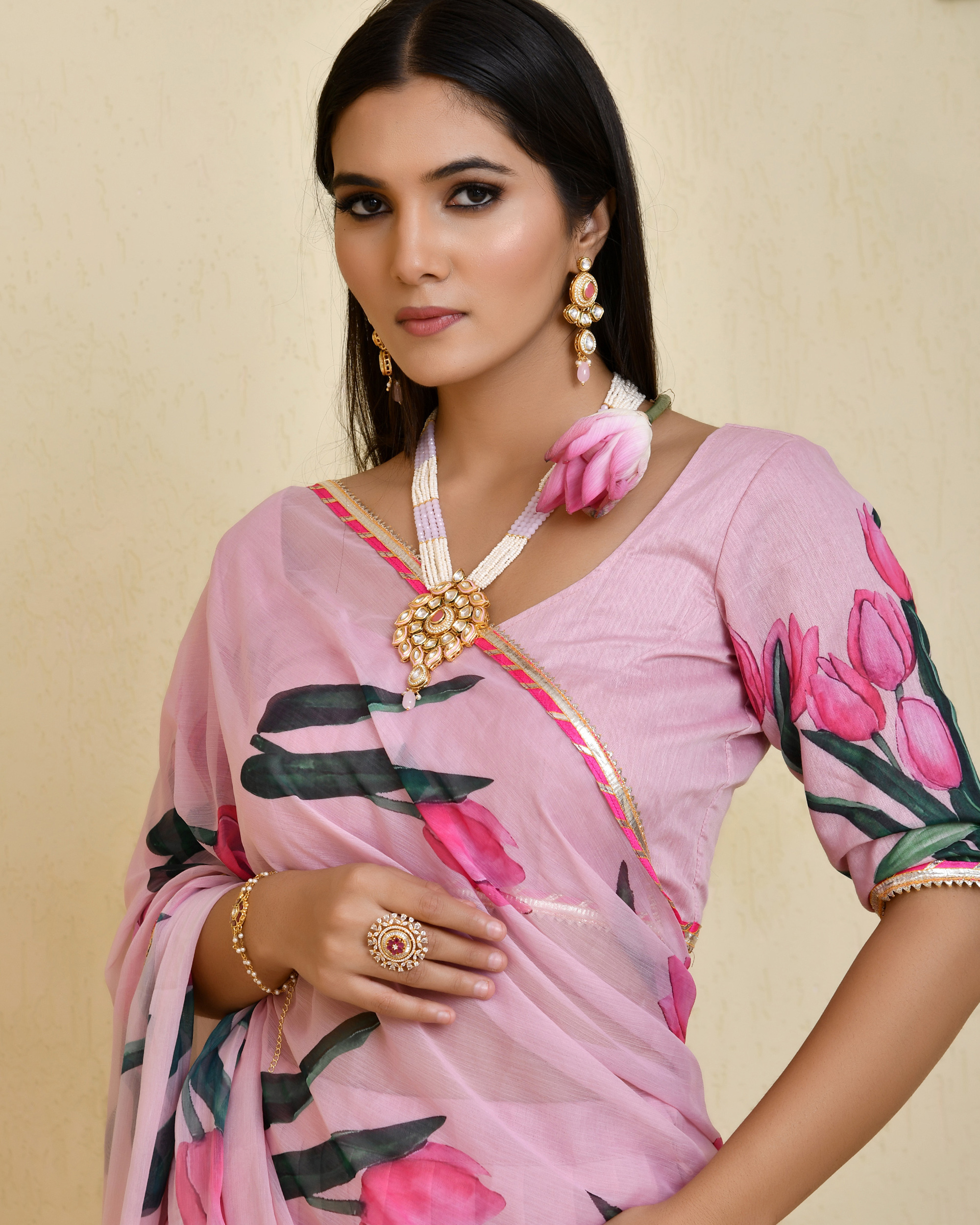 Enhance this pink Chanderi floral print lehenga set with pearl or rose-gold jewellery to complement its soft, feminine palette. Complete the ensemble with nude, blush, or metallic heels for a polished finish.