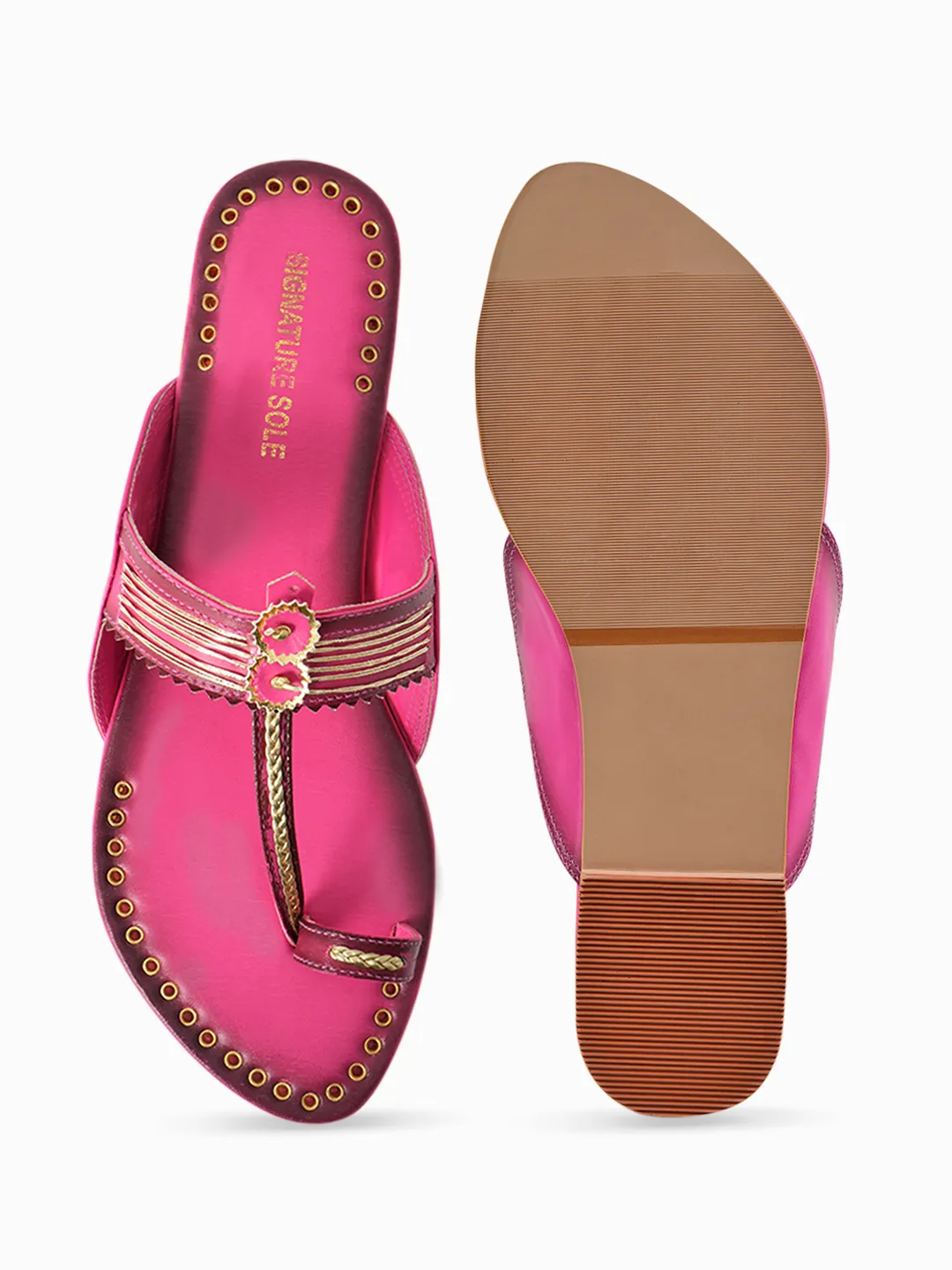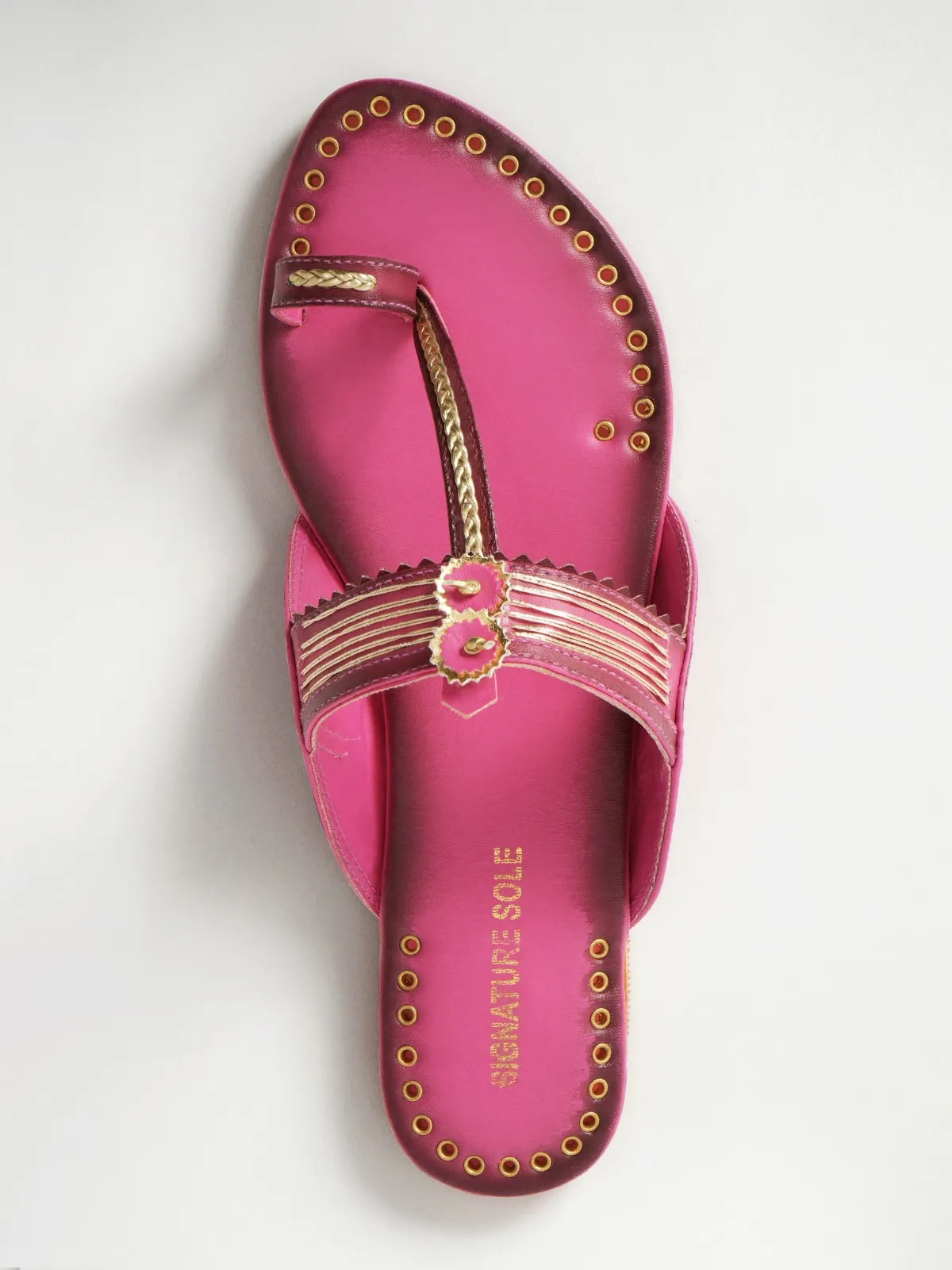 Adorned with gold multi-line strap, braided thong, gear buckle and eyelet border in faux leather, this Pink Gold Ethnic Flat Sandal brings traditional kolhapuri charm.