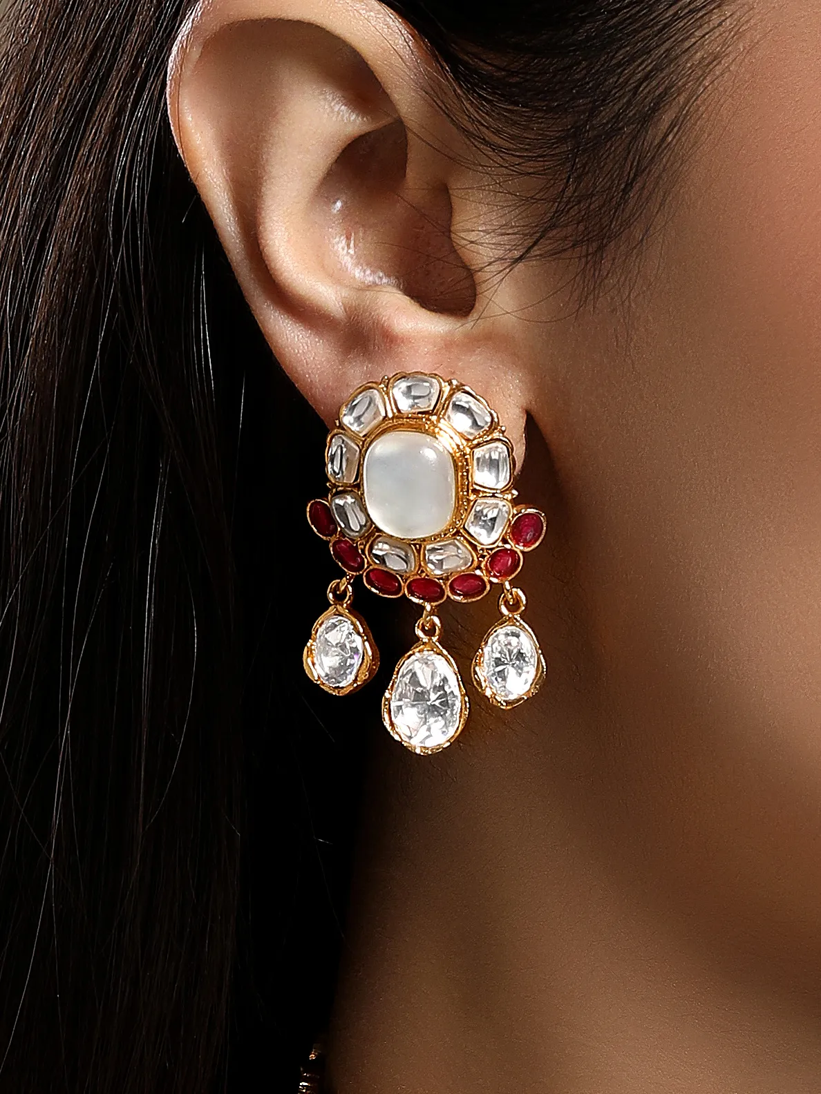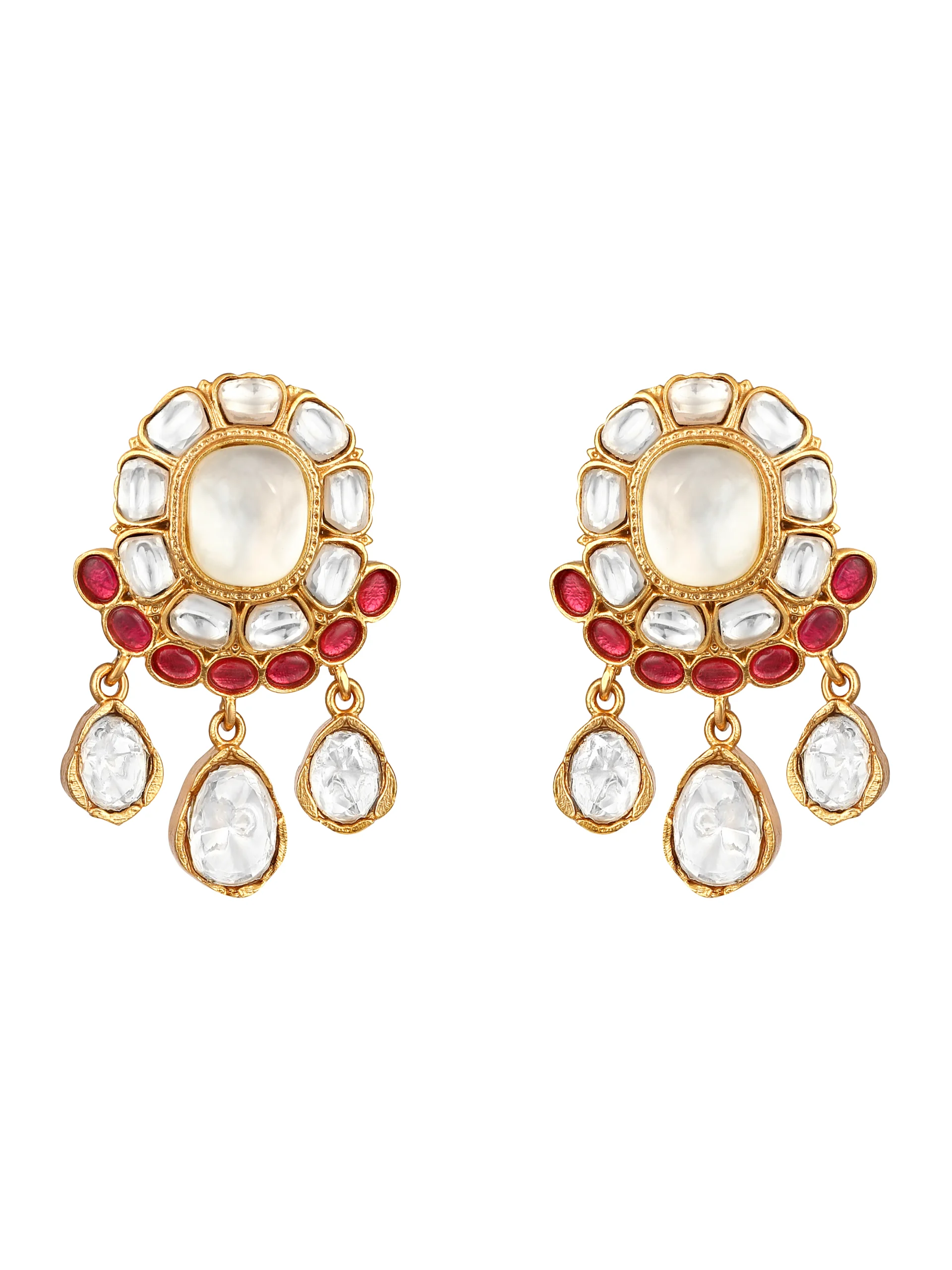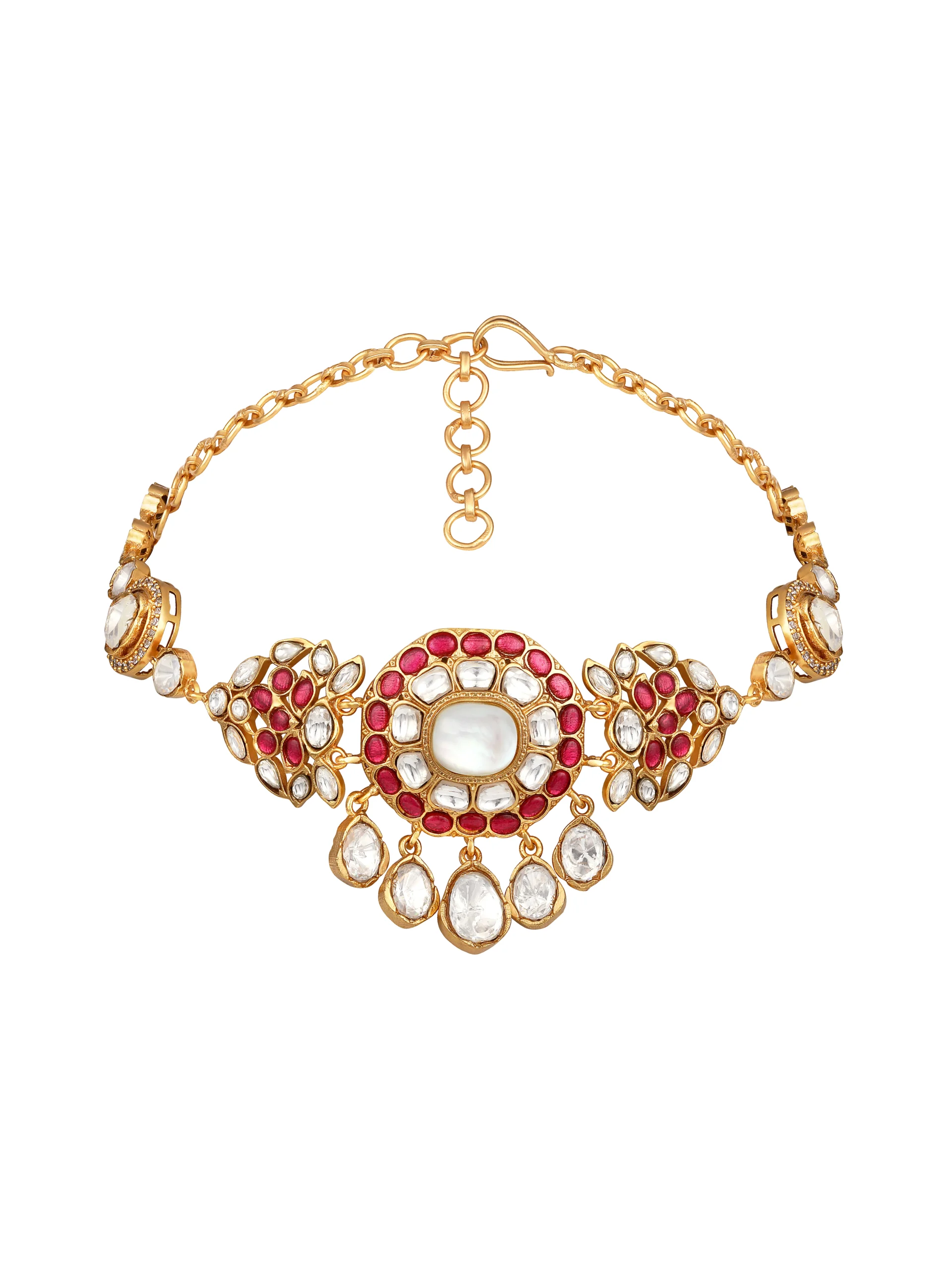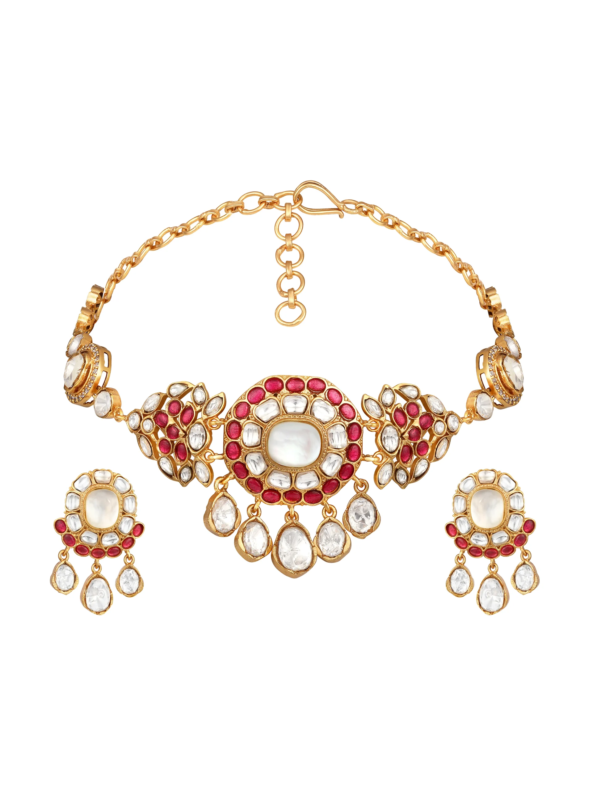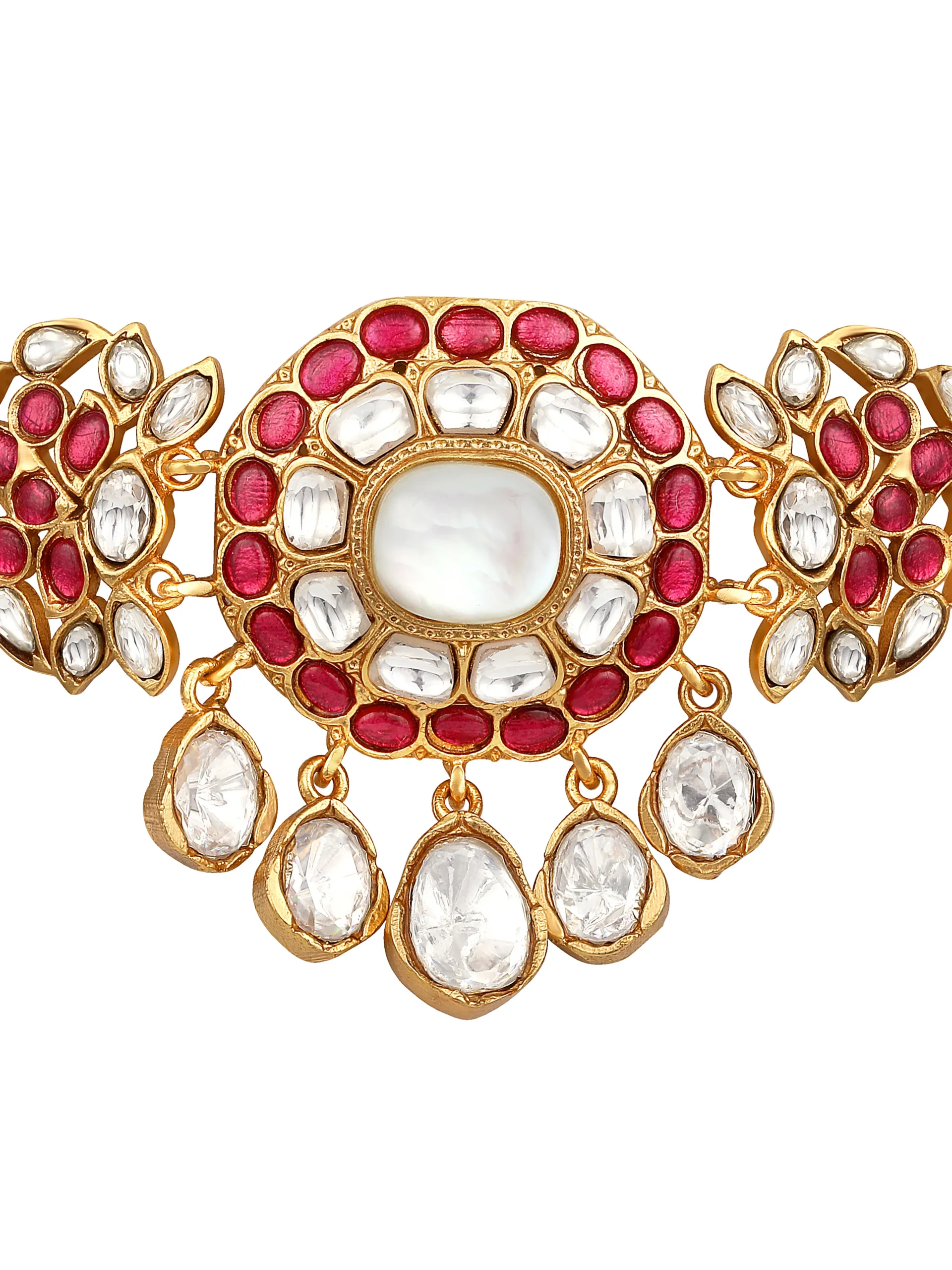 Introducing Pink Kundan Polki Pearl Drop Choker Necklace Set crafted in micron gold polished brass, featuring radiant kundan polki stones with soft pink accents and elegant pearl drops. Handcrafted with intricate detailing, this graceful choker blends timeless tradition with modern elegance, making it ideal for weddings and festive occasions.