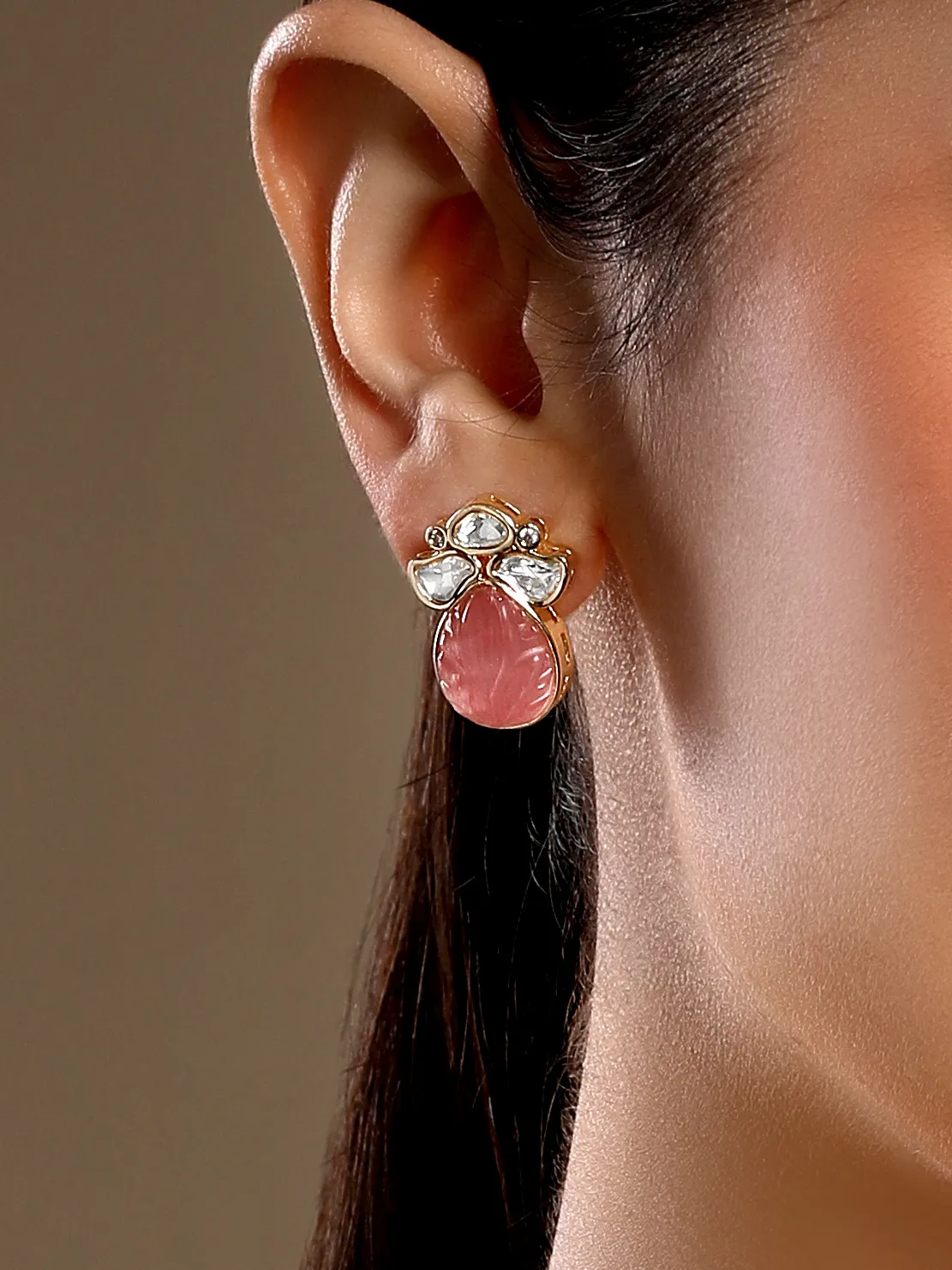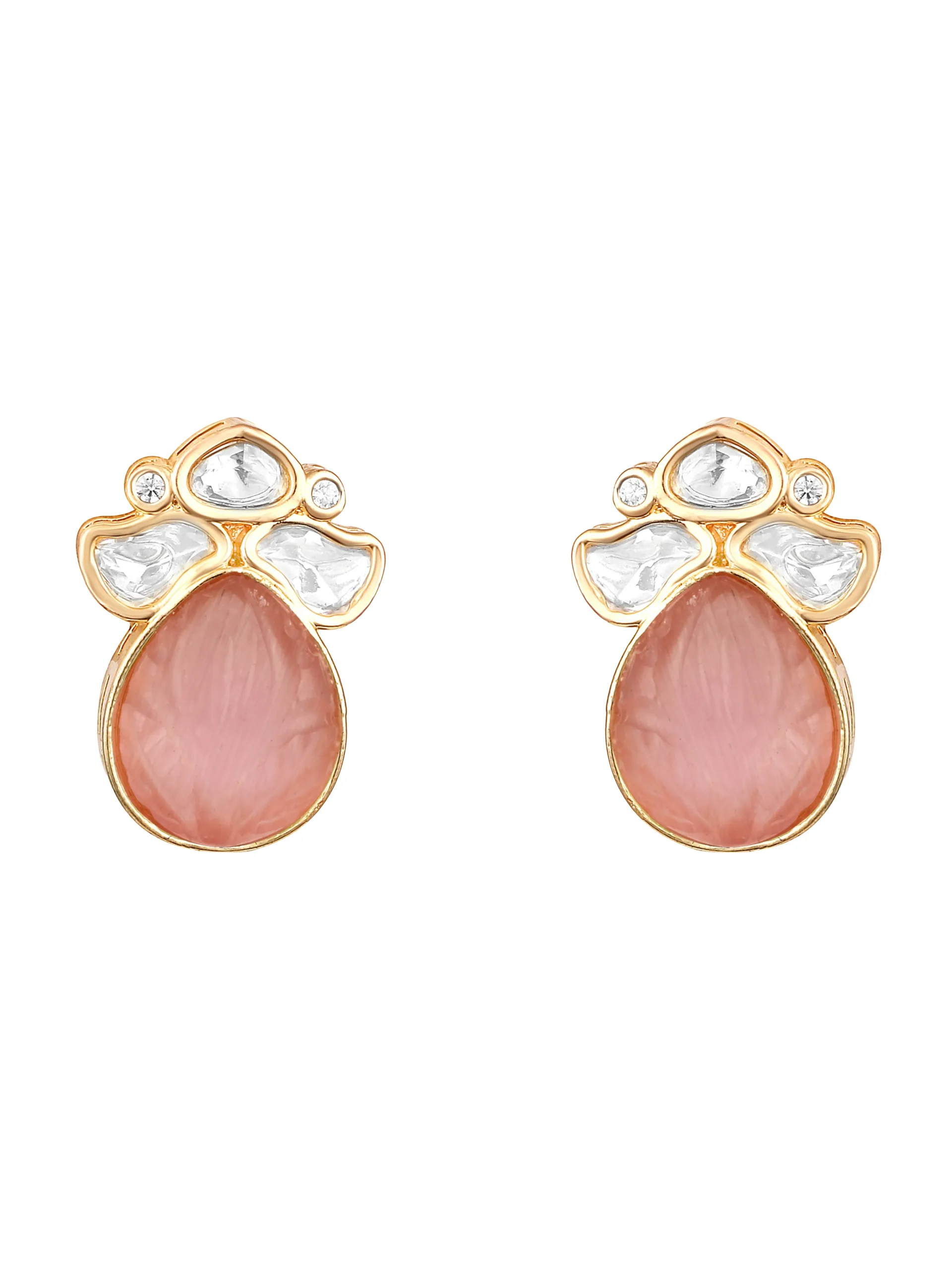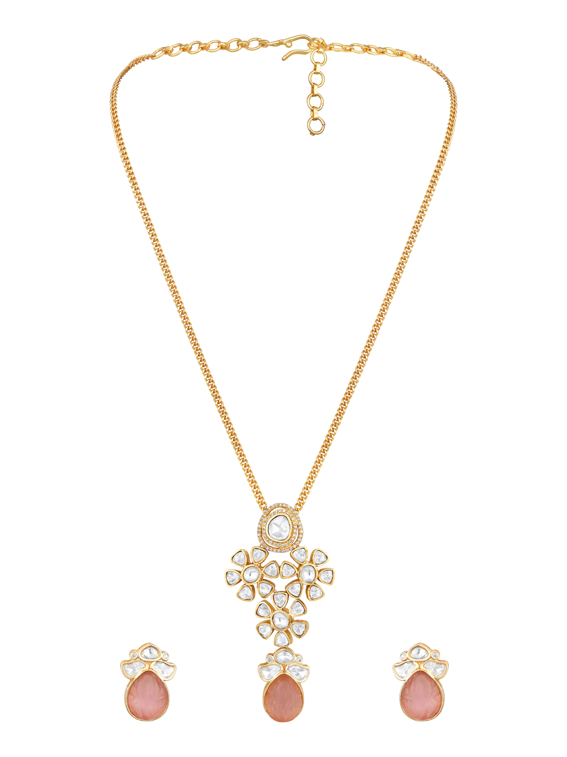 Introducing Pink Kundan Polki Pendant Long Necklace Set crafted in micron gold polished brass, featuring radiant kundan stones and a delicate pink agate drop pendant. Handcrafted with intricate detailing, this elegant necklace blends traditional charm with contemporary style, making it perfect for festive occasions, celebrations, and Indo-western styling.