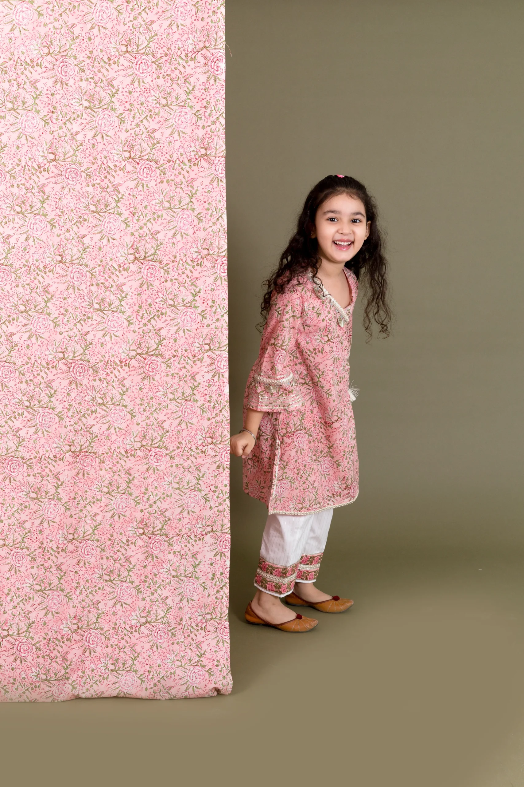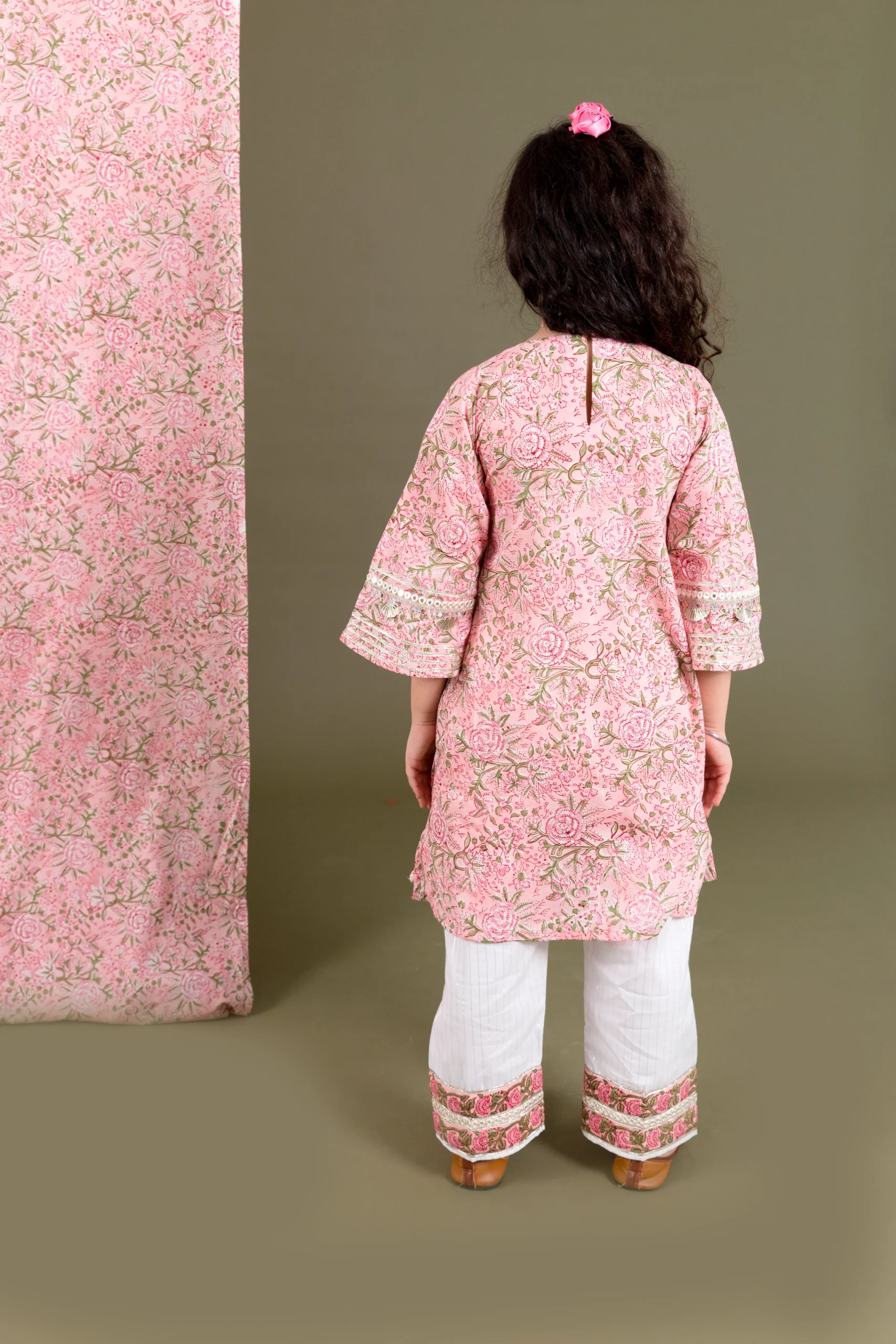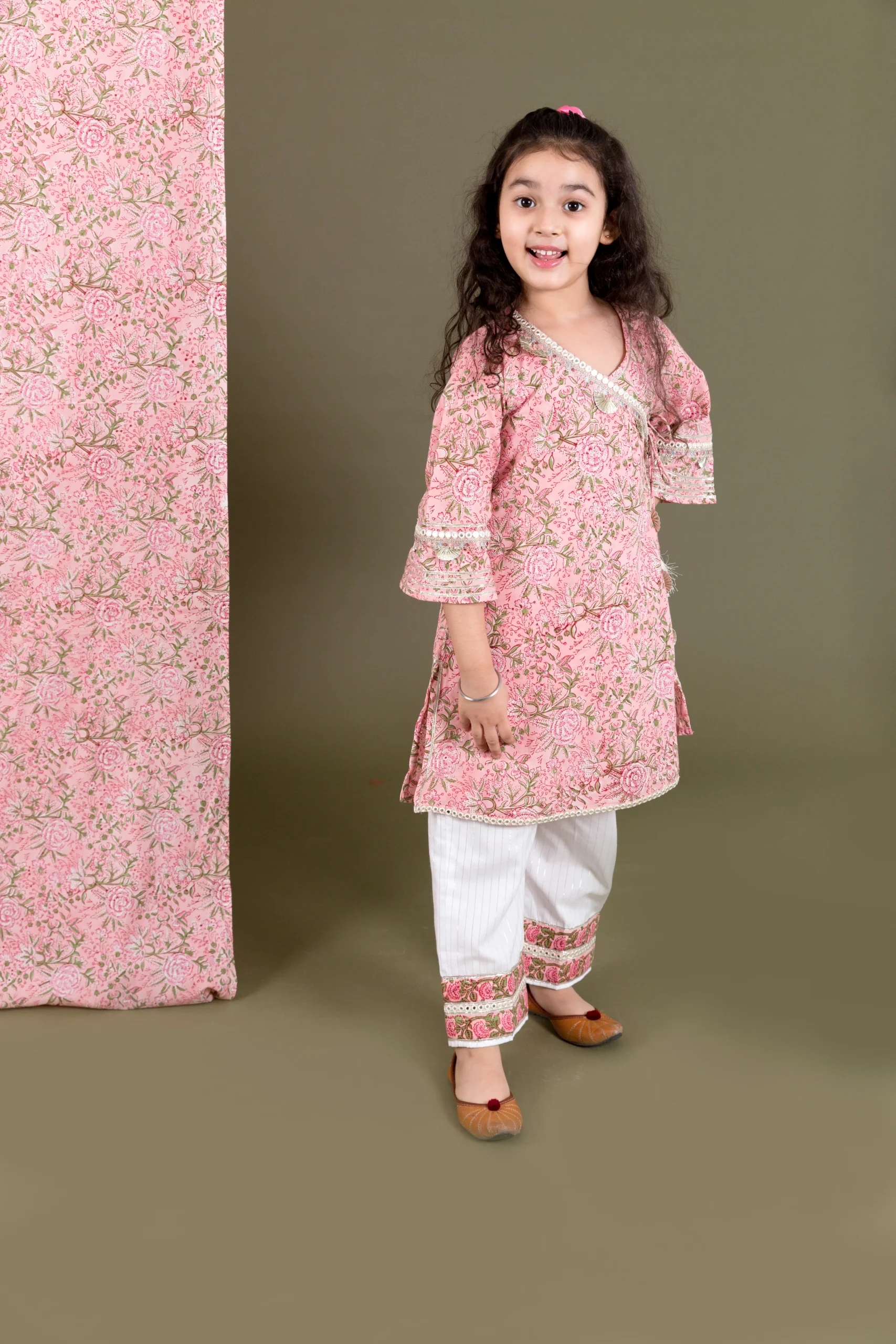 Introducing our charming Pink and Off-White Block Print Kurta with Pants Set, crafted in soft cotton for breathable comfort and effortless style. The Angrakha-style kurta features elegant neck detailing and three-fourth sleeves, adding a graceful touch to its traditional appeal. Lightweight and comfortable, this ensemble offers a relaxed yet refined silhouette, perfect for festive gatherings and everyday elegance.