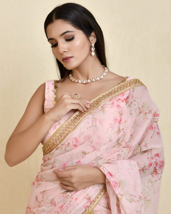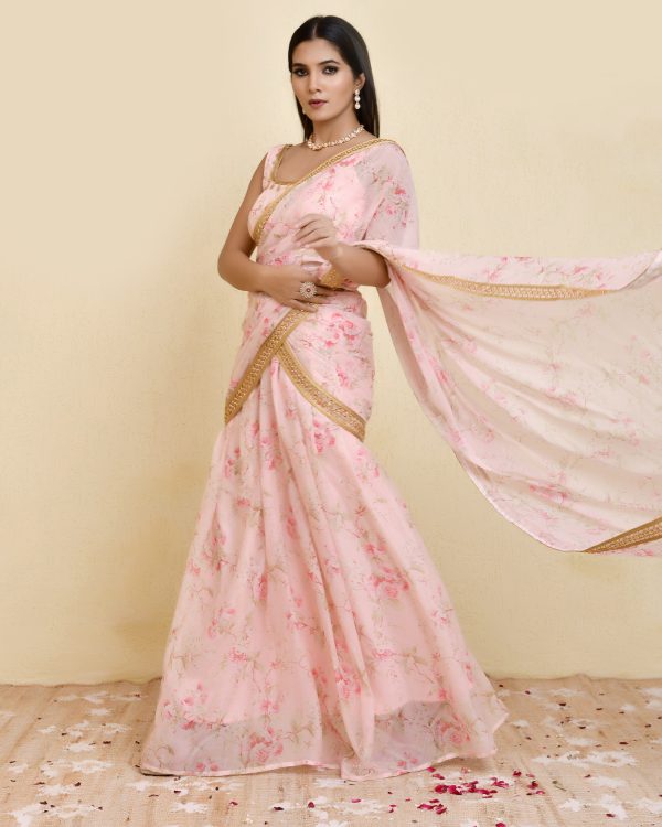 Introducing a Pink pre-draped printed georgette saree. Crafted in floral-printed georgette, the saree is finished with delicate lace border detailing that adds a refined touch. Paired with a matching sleeveless blouse, featuring lace detailing along the neckline and an elasticated back for a comfortable fit, this ensemble blends contemporary styling with graceful movement—perfect for festive occasions, celebrations, and elegant day-to-evening events.