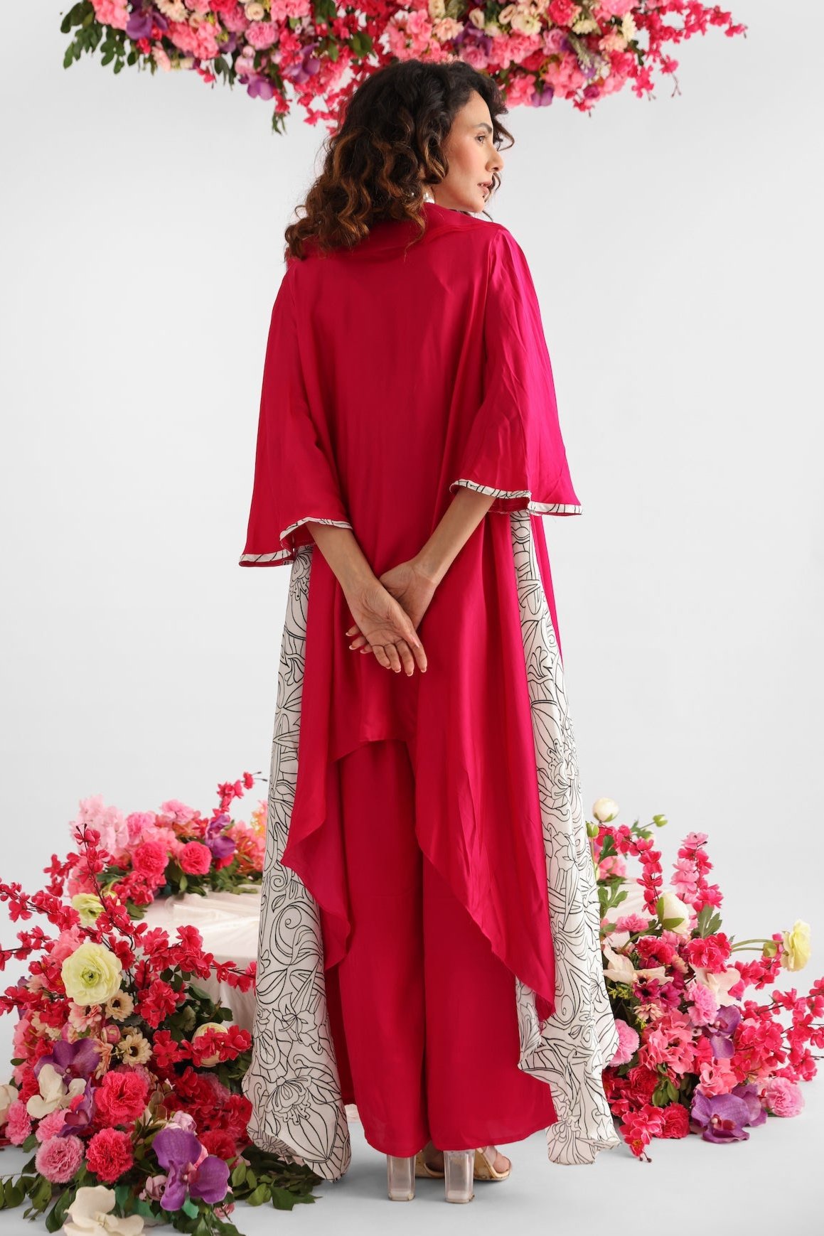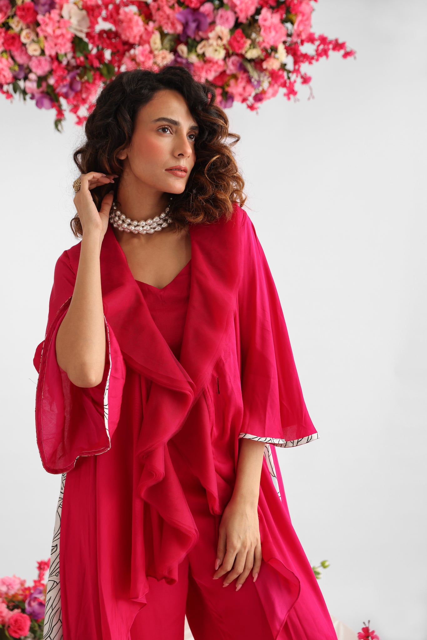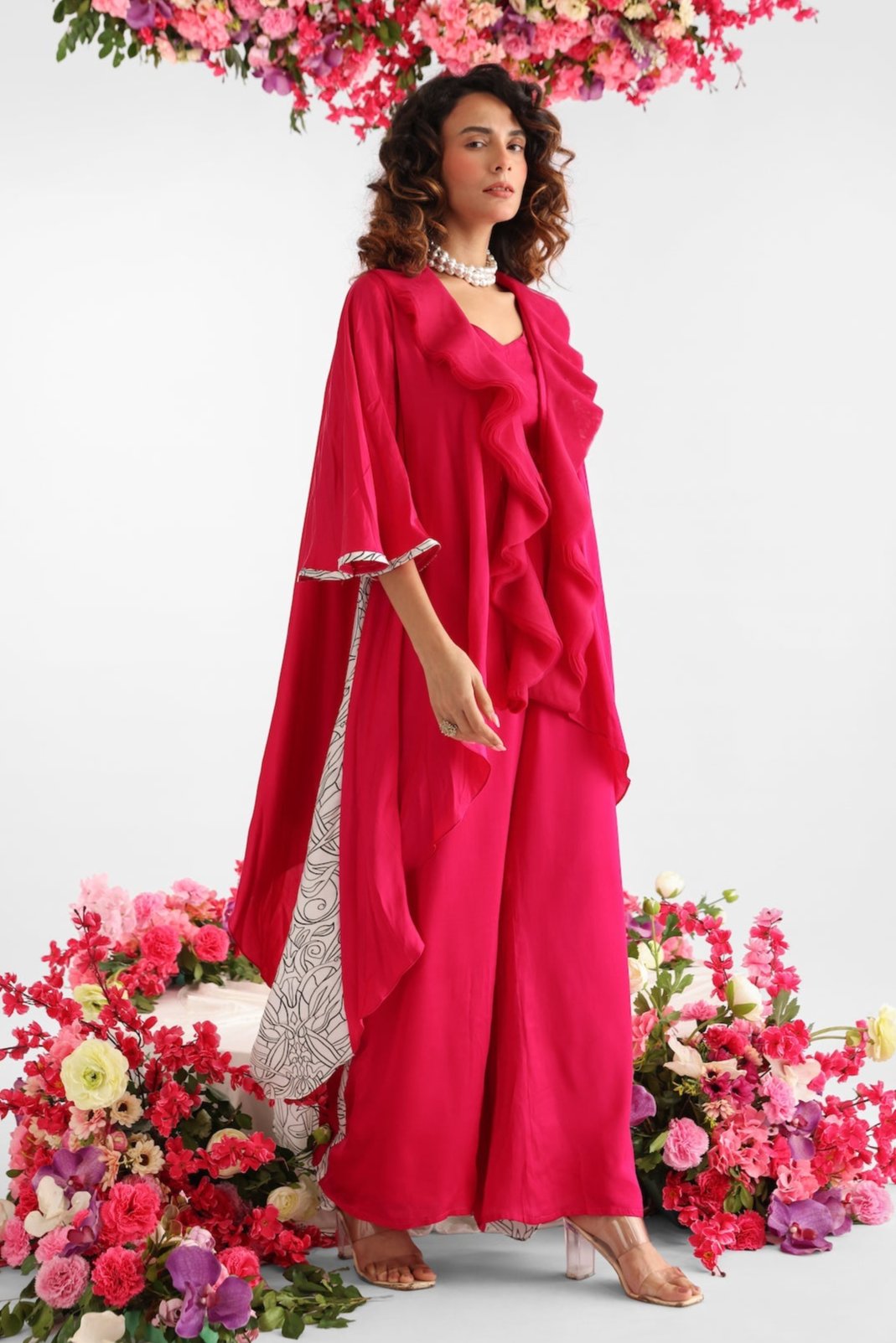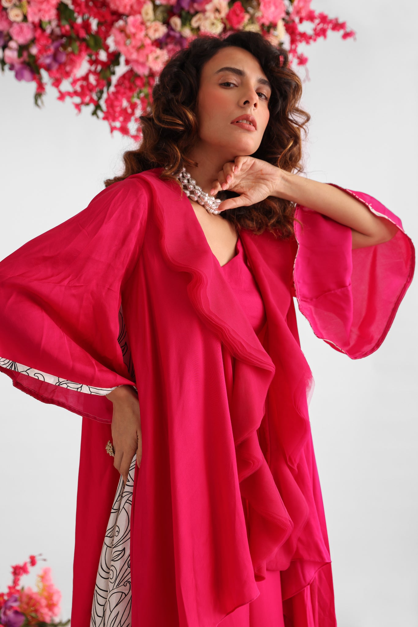 Golden Muslin presents the Pink Satin And Net Ruffle Long Jacket Set— an ethereal three-piece ensemble that captures the essence of modern romance and effortless sophistication. The highlight of the set is a flowy long jacket, crafted in luxurious Bamberg satin and adorned with dramatic net ruffles. Featuring exaggerated bell sleeves, the jacket moves beautifully with every step, adding volume, fluidity, and statement appeal. Underneath, a sleek crop top and high-waisted palazzo pants—both tailored in matching soft blush pink Bamberg satin—complete the look with grace and elegance. Perfect for summer brunches, soirées, or daytime celebrations, this lightweight and versatile set is designed to make you feel radiant and refined.