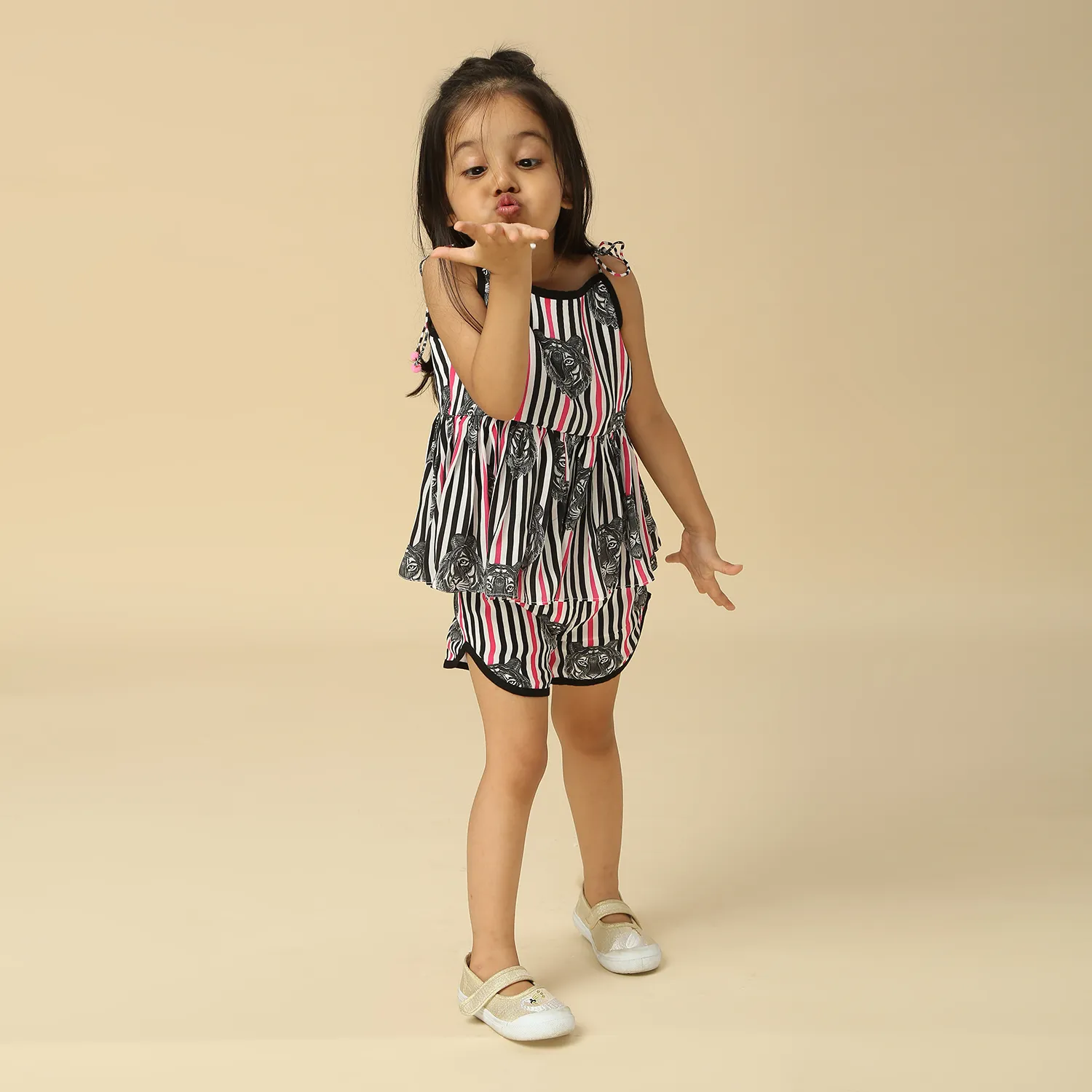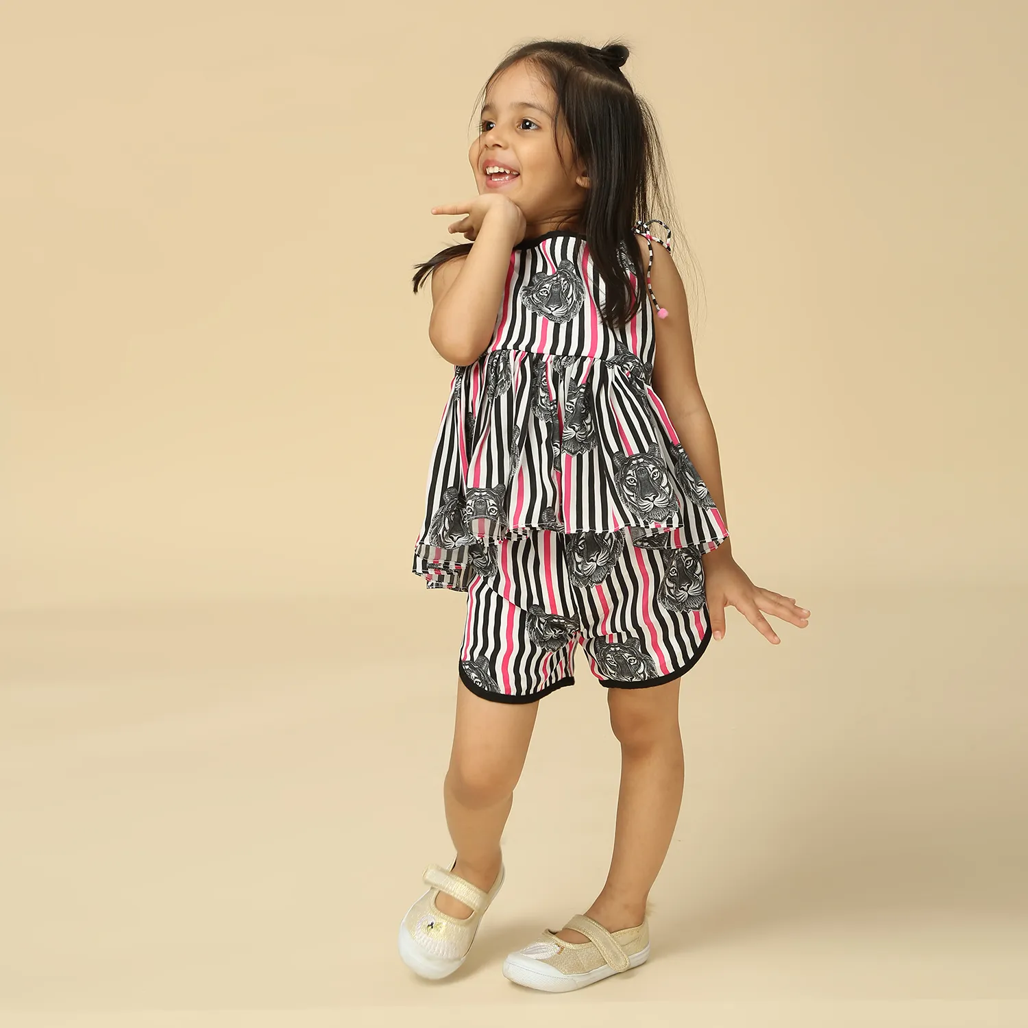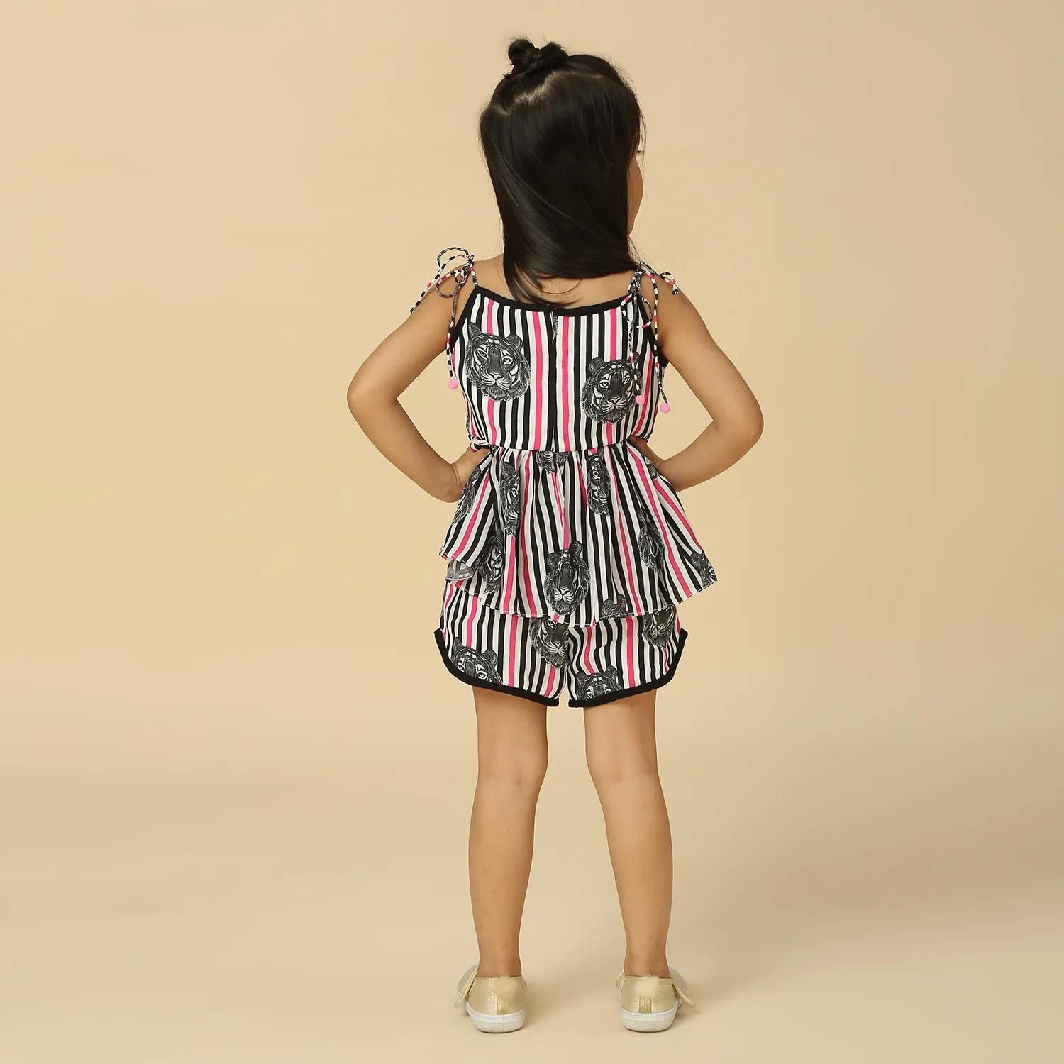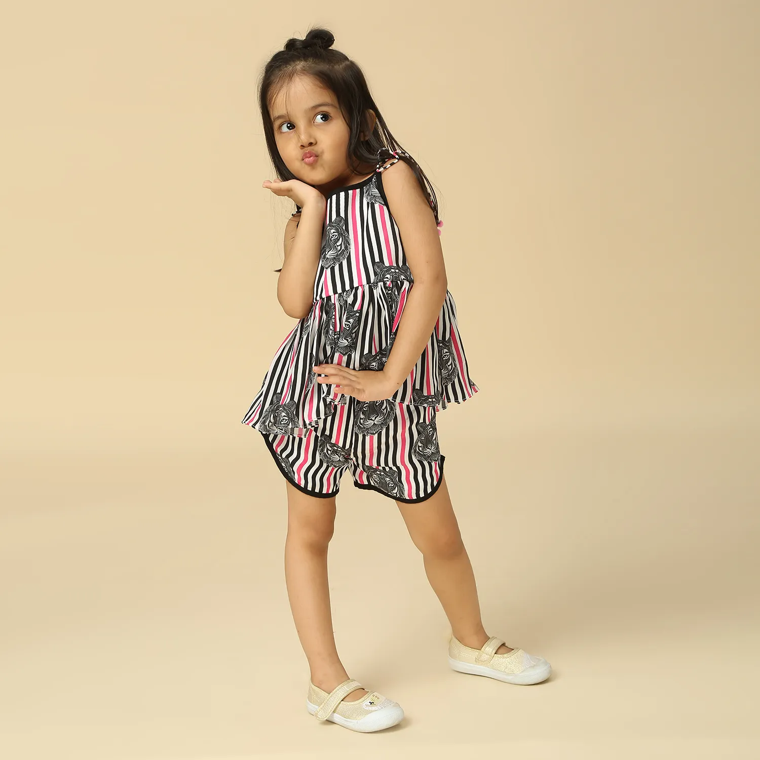 Introducing a stylish Pink Striped Peplum Top with Matching Shorts for girls. Crafted in soft viscose crepe, this playful co-ord set features a charming striped peplum top paired with comfortable matching shorts. Perfect for summer outings, holidays, casual gatherings, and everyday wear with a trendy and cheerful look.