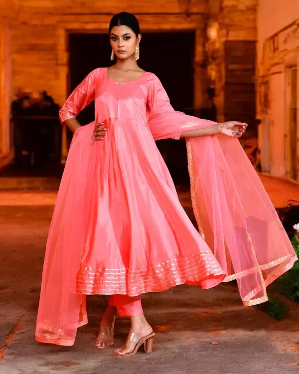 Pink Upadda Silk Anarkali Suit Set with Gota Work and Net Dupatta