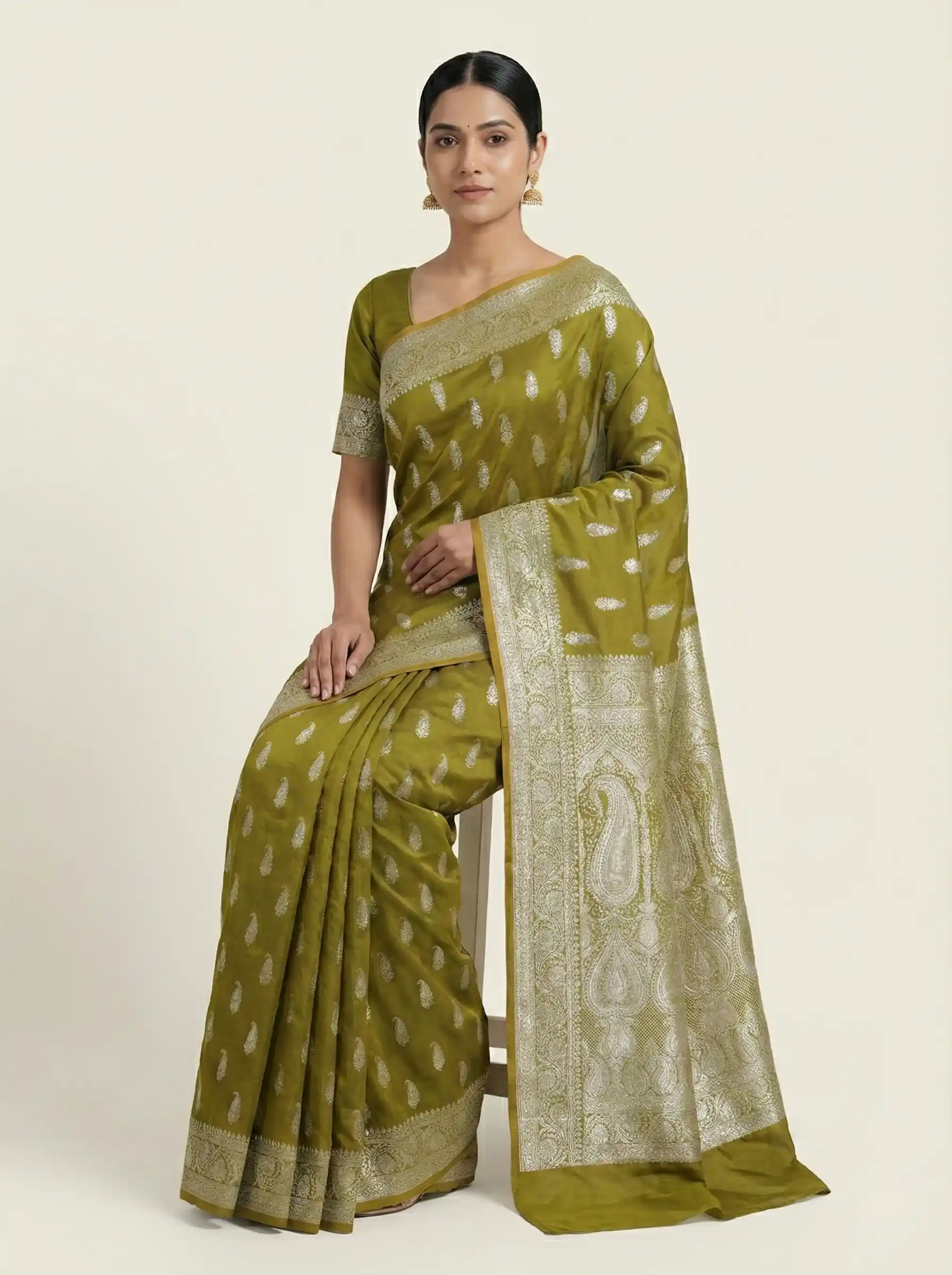 This pista green Mashroo silk saree is handwoven in Varanasi (Kashi), reflecting the timeless craftsmanship of Banarasi weavers. Inspired by the artistry of older times, it features a graceful texture and heritage charm. Designed by Naaritva Banaras, it includes one running blouse piece.