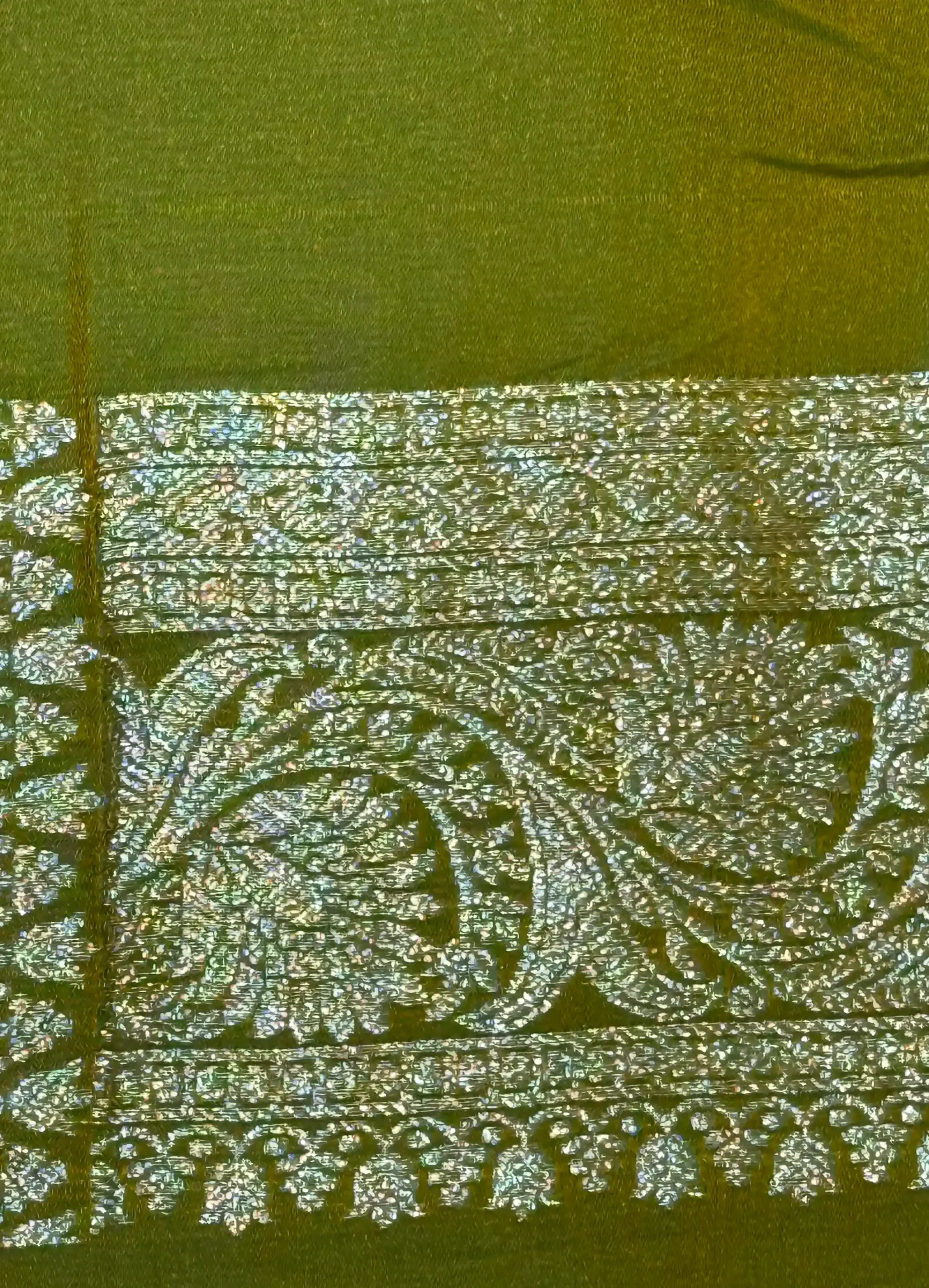 Dry clean only. Avoid liquids/perfumes. Store in cotton; refold often. Iron on reverse. No bleach, heat, or direct sunlight.