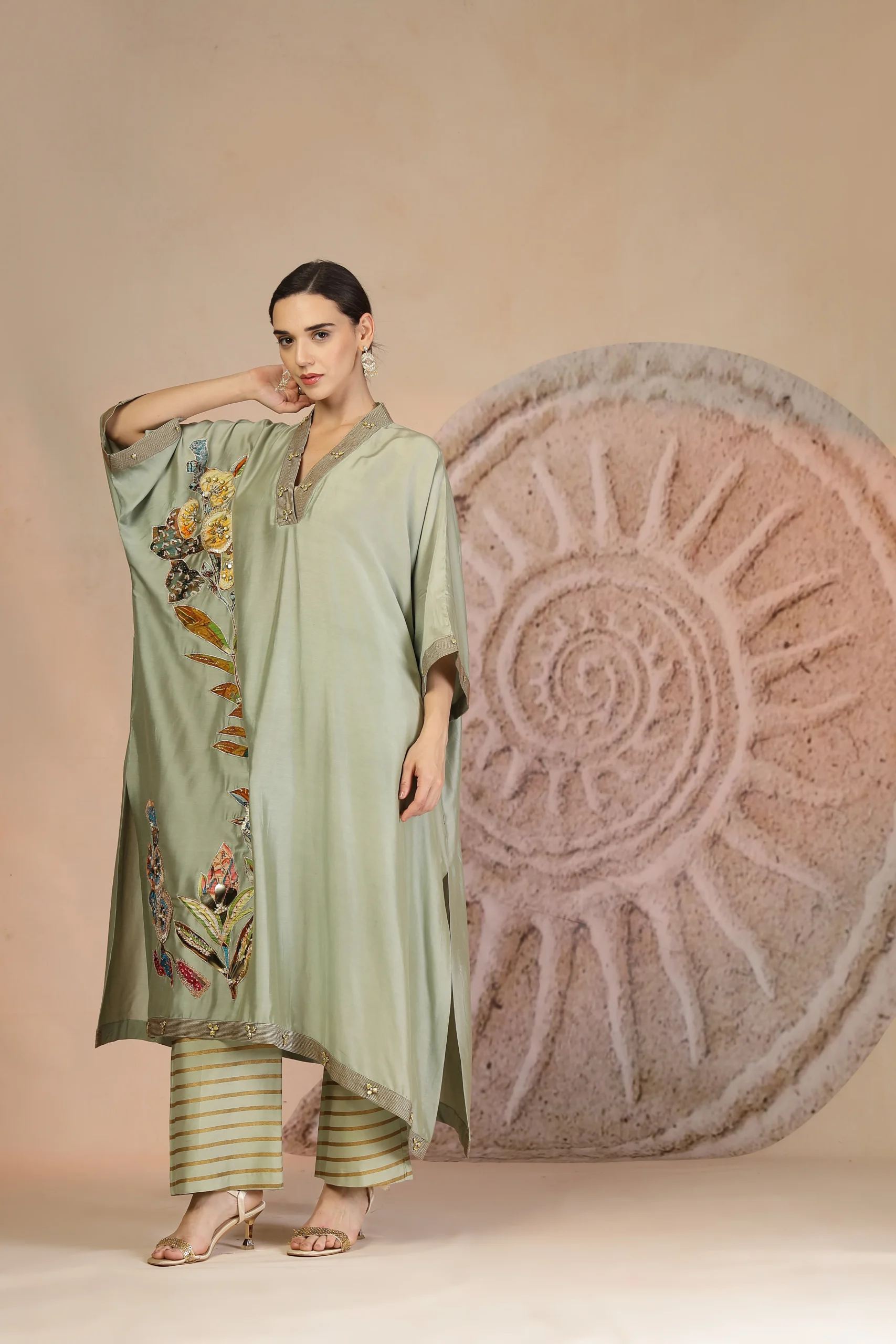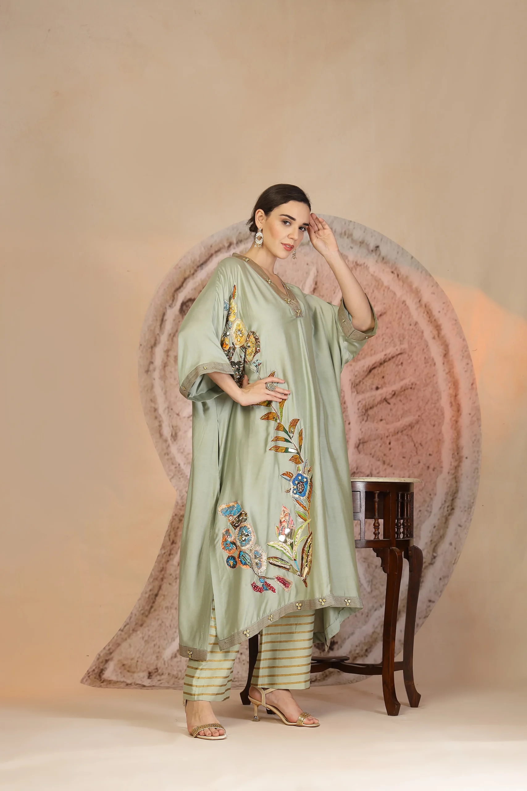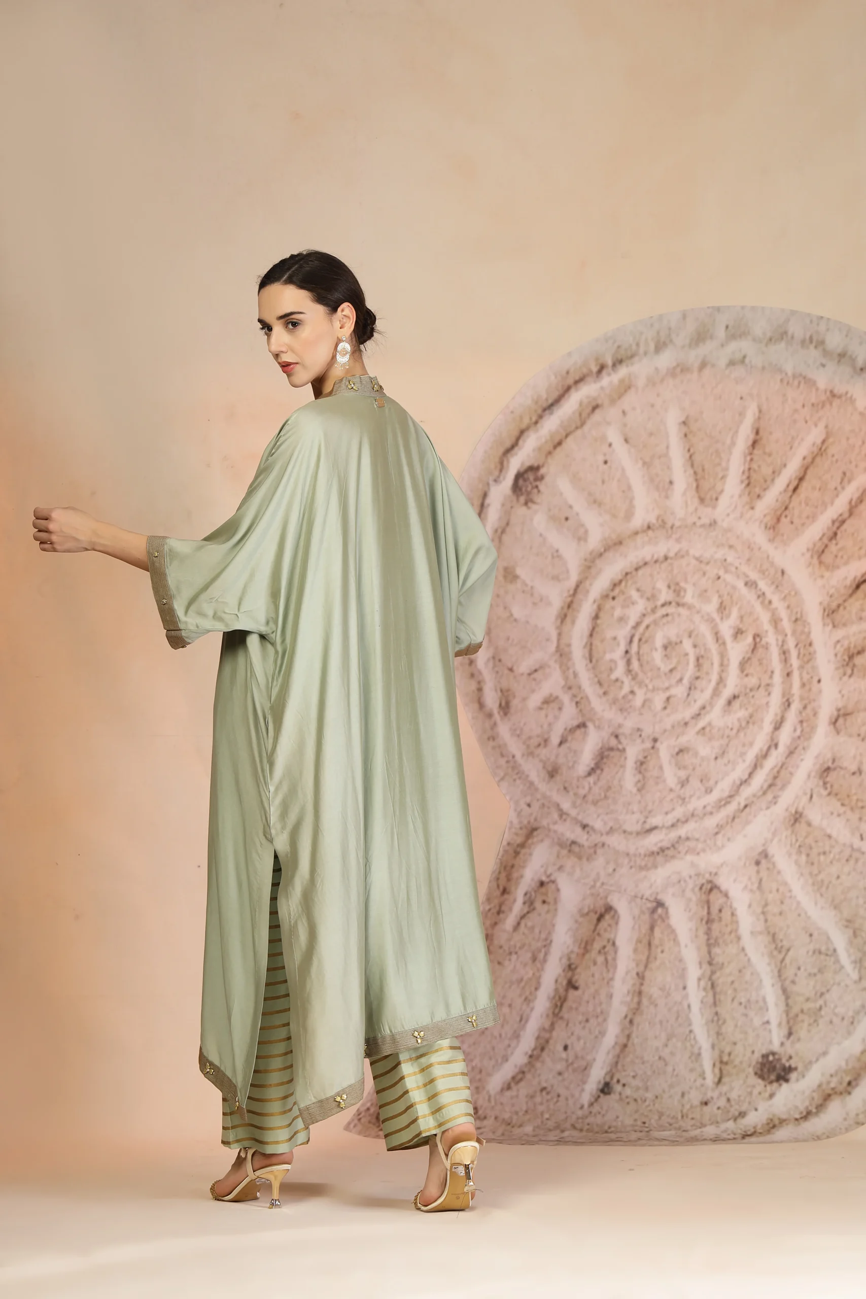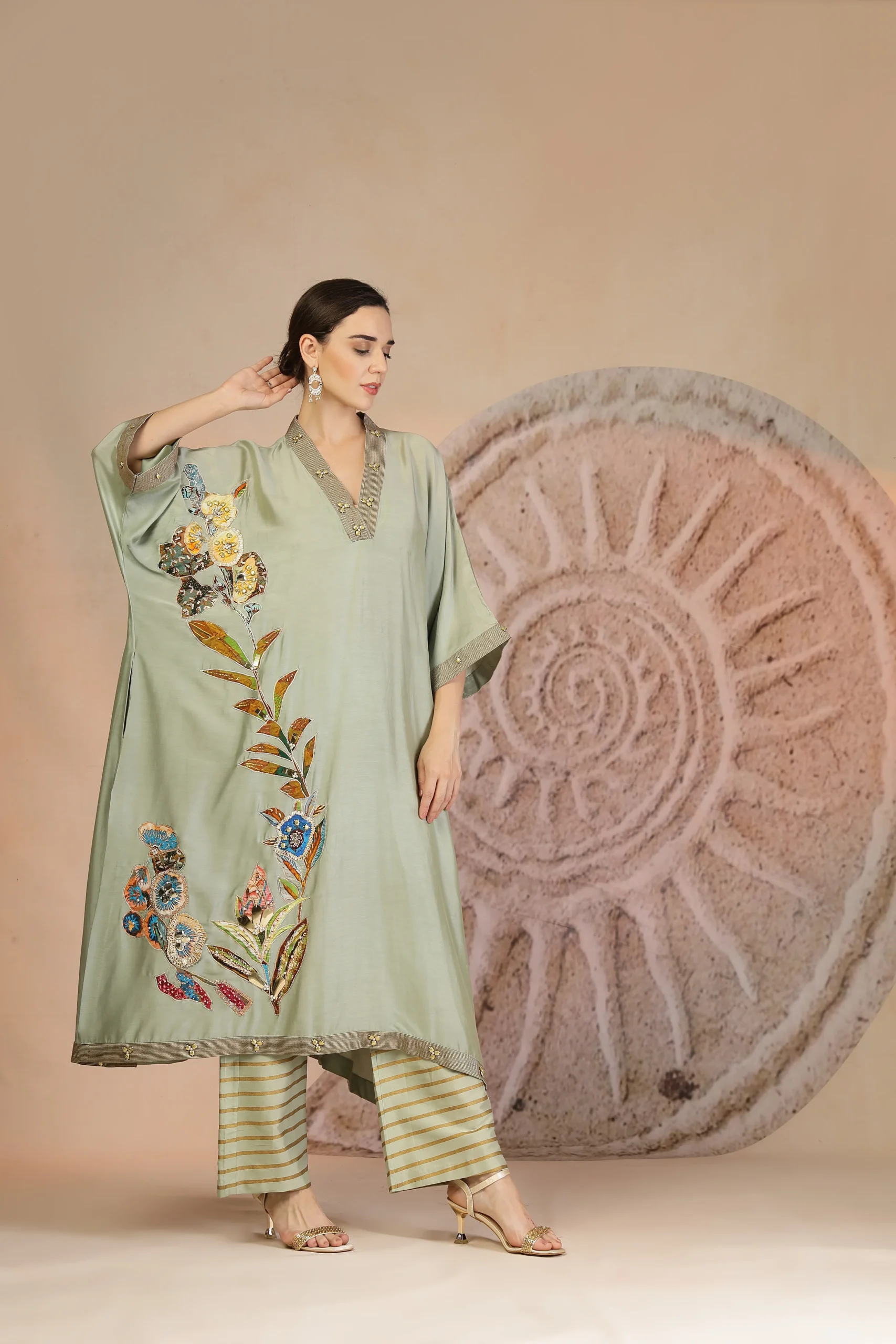 introducing a contemporary pista green ensemble crafted in luxurious muslin silk for effortless elegance. The anti-fit kurta is highlighted with a graceful trail of embroidery patchwork flowing across the silhouette, accented by subtle threadwork and metallic bead detailing on the collar and hem. Paired with horizontally striped wide-leg pants, this refined yet relaxed set offers modern charm with artisanal finesse—perfect for elevated daywear and understated festive occasions.