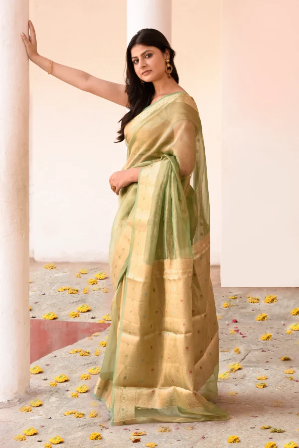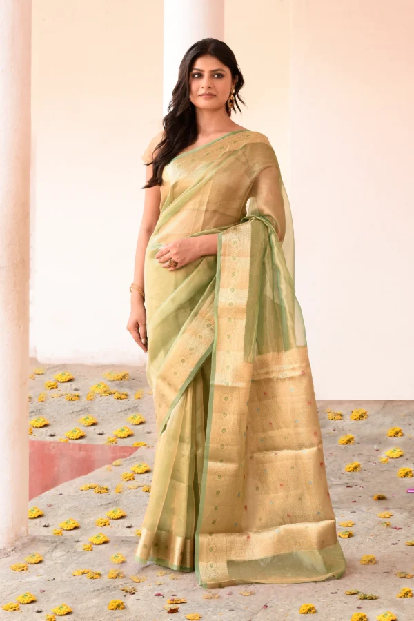 Introducing a Pistachio Green Banarasi silk saree that exudes understated charm and refined elegance. The soft base features subtle woven motifs, enhanced by a rich antique gold border and an intricately detailed palla in classic Banarasi patterns, highlighted with fine antique gold zari. Comes with a matching running blouse piece.