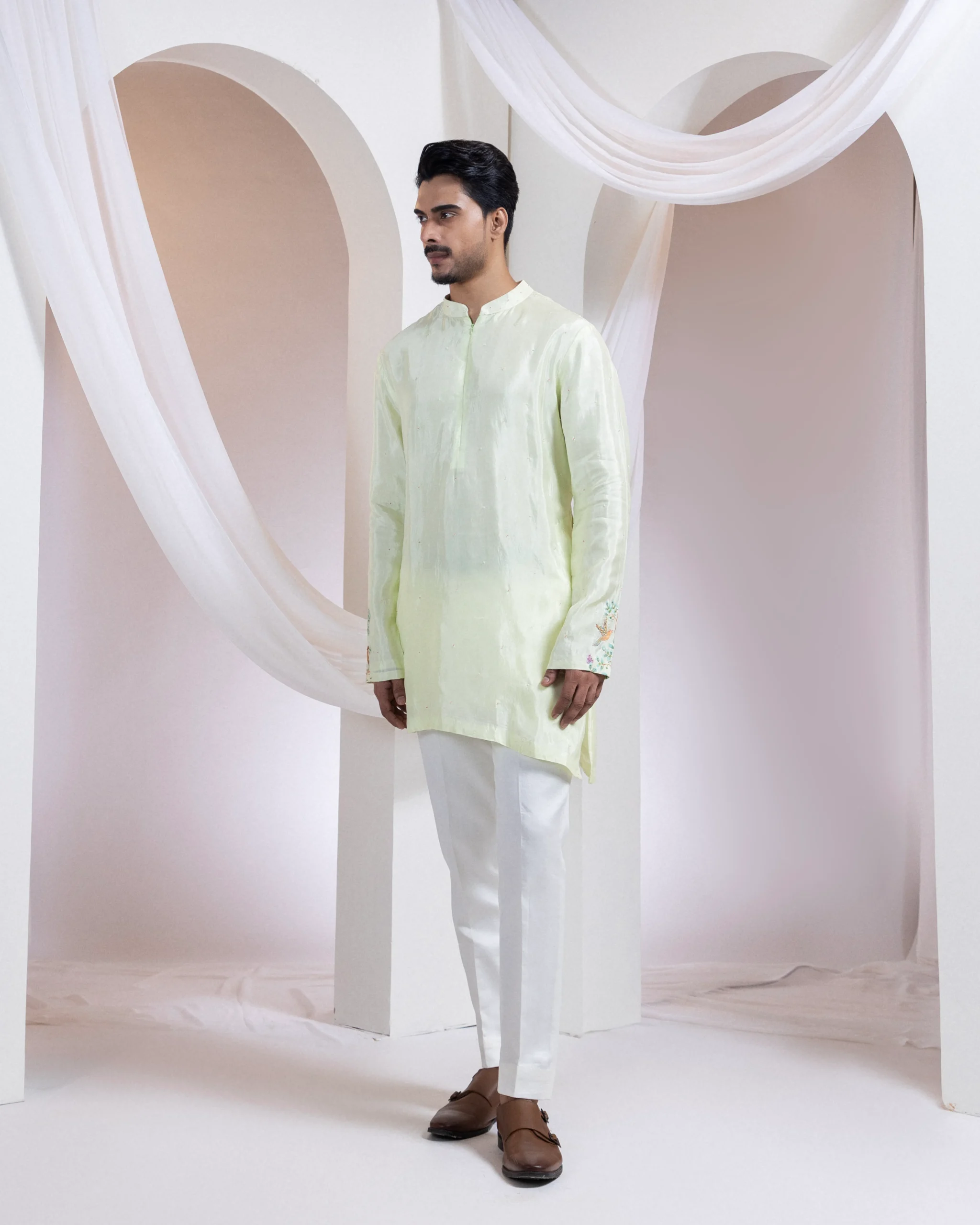 Introducing a light pistachio green kurta set designed in silk fabric with delicate scattered thread and bead work for a refined minimal appeal. Subtle hand-painted bird and foliage motifs gracefully peek from the cuffs, highlighted with golden thread, sequins, and bead accents. Paired with white cotton pants for daytime festivities and intimate celebrations.