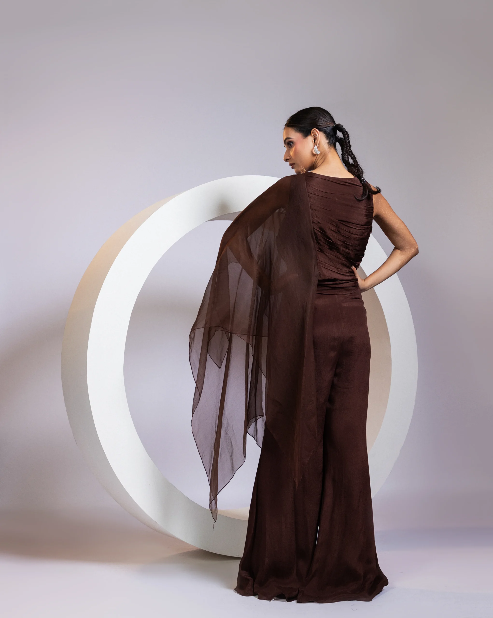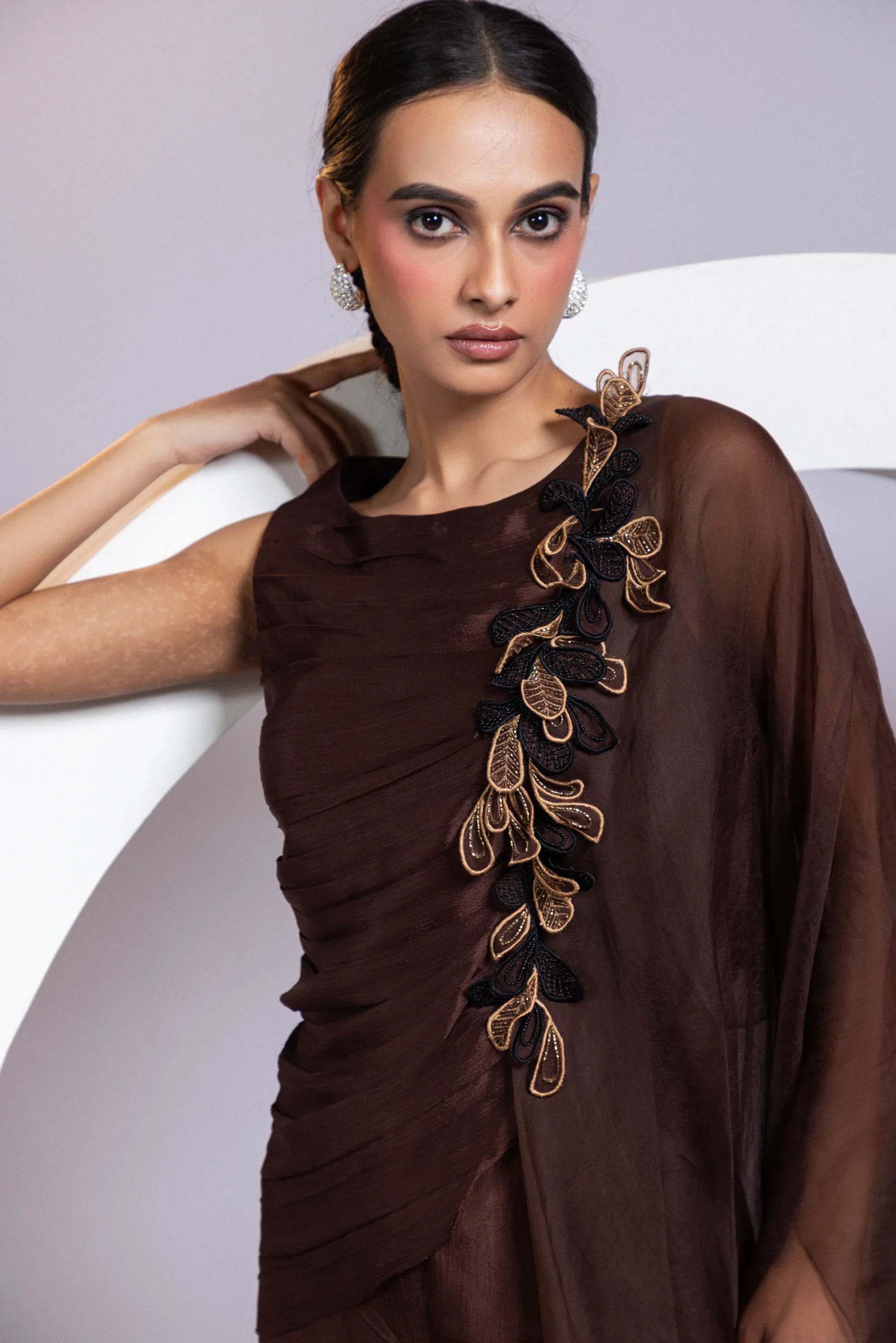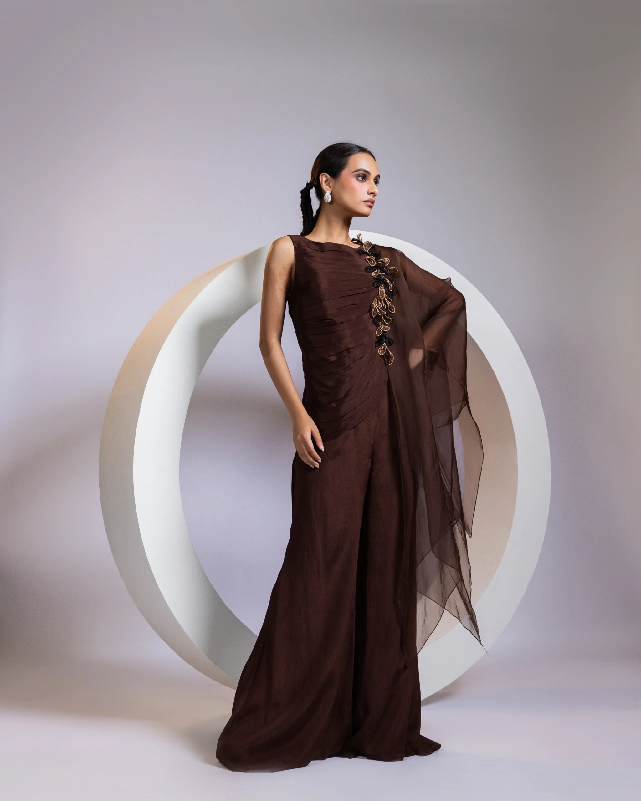 A two-piece ensemble featuring a pleated draped top with floral appliqué on one side, paired with wide flowy palazzo pants. An attached one-sided cape-like panel flows seamlessly from the top, adding soft movement and dimension. Airy, elegant, and delicately detailed—ideal for mehendi functions, day events, and modern festive occasions.