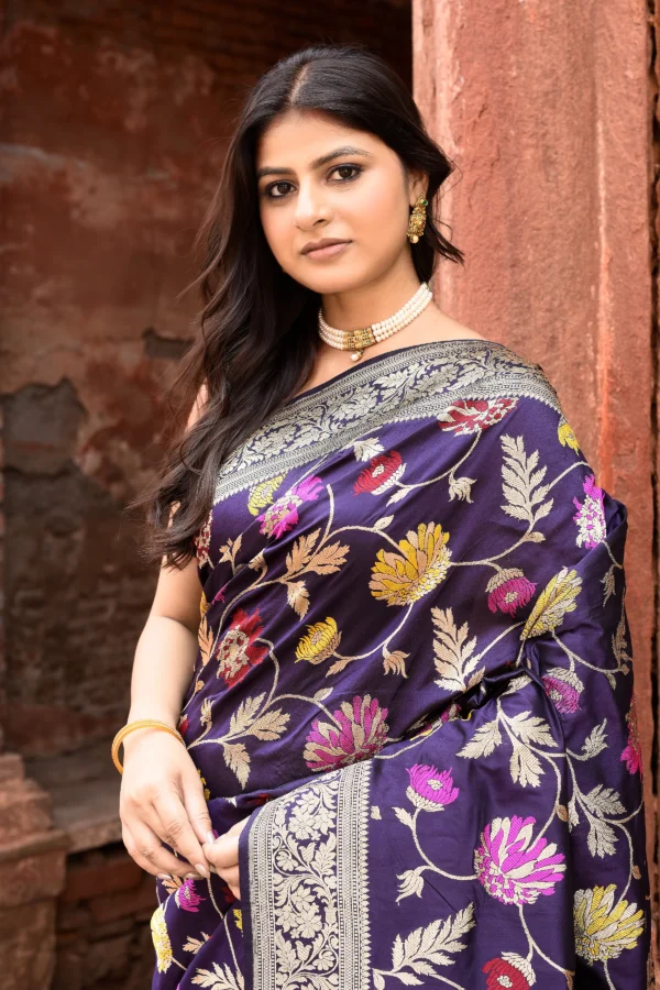 Introducing a Plum Purple Banarasi silk saree crafted with timeless Indian artistry. The deep purple base features vibrant multicolour floral motifs, enhanced by an ivory-gold border and richly detailed palla. Accented with antique gold and silver zari, it offers a luxurious shimmer. Comes with a matching running blouse piece.