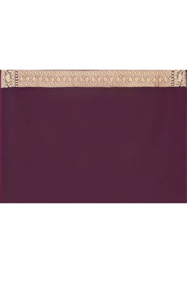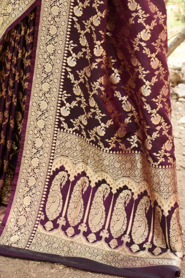 Introducing a plum purple Banarasi soft silk saree, handwoven in Kashi with refined elegance. Adorned with all-over floral jaal formed by delicately woven flower bels in silver zari, enhanced with subtle gold zari accents, it is finished with a traditional gold zariwoven border and palla. Comes with a matching running blouse piece.