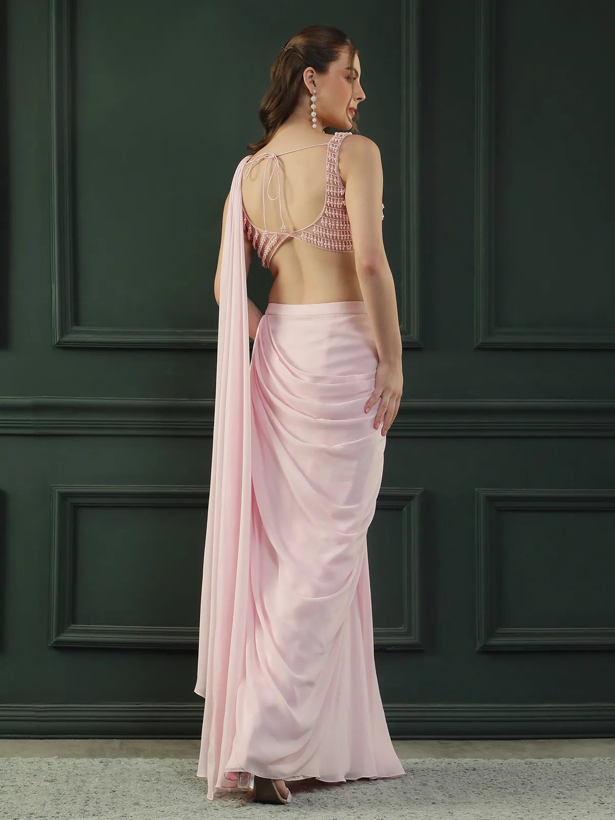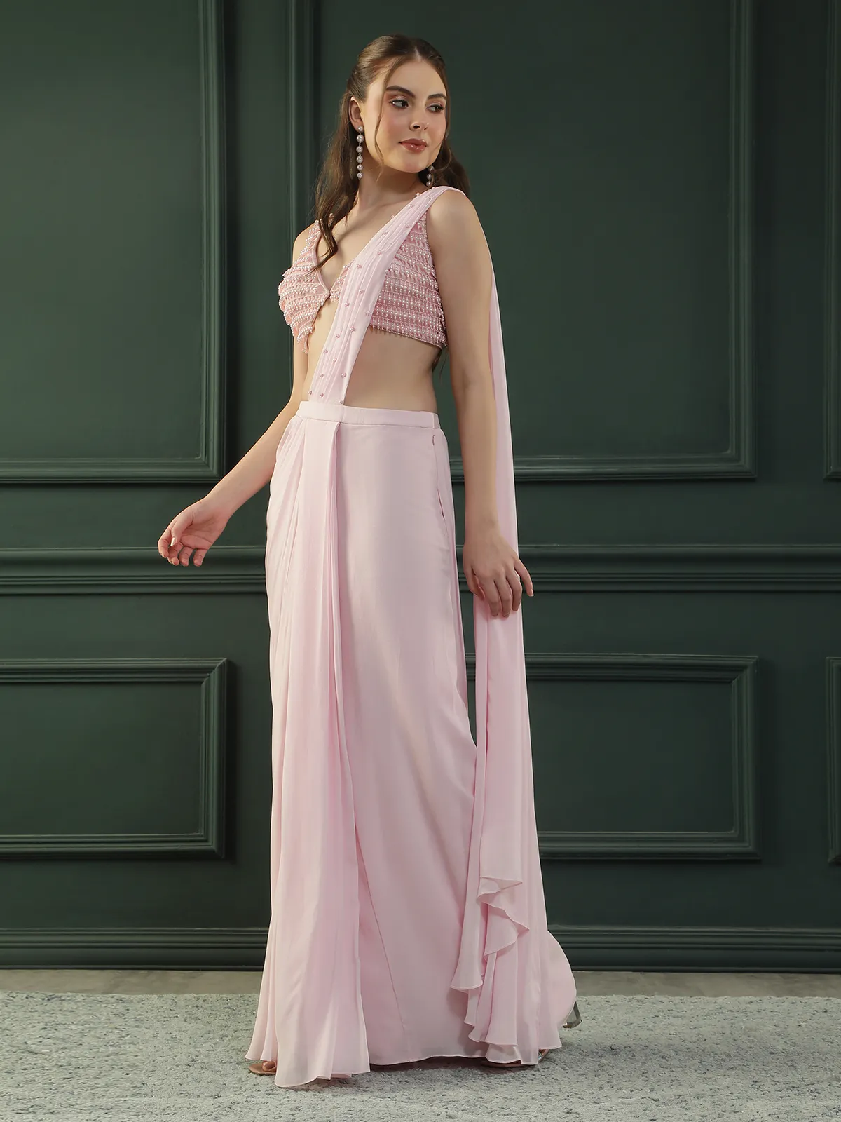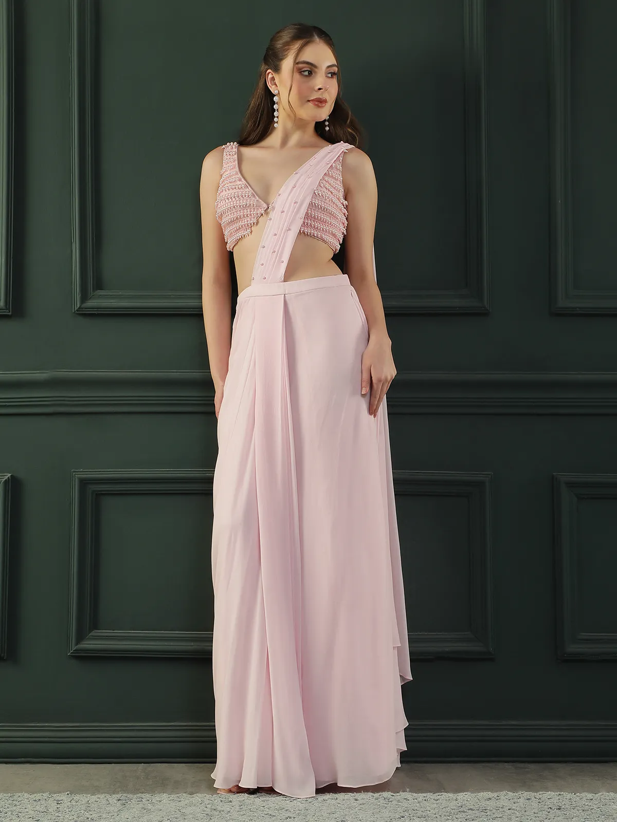 Introducing a graceful Powder Pink Pre-Draped Georgette Saree designed with a fluid, soft-drape silhouette that exudes effortless glamour. Paired with a delicately hand-embellished pink pearl blouse, this elegant ensemble beautifully blends modern sensuality with refined sophistication, making it perfect for weddings, cocktail evenings, and festive celebrations.