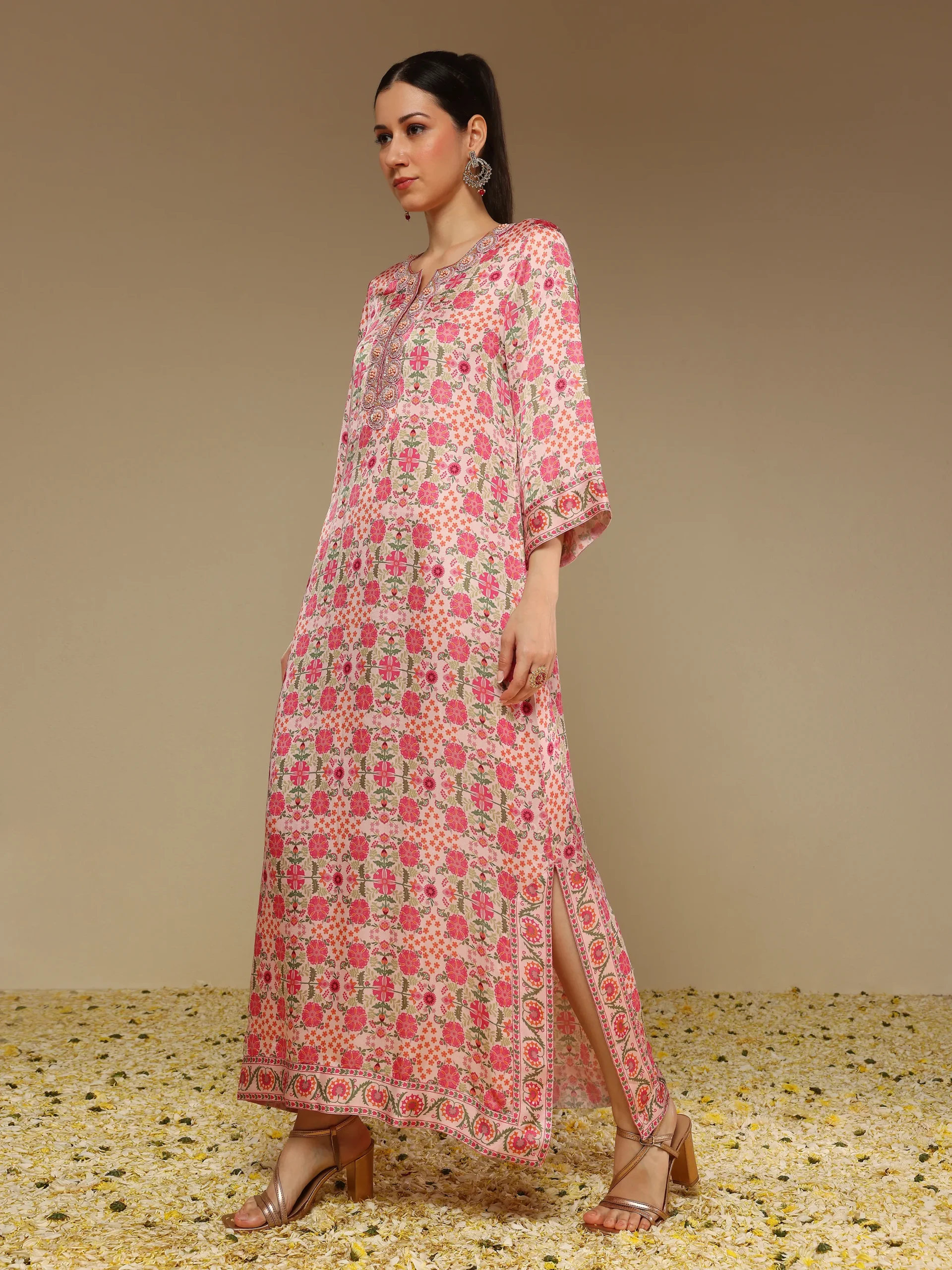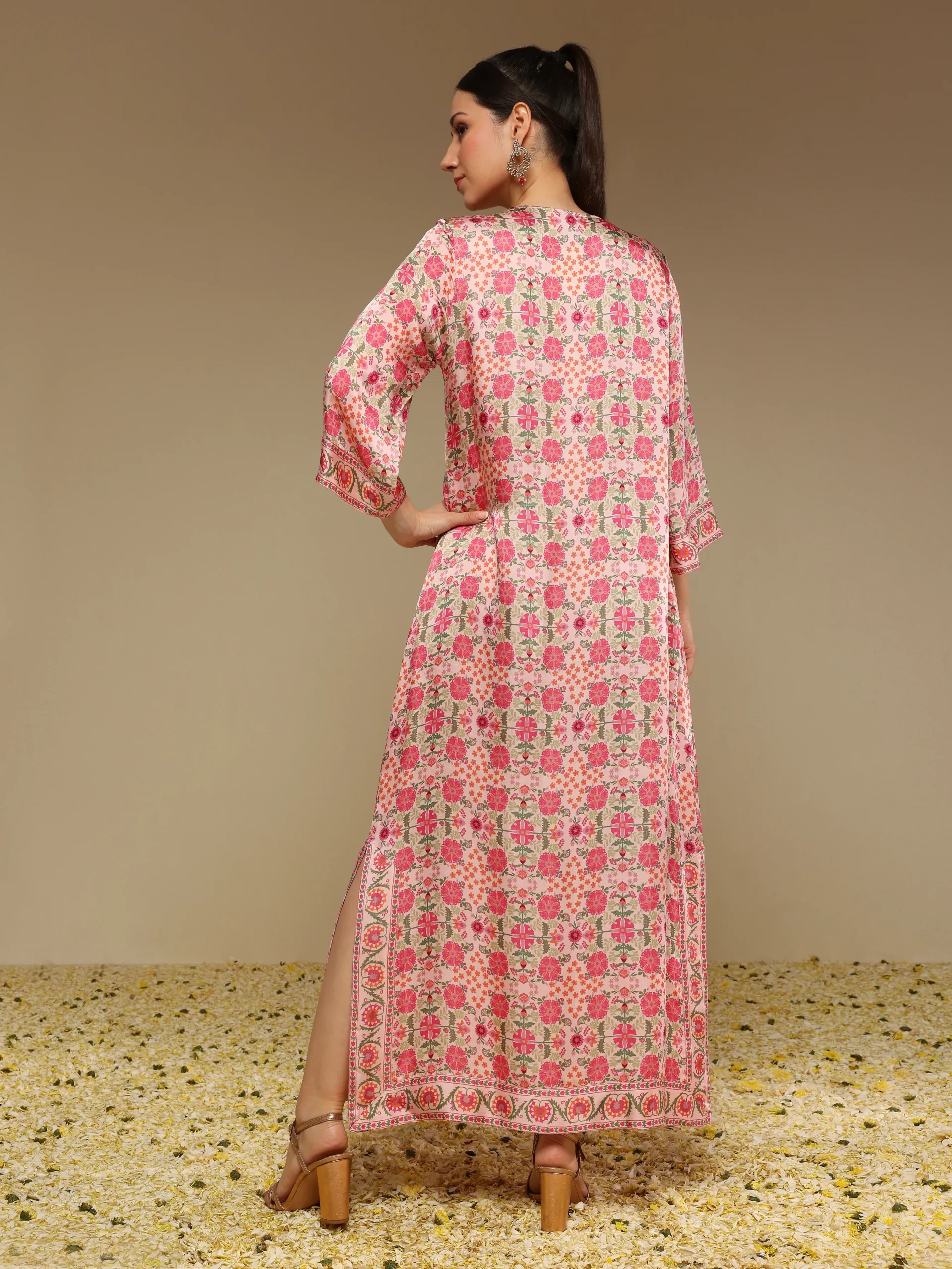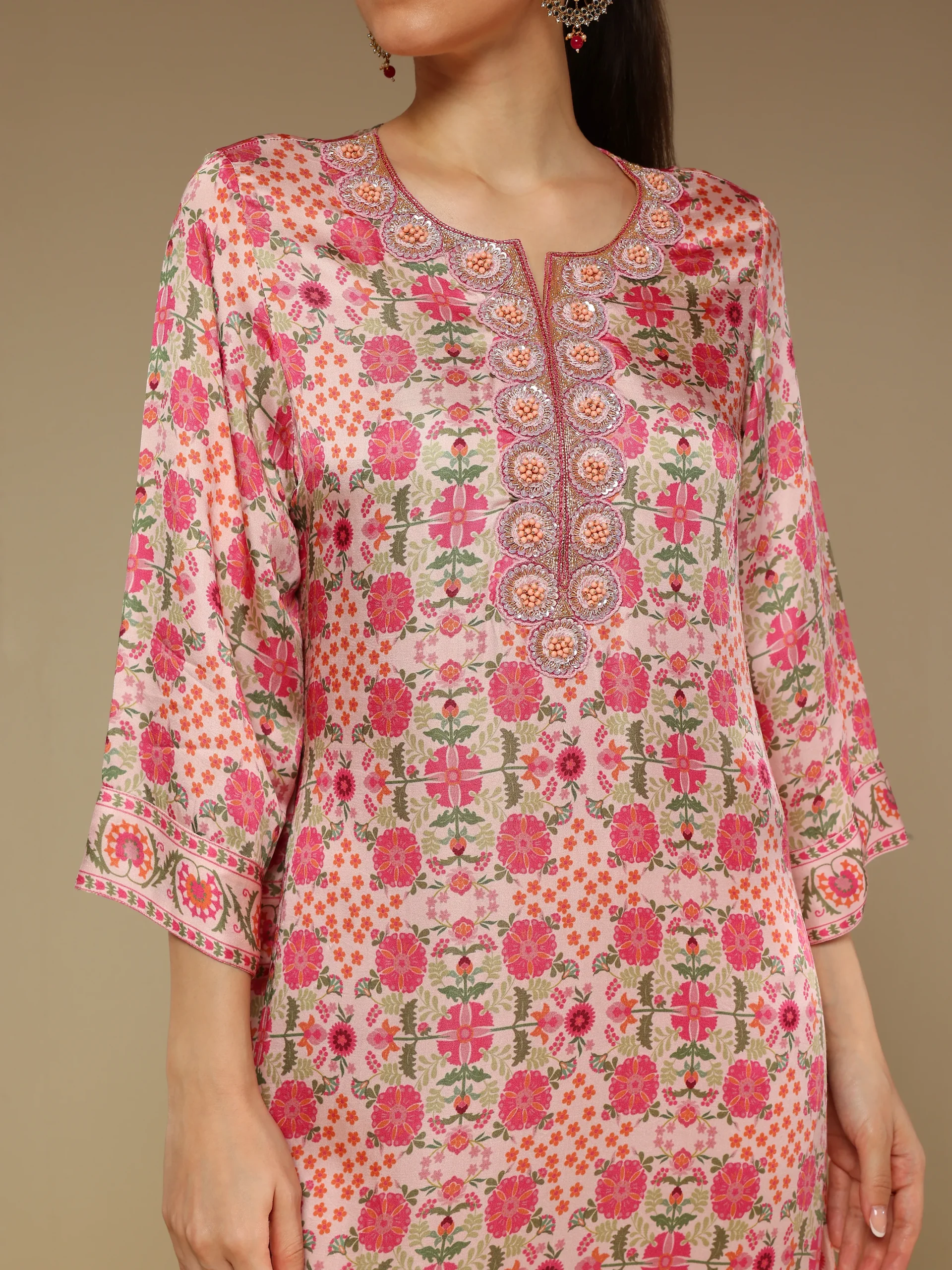 Introducing the printed long kurta crafted in smooth satin linen, featuring intricate hand embroidery and elegant side slits for ease of movement. Designed with a high round neck and full sleeves, this piece offers a refined blend of comfort and sophistication, perfect for both daywear and festive styling.