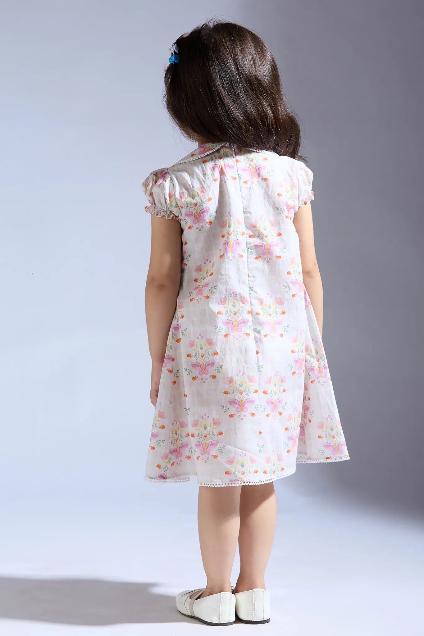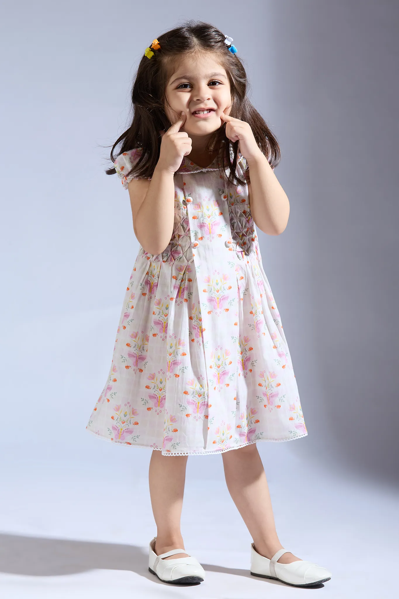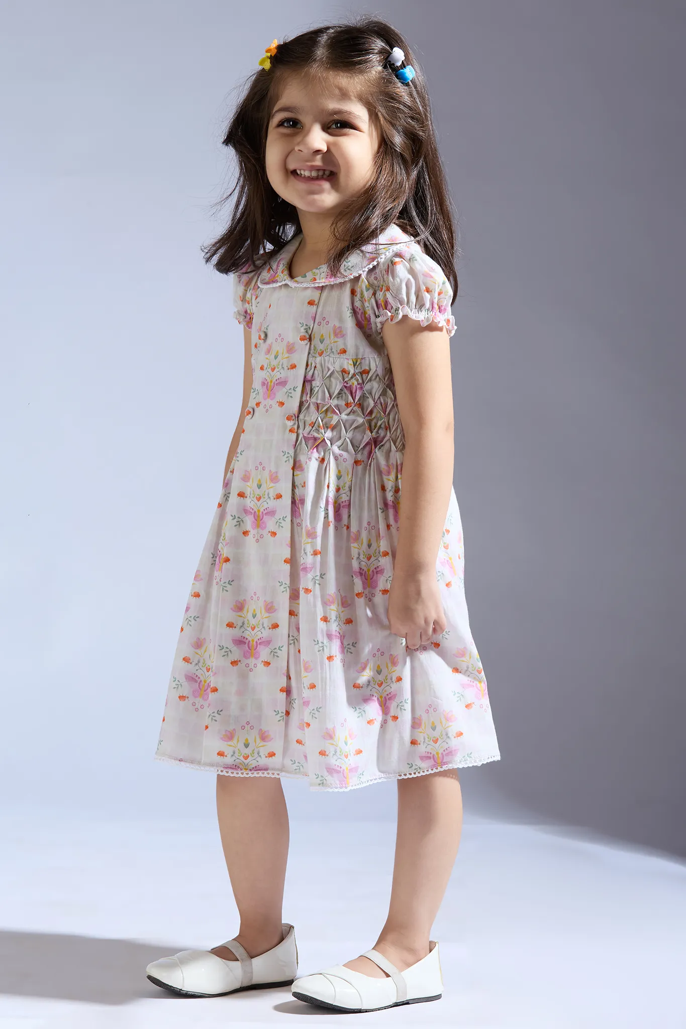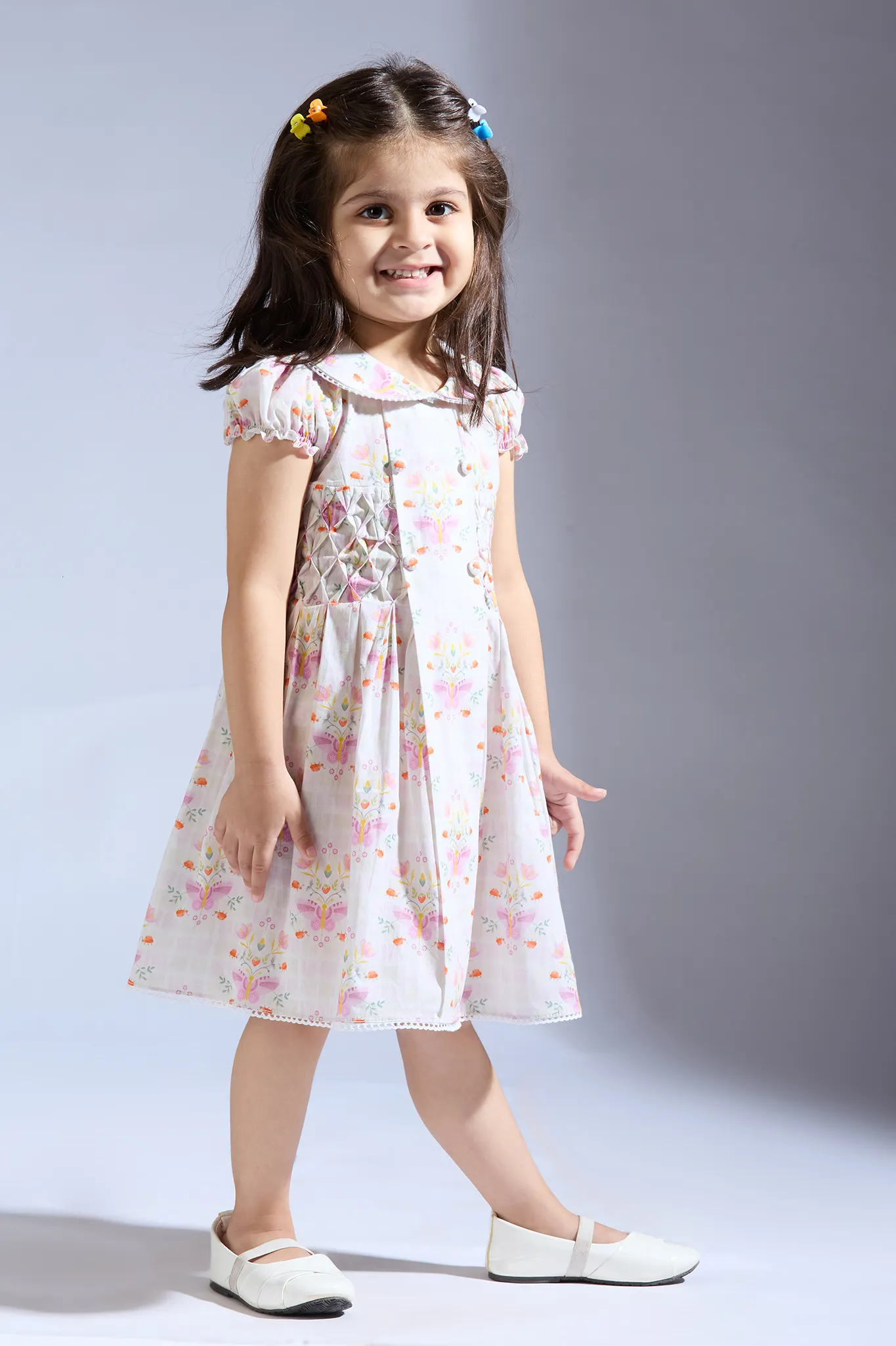 Introducing a charming Printed Cambric Smocked Dress for girls, featuring a classic collar and short sleeves. Crafted in soft and breathable cambric, this dress is enhanced with delicate smocking details on the center front, making it perfect for summer outings, casual wear, holidays, and everyday comfort with style.