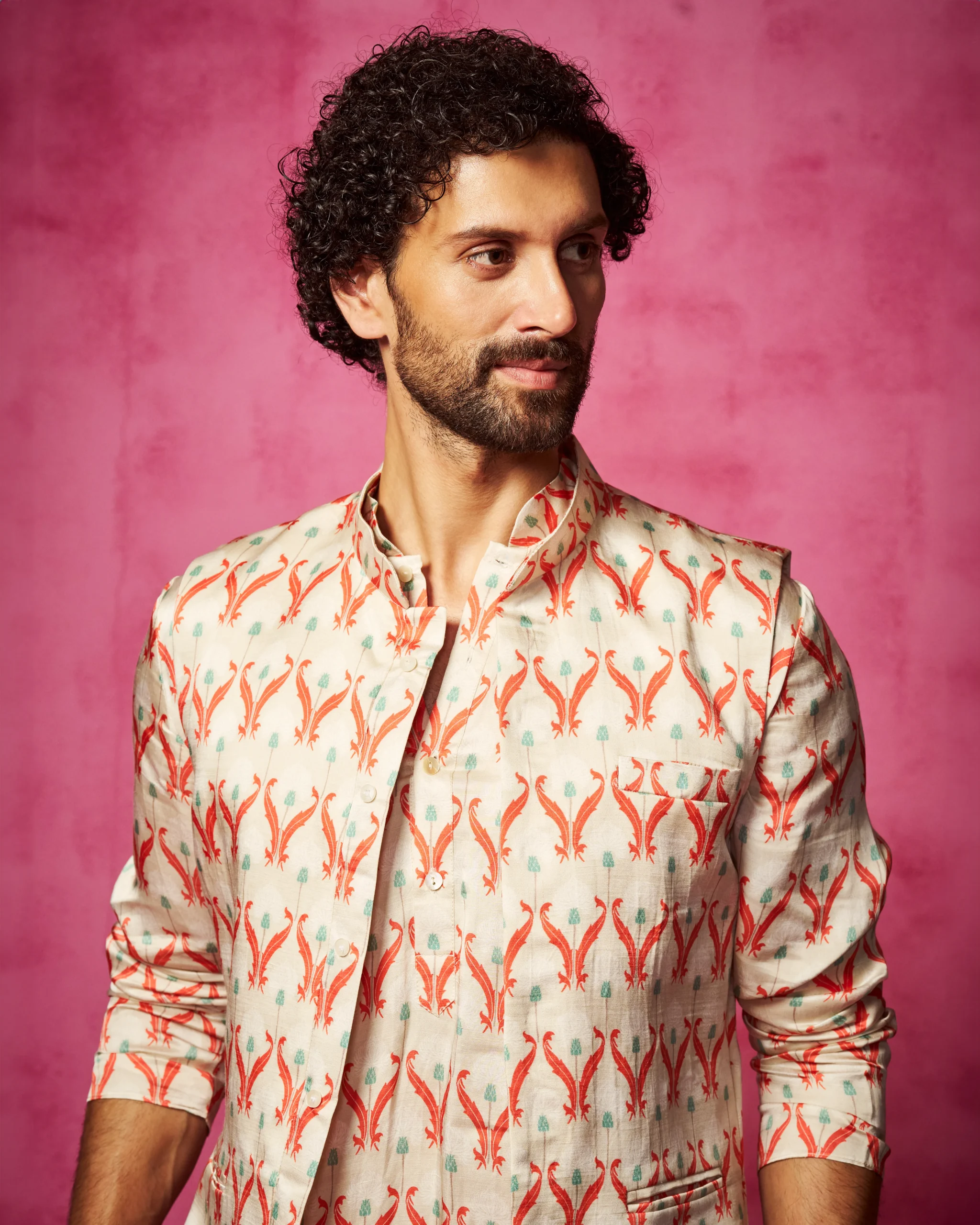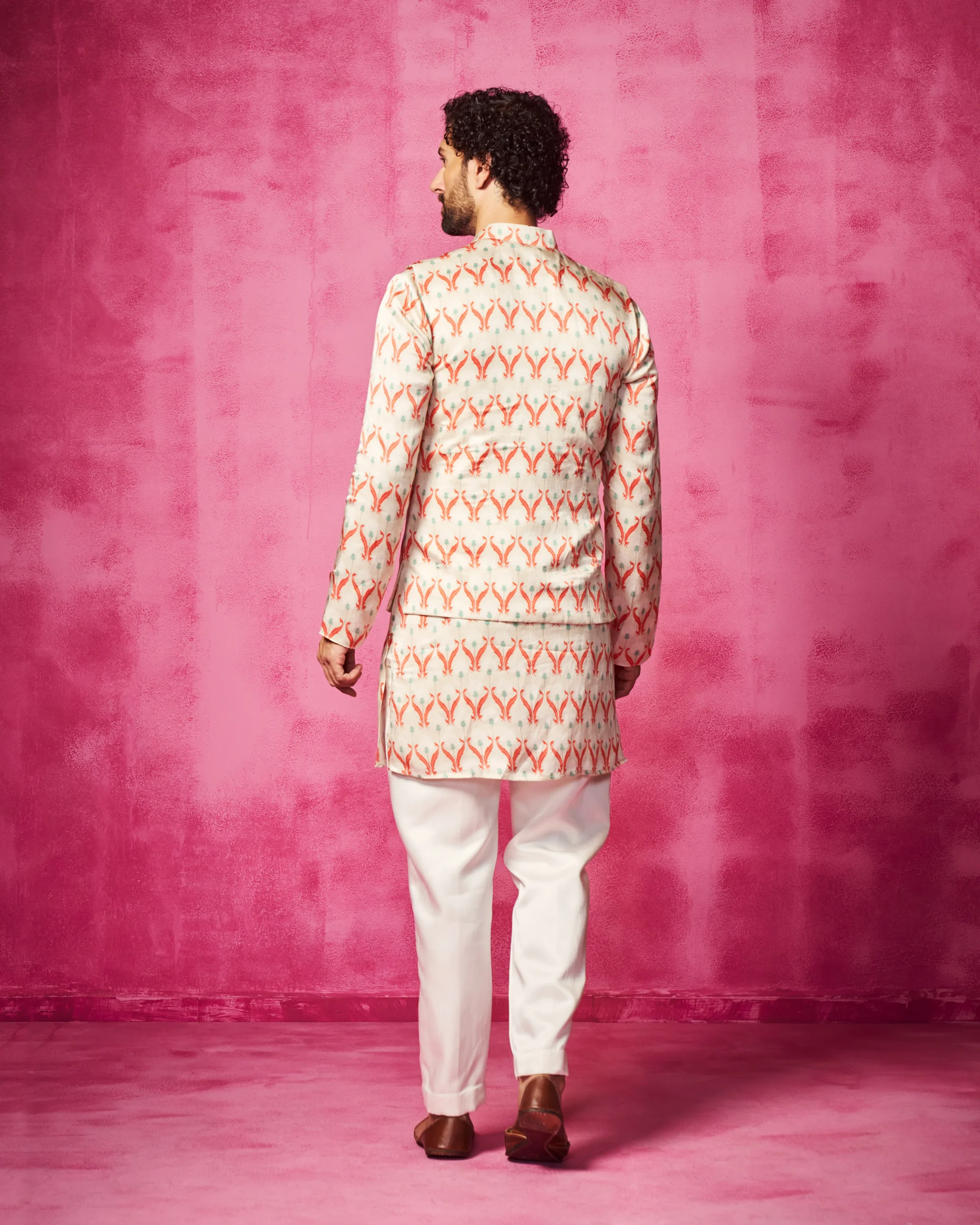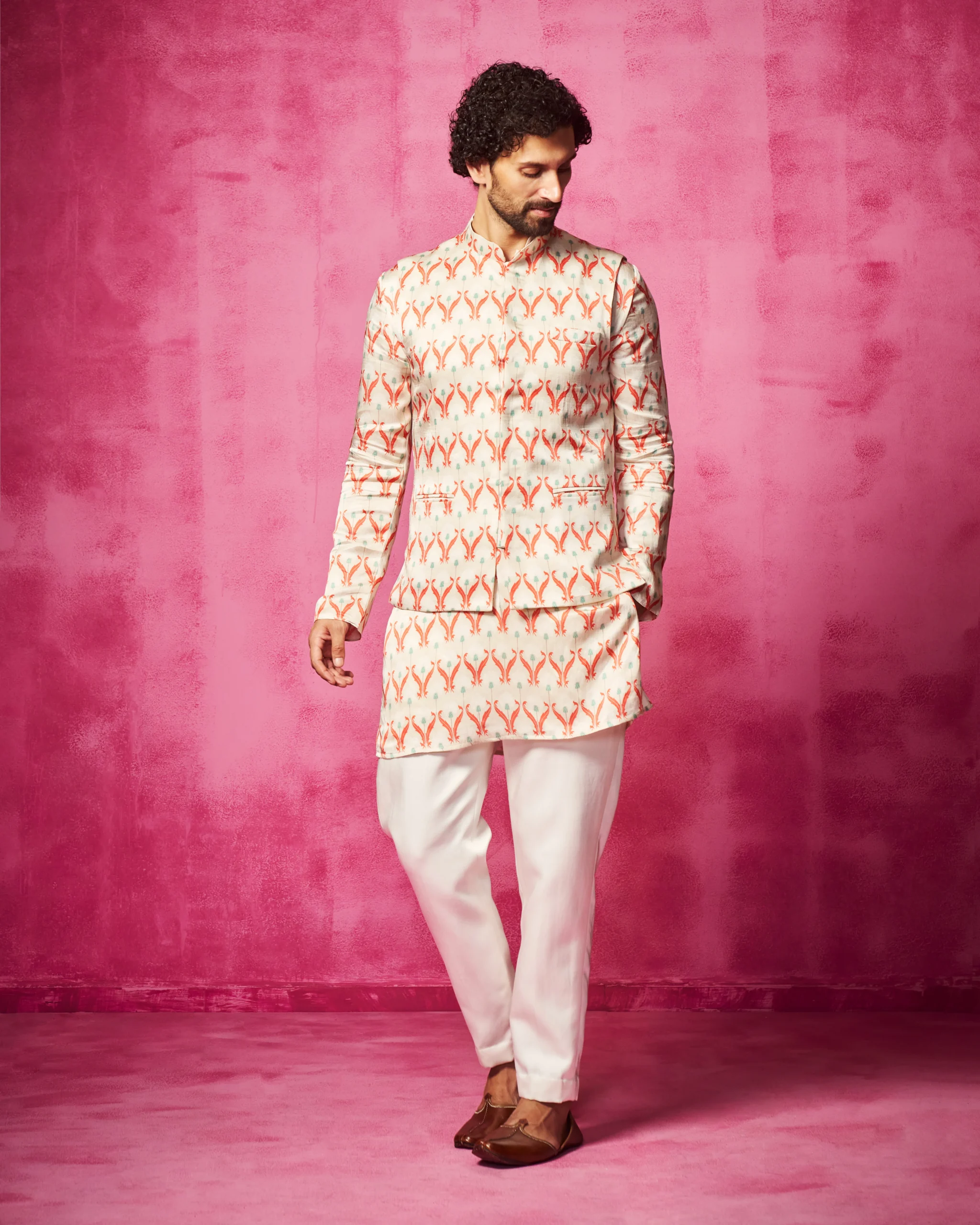 Introducing a printed kurta set crafted in satin linen, paired with a matching waistcoat for a coordinated and stylish look. Teamed with ivory narrow pants, this ensemble blends vibrant print with classic structure, making it a perfect choice for festive occasions, celebrations, and daytime events.