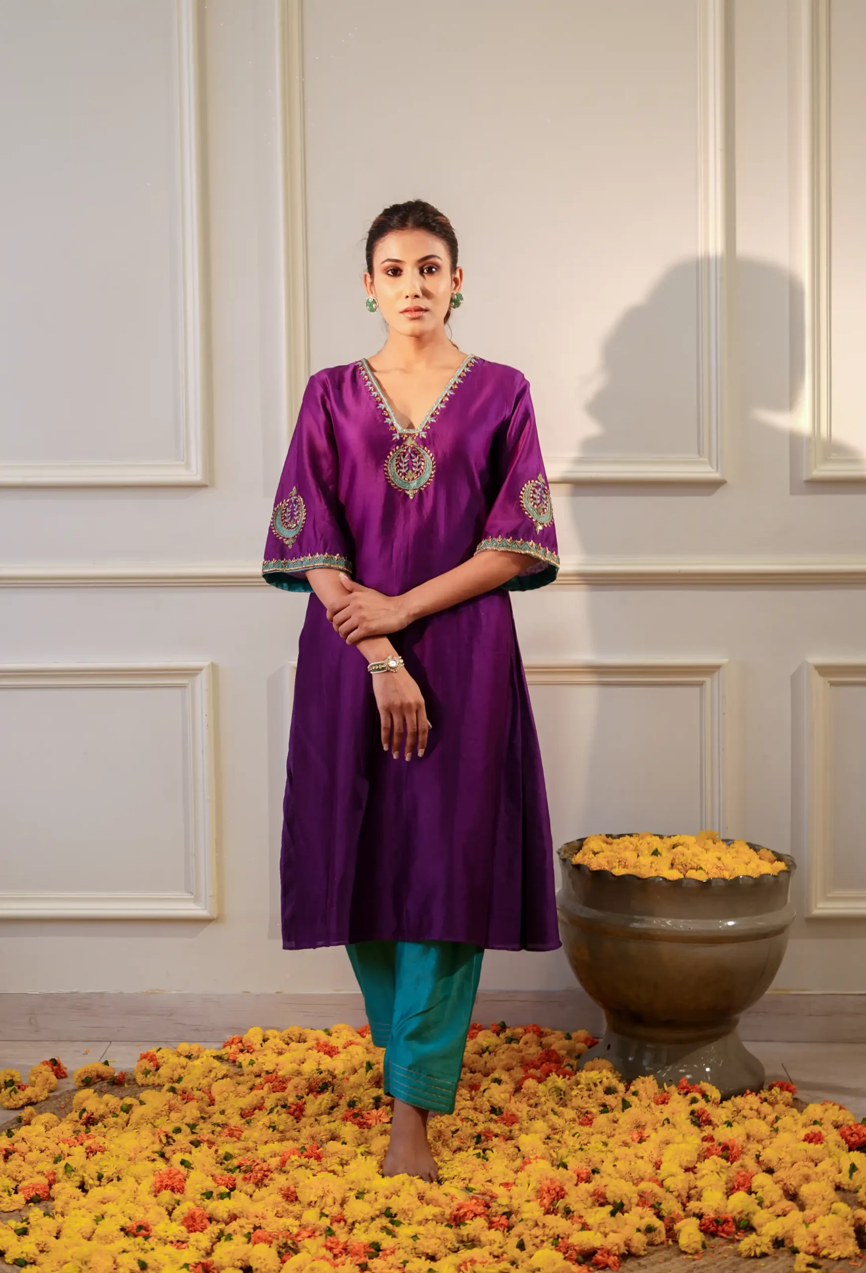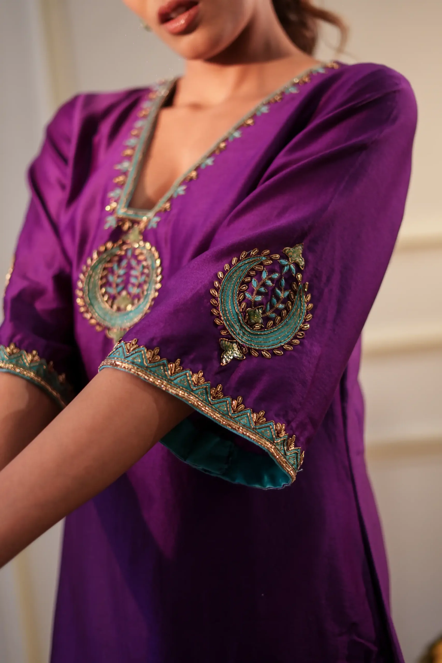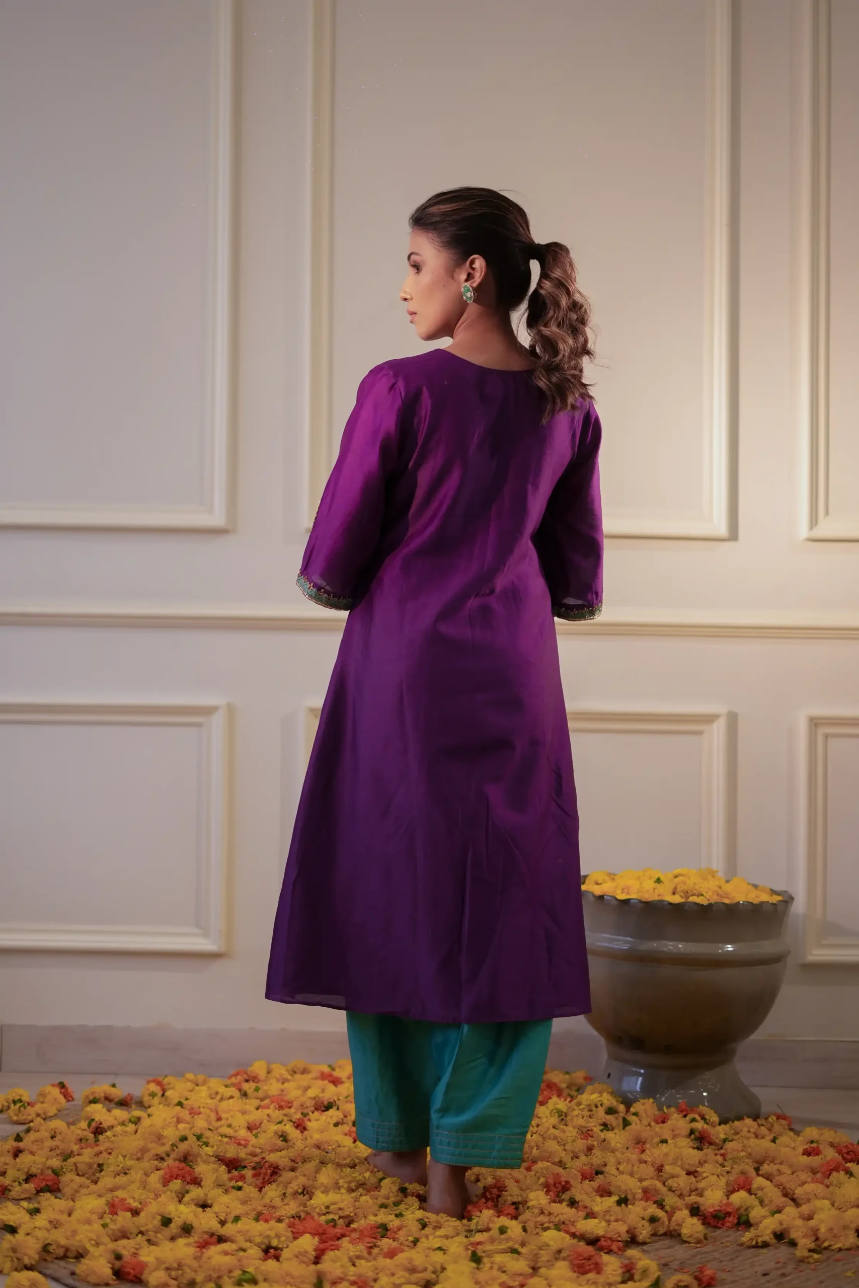 Style this rich purple Chanderi silk kurta set with statement gold or kundan earrings to complement the zardosi detailing. Pair it with traditional juttis or mojaris for a refined festive look. Add a light organza or chiffon dupatta for extra elegance. Keep the makeup warm with a soft glow and bold lips, and finish the look with a sleek bun or soft waves and a metallic clutch for festive occasions and celebrations.