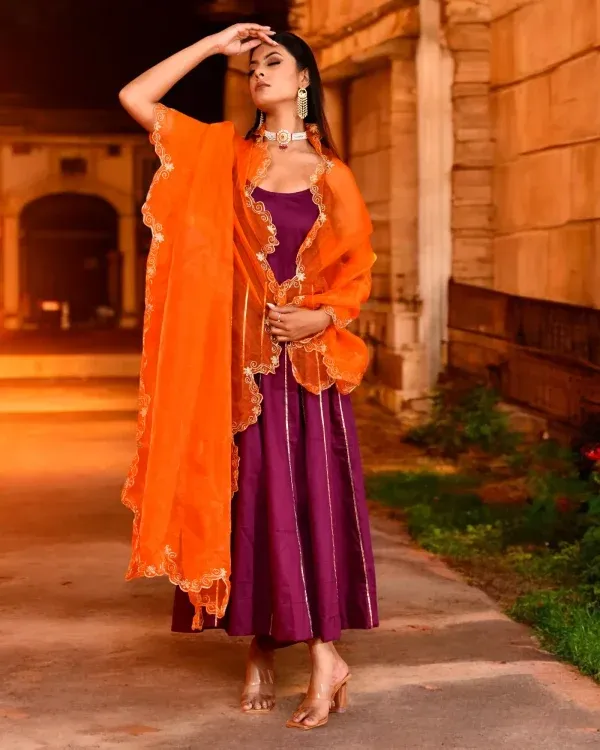Introducing an elegant interplay of rich colour and artisanal detail, this purple cotton silk suit set is crafted for refined festive dressing. The flowing Anarkali kurta in soft cotton silk features delicate gota work detailing, adding subtle shimmer while enhancing its graceful silhouette. Timeless and sophisticated, this ensemble is perfect for festive celebrations and elegant gatherings.