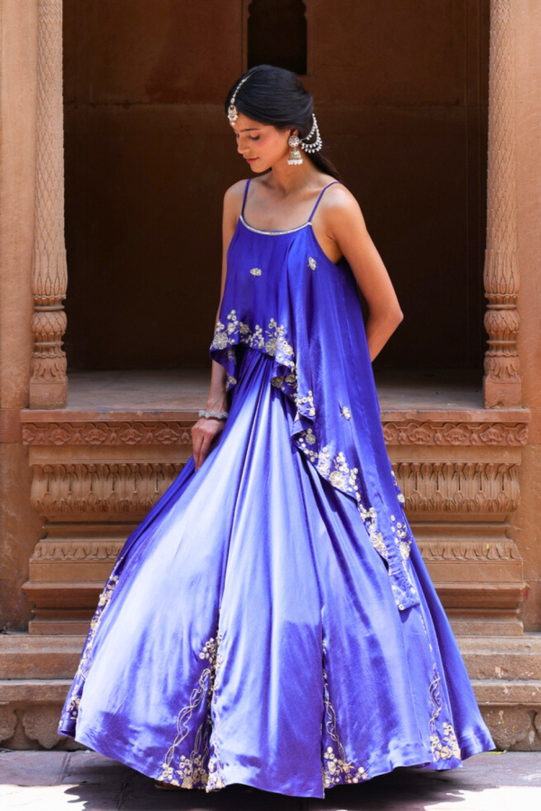 Introducing contemporary glamour with our purple indigo lehenga a vibrant symphony of elegance and artistry. The two-tiered strappy top, intricately adorned with gold floral embroidery and an asymmetrical hem, exudes modern allure. Paired with a fluid, flared skirt detailed with delicate gold embroidery along the border, this ensemble evokes youthful sophistication and timeless couture finesse.