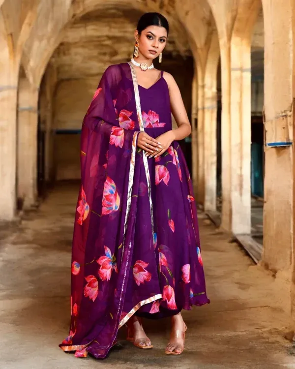Introducing a graceful blend of elegance and fluidity, this purple lotus printed chiffon suit set is crafted for a refined festive statement. The flowing Anarkali kurta in lightweight chiffon features delicate lotus prints that add softness and visual depth to its silhouette. Effortless and elegant, this ensemble is ideal for festive gatherings, celebrations, and sophisticated day occasions.