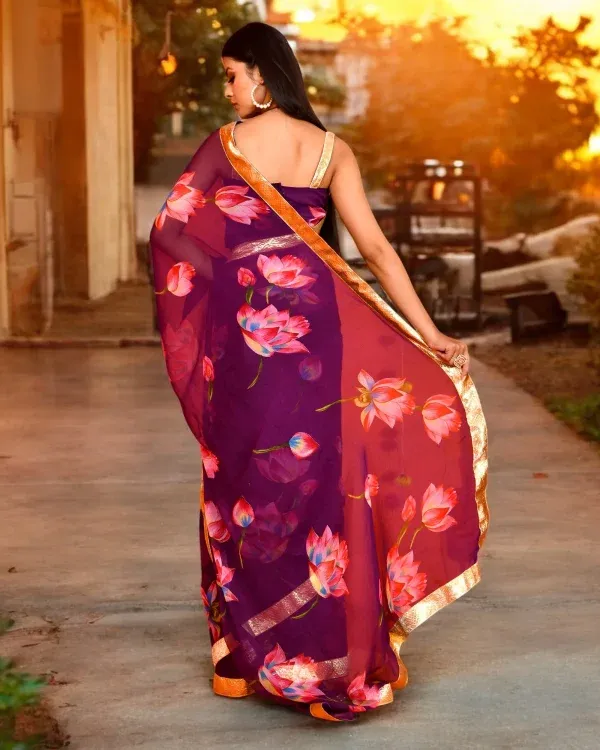 Purple Lotus Printed Chiffon Saree with Gota Detail Blouse