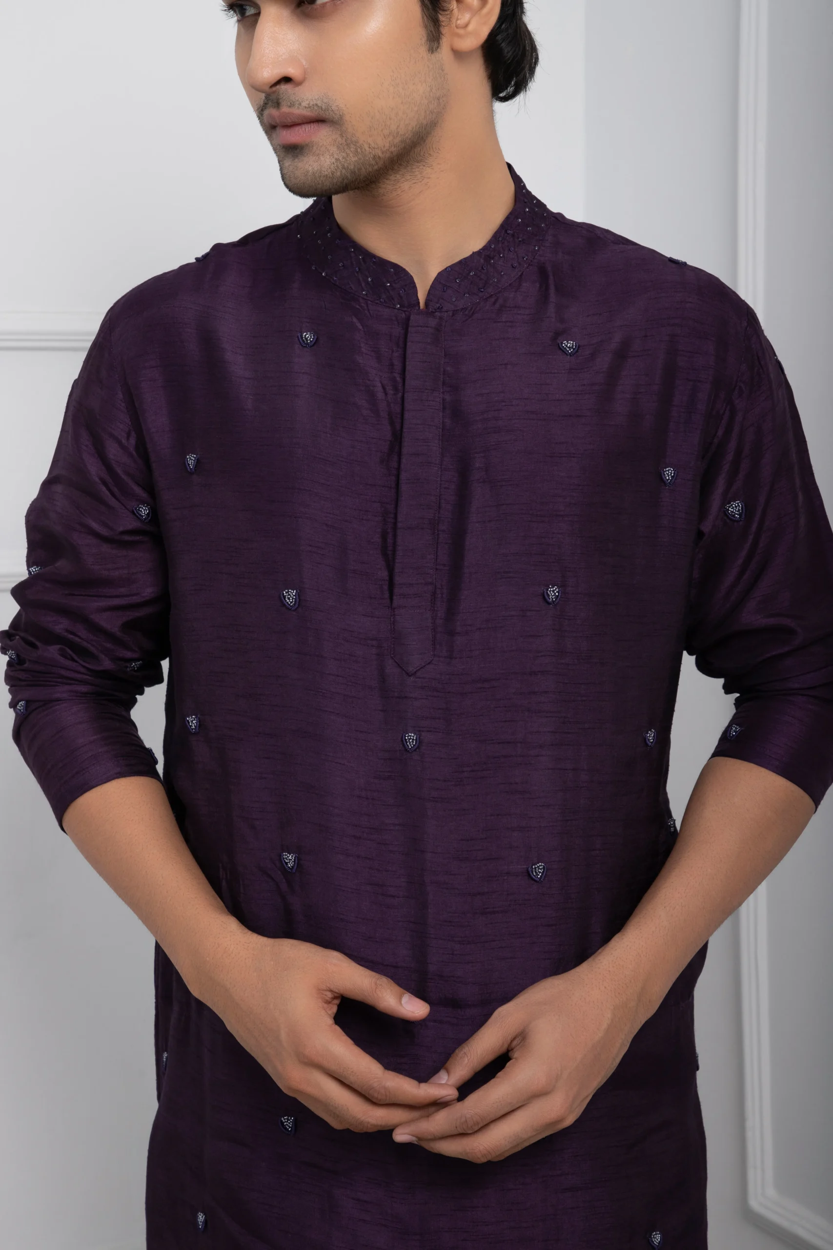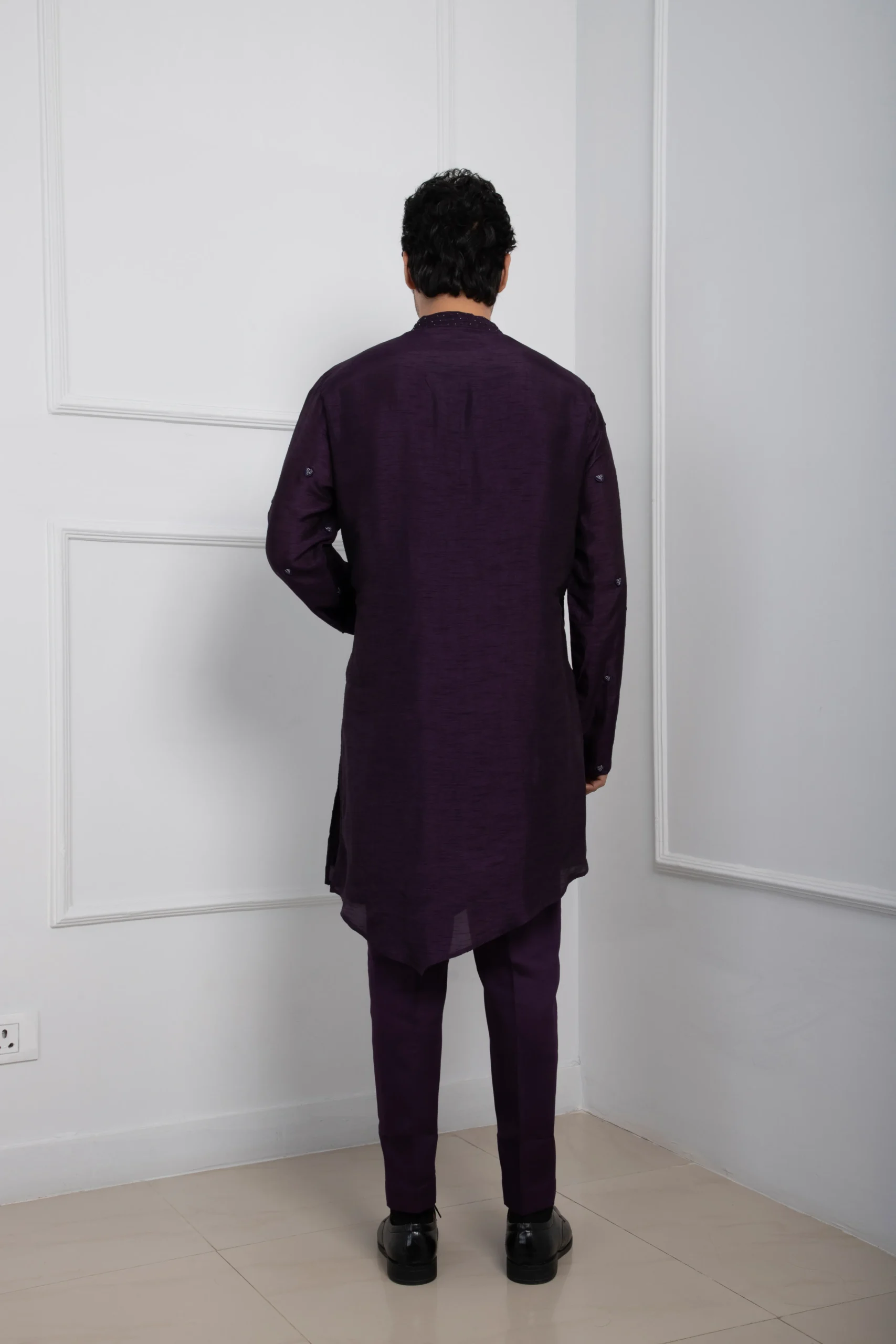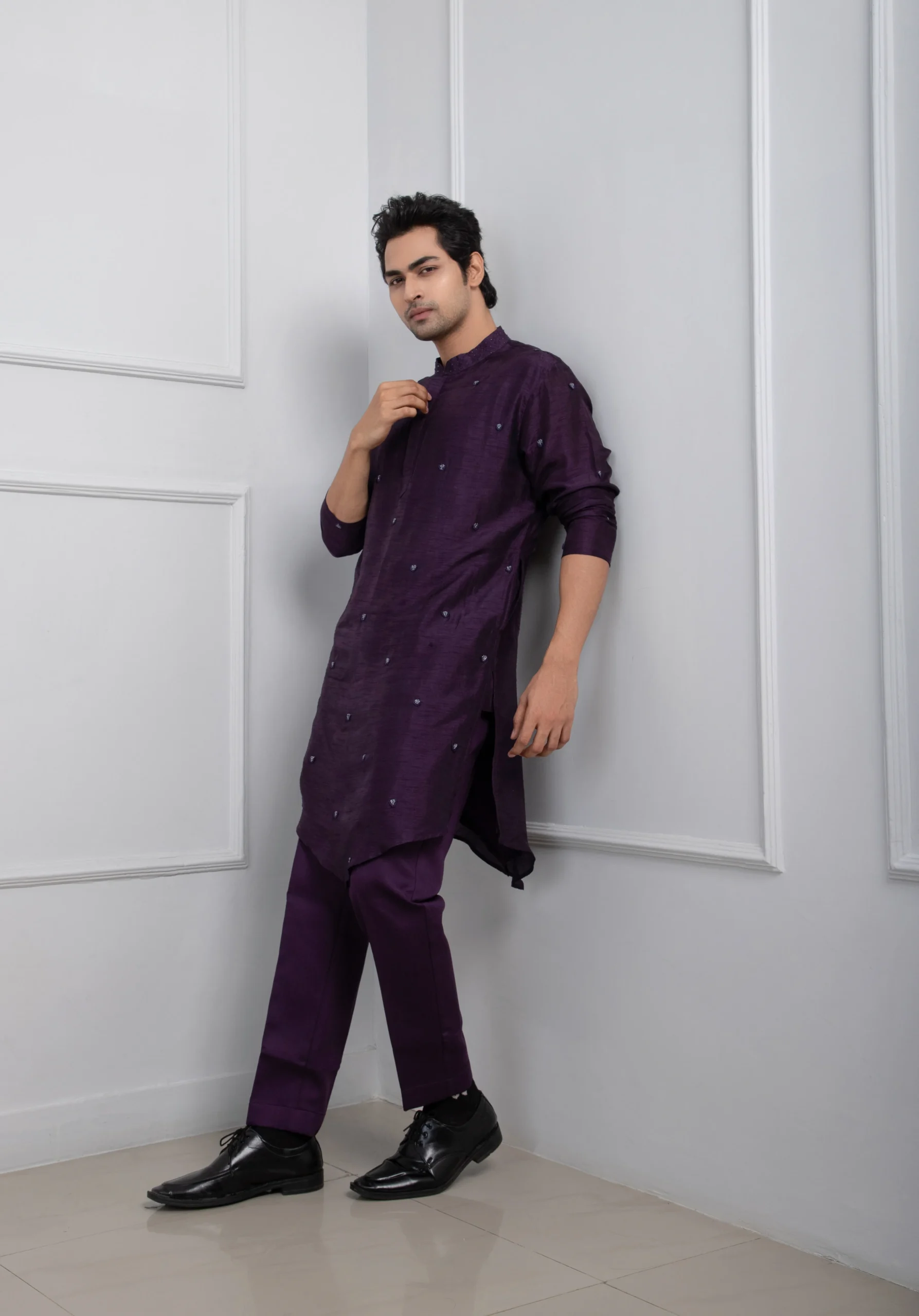 Let the outfit stay mostly monochrome—avoid contrasting layers so the rich color and subtle embellishments stand out. Add a sleek black-metal or leather-strap watch for a modern finish, and keep grooming clean and structured. Perfect for cocktail functions, night weddings, or festive soirées where understated elegance makes the statement. ?