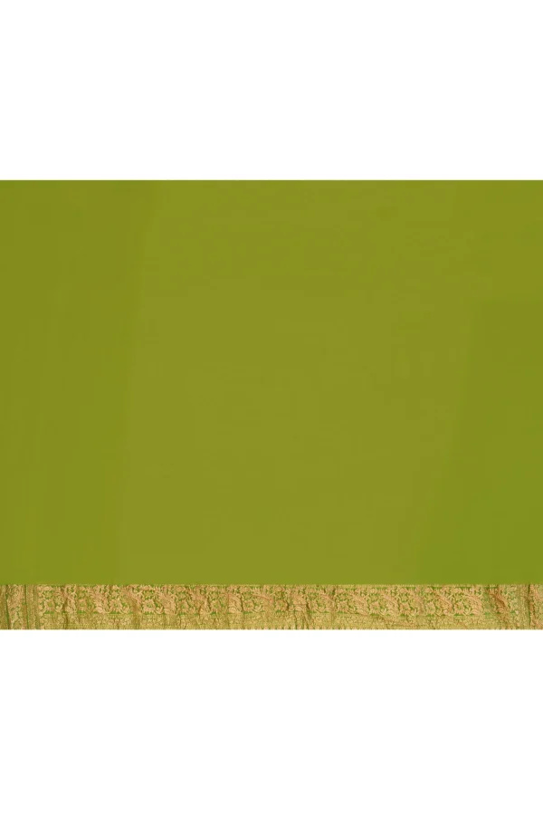 Introducing a regal purple saree adorned with traditional gold zari jaal buta work all over the body. Enhanced with a striking parrot green contrast border and pallu featuring rich gold metallic thread work, this elegant drape comes with a matching running blouse piece—ideal for festive and wedding wear.
